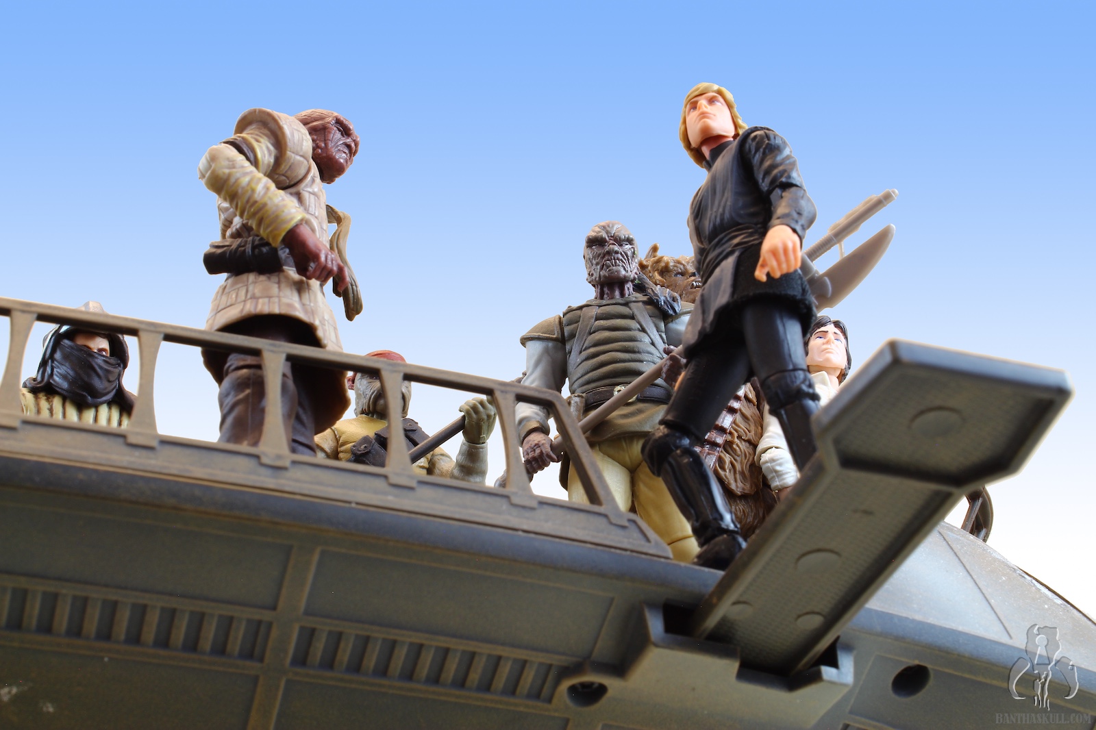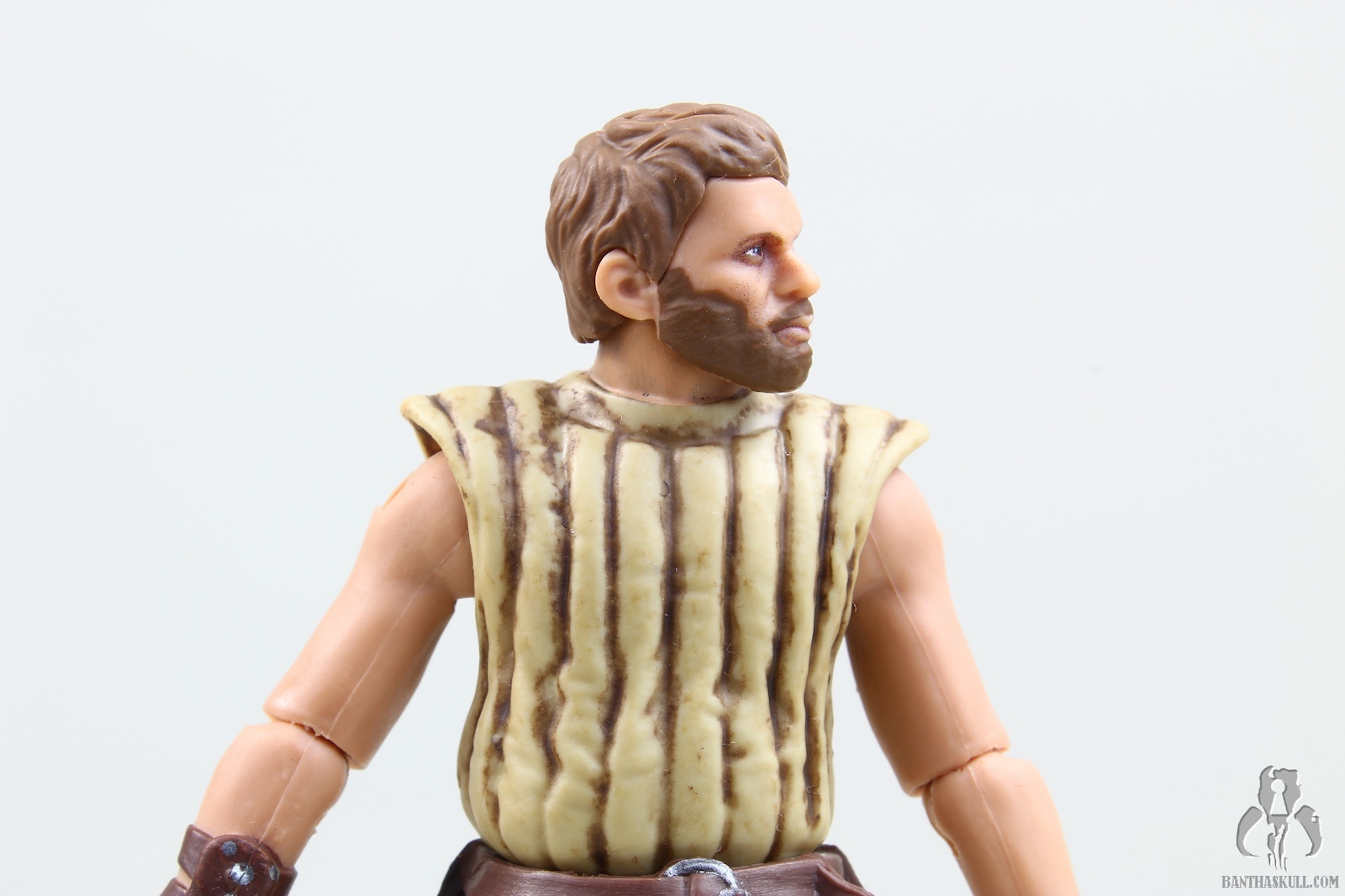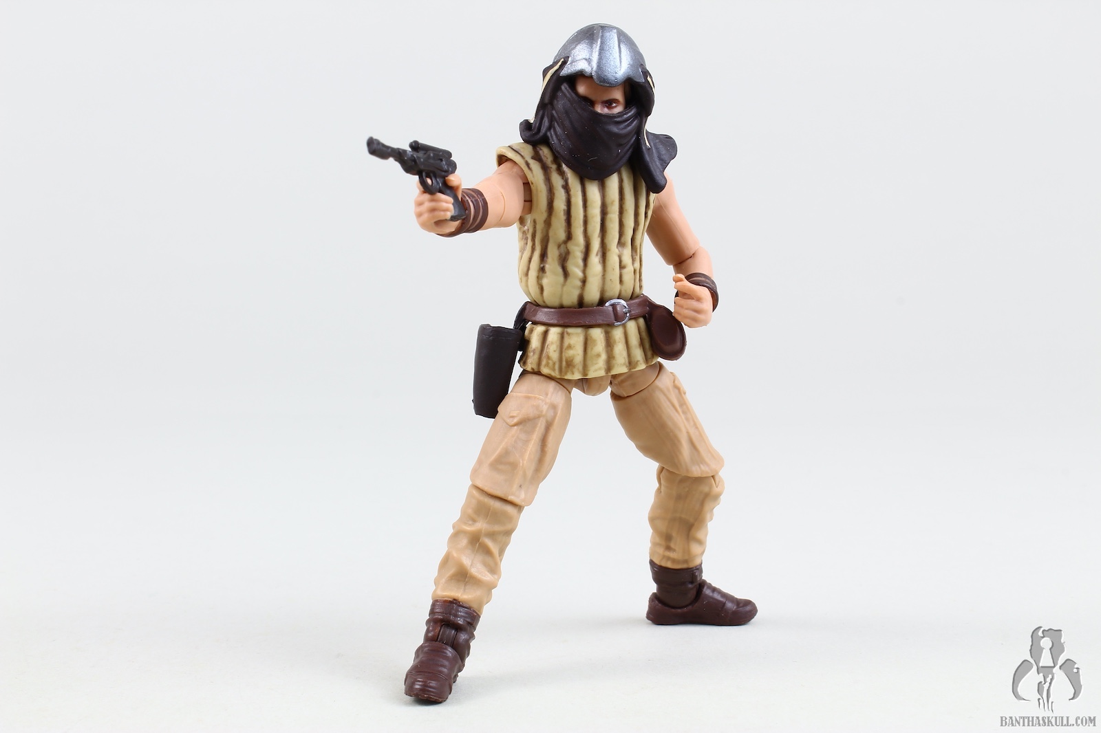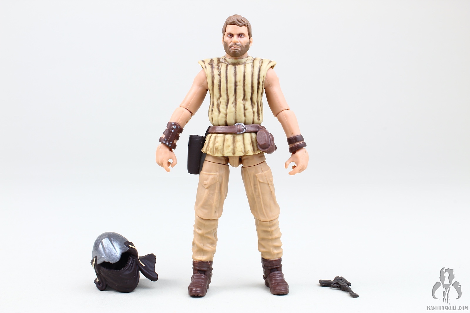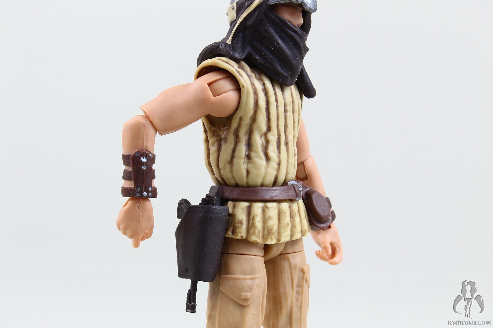 The figure is tremendous (as are both Tessek and Dren-garen). He’s a kitbash, with a few new parts, notably the chest, head, and arms (I believe). While the upper legs are from the Cassian Ferrix trench-coat figure (like Dren-garen), I can’t quite place the lower legs/feet which are from a different figure (unlike Dren-garen). However, just like the other two partial tools in the set, this just feels brand new. Hasbro really didn’t cut corners, even accounting for the reused parts. Velken is fully articulated with all the modern points. You can pose Velken in almost any way you like. And while he mostly just stands there, he does pop into an action stance (complete with a pair of bended elbows) for a blink of an eye before falling overboard, and you can faithfully recreate this moment due to his modern articulation. He has an outstanding paint job, with some nice depth created for the leathery padded jack he wears. The helmet/scarf combo reveals Velken’s eyes, and is removable. The head underneath is exceptionally well done. Unlike Taym, played by stuntman/actor Larry Holt who has many images on the internet, it seems Velken was uncredited, and I can find no good photos of the unmasked actor. Either Hasbro had access to some archived imagery from the Lucasfilm vaults, or they just made up the face (or sculpted it to resemble some employee). Velken has a standard skiff guard blaster which fits nicely in his holster, and can be firmly gripped in hand. The details are great, and this is one of the better figures Hasbro has made.