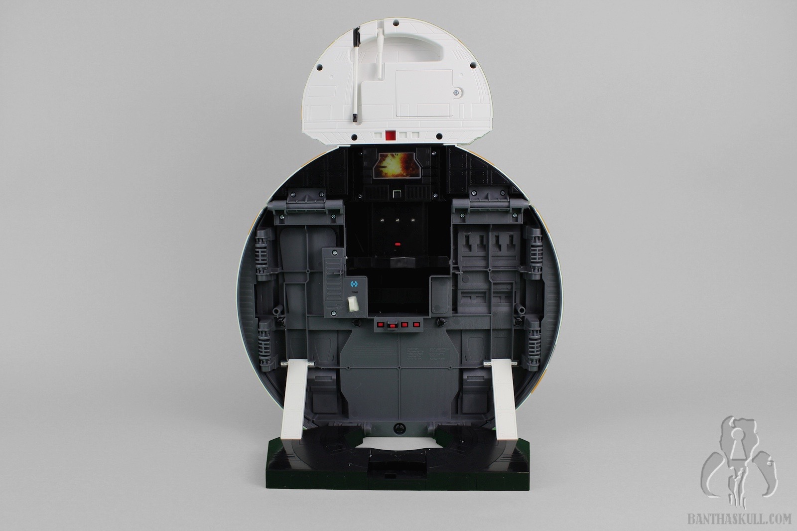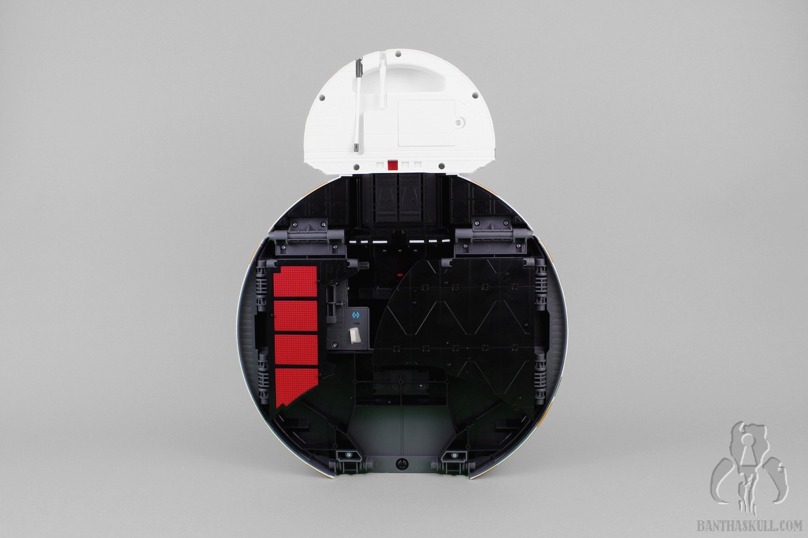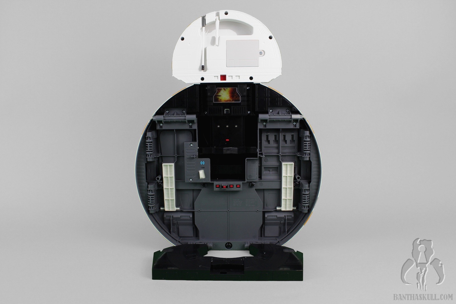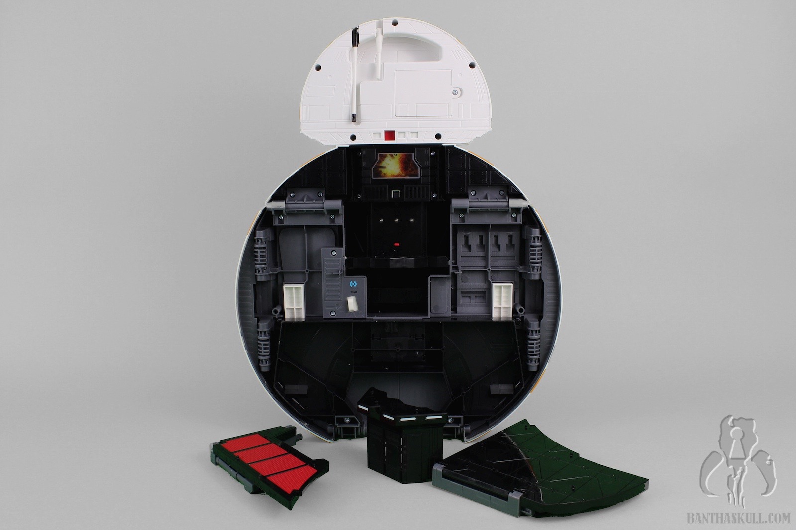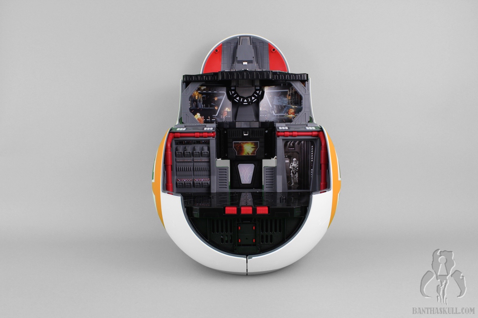 We move on to the transforming capability. First you have a big BB-8. He’s got only a front “half”, but that means he fits well against a wall somewhere. There is a well-masked button on his dome that activates his light up eye, while he blurts out several different strings of beeps and whistles. I estimate about 6-8 different ones, but I couldnt be sure, as I don’t speak his language. So this really is a giant Transformer. In fact, the company that holds the rights to The Transformers should consider litigation against Hasbro for…what? Hasbro makes those too? Well, okay then. I have to admit that my first time completing the steps to transform BB-8 into the playset was pretty fun. I wasn’t into Transformers, so I don’t really have a frame of reference, but it was reasonably challenging without being frustrating. Kids will probably have a good time racing the clock to transform this from BB-8 to the playset and then back again. I did it in about 15 seconds. I took video to prove it, but then my dog ate it. She’s so damn cute! Anyway, it does transform nicely, and all the parts stow away neatly.