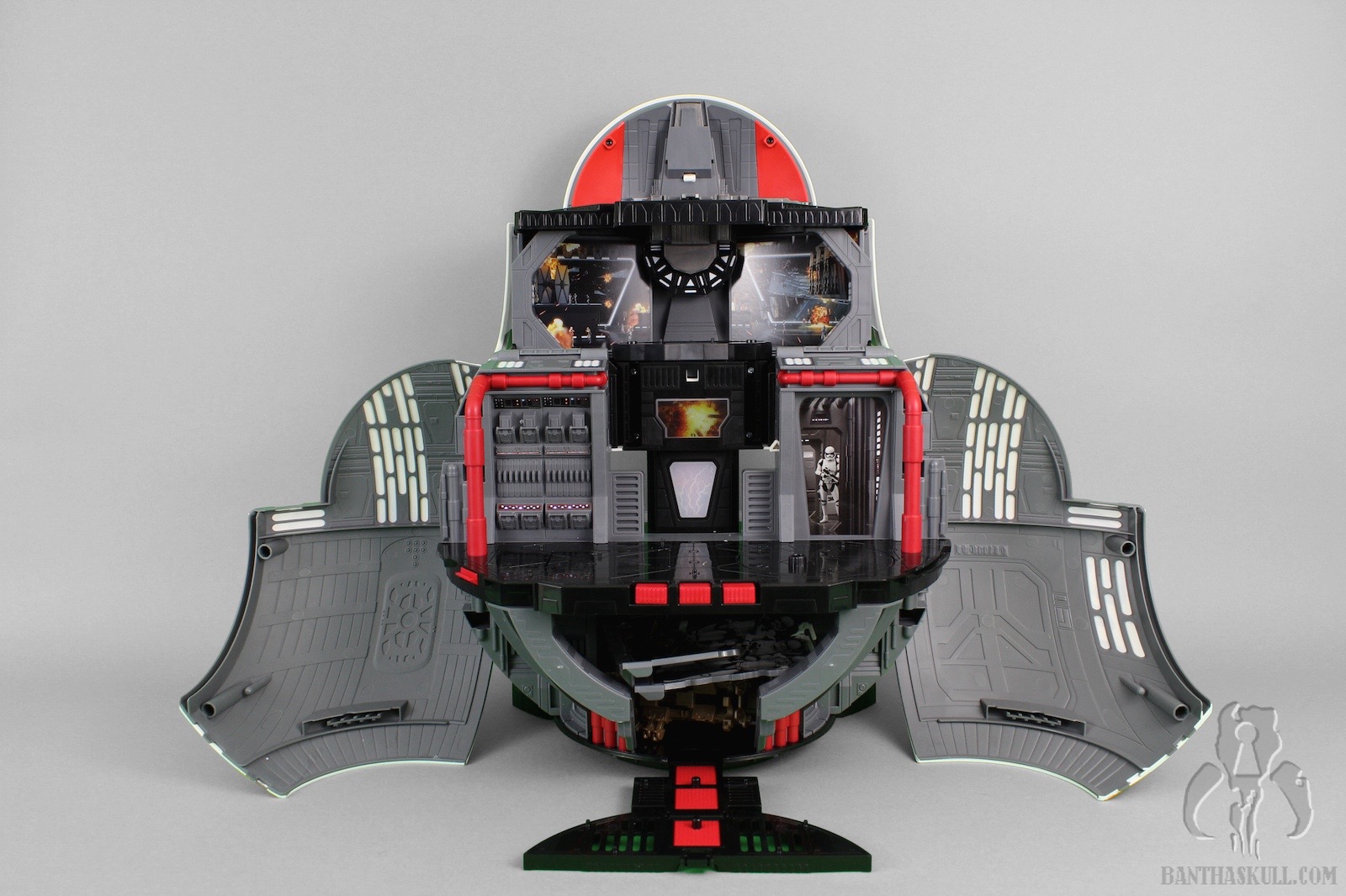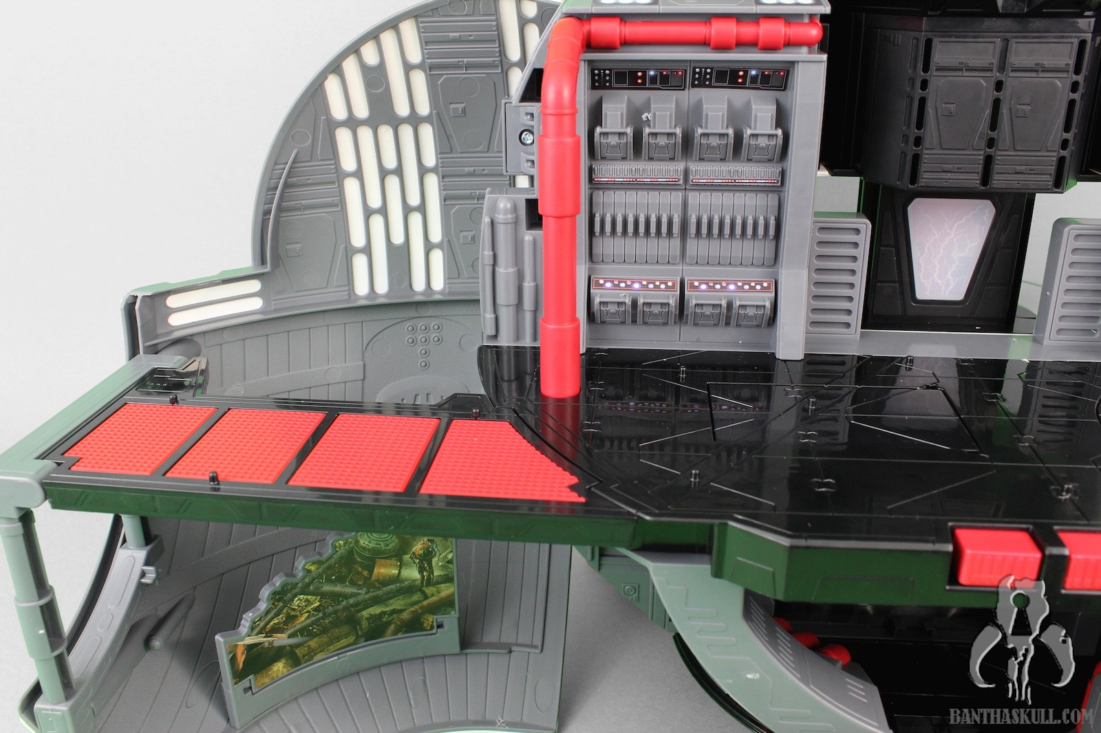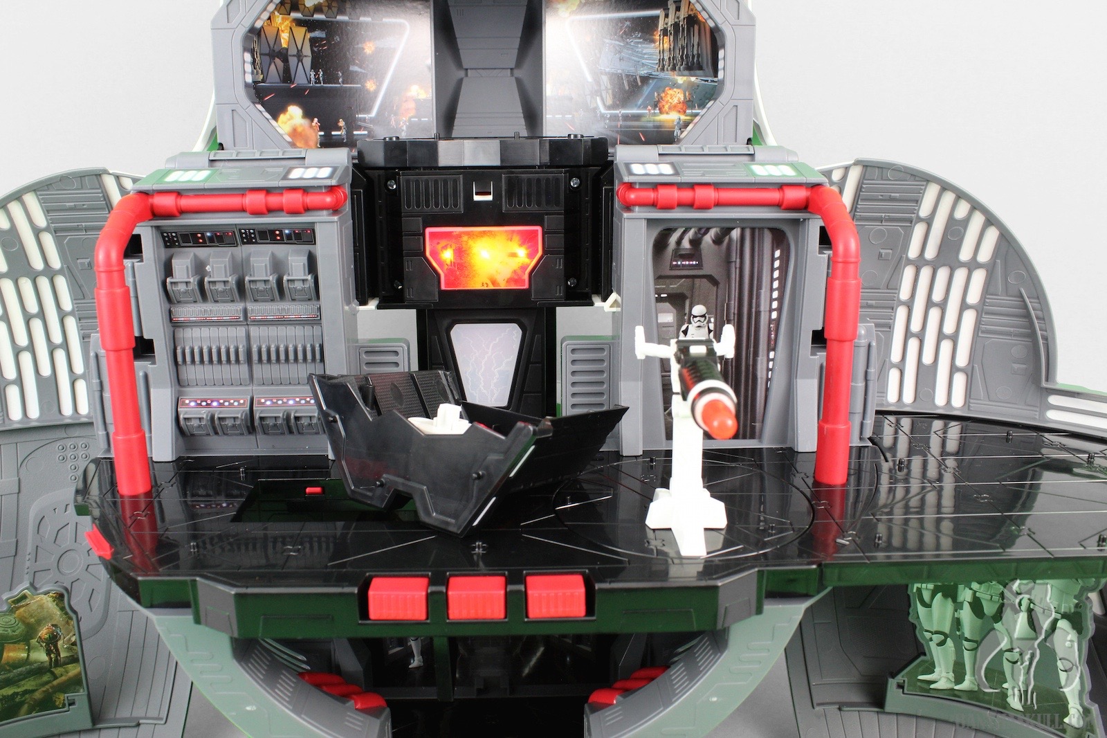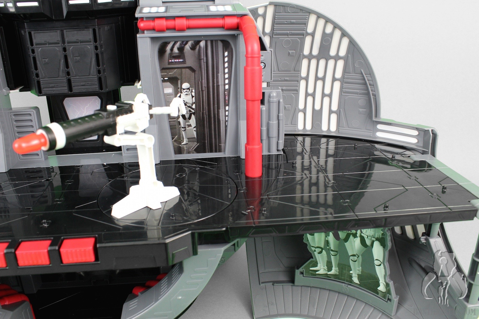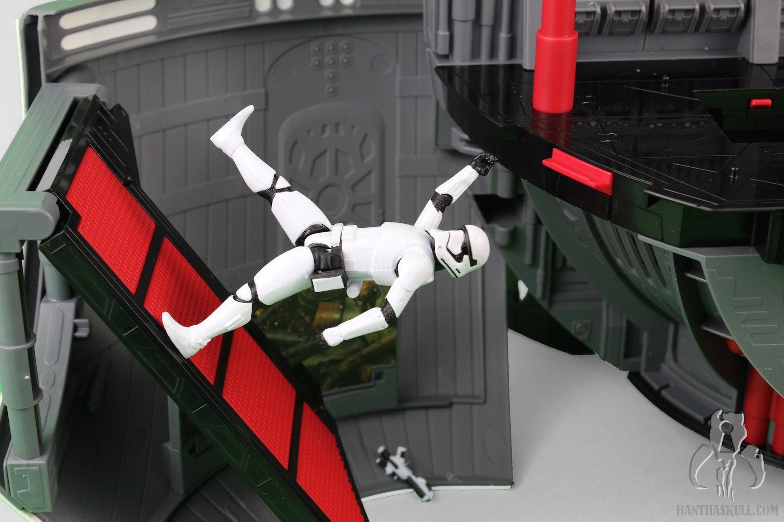 The second floor has a bunch of action features. The left side has a collapsible catwalk for figures that are not too sexy for the trash compactor below. When activated with the button, sounds accompany the falling catwalk. In the center, we have a lot going on. A button triggers a trap door, with sound. A swivel cannon fires a spring-loaded projectile. I’m not a good judge of distance, but it had to travel at least 50-60 feet. Turning the cannon’s platform to its 90 degree limits creates firing sounds. A quick note that the box images and manual text indicate the cannon can swivel 180 degrees, but mine stopped at 90. I didn’t push it for fear of breaking it. Another button will cause an explosion on the central “hangar” (that’s what it’s called in the instruction manual), and jettisons a large piece revealing some fiery lights and explosive sounds. You can also trigger alarms. The right side has no features, but it is a large enough platform to hold several stormtroopers.