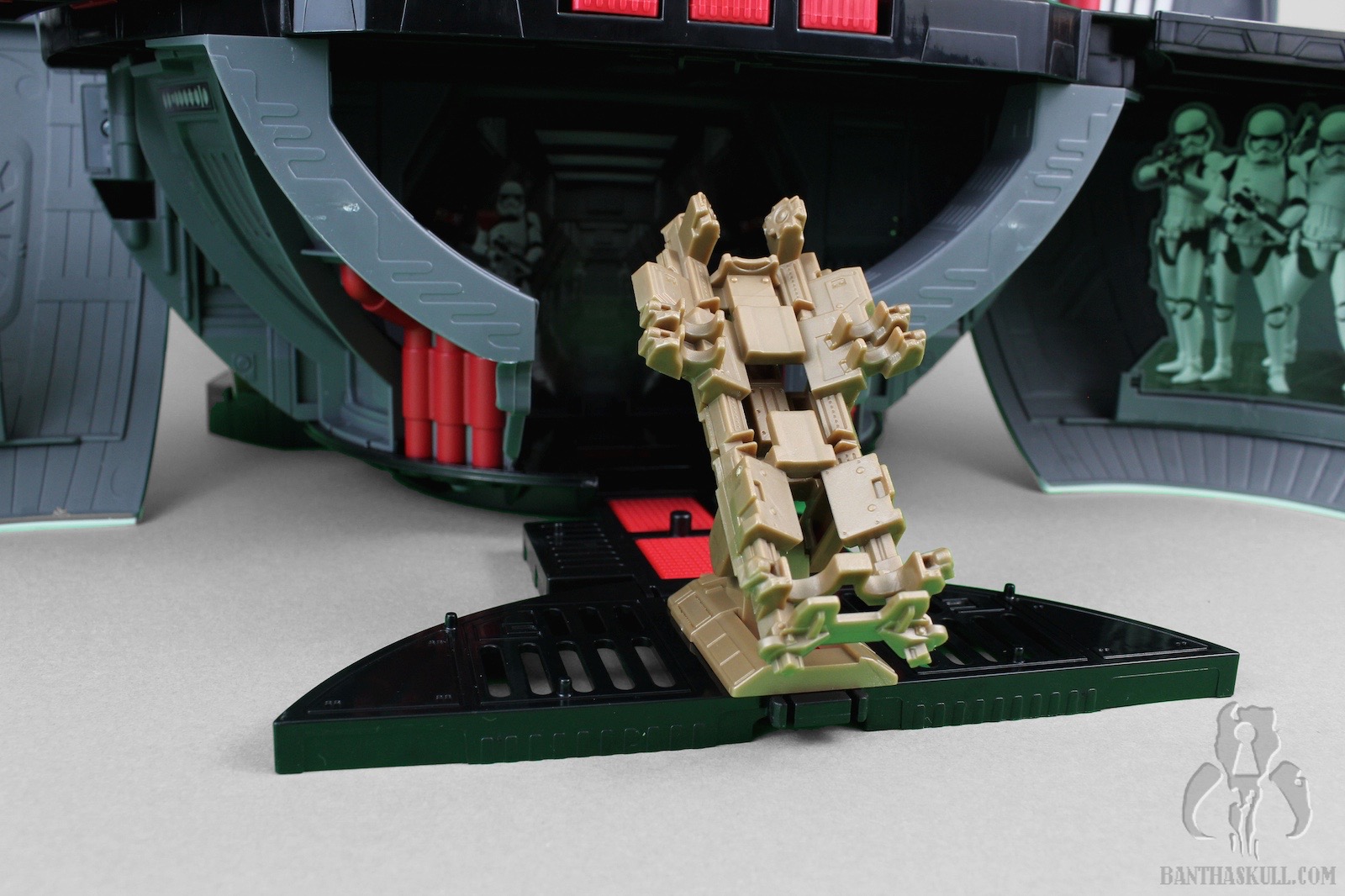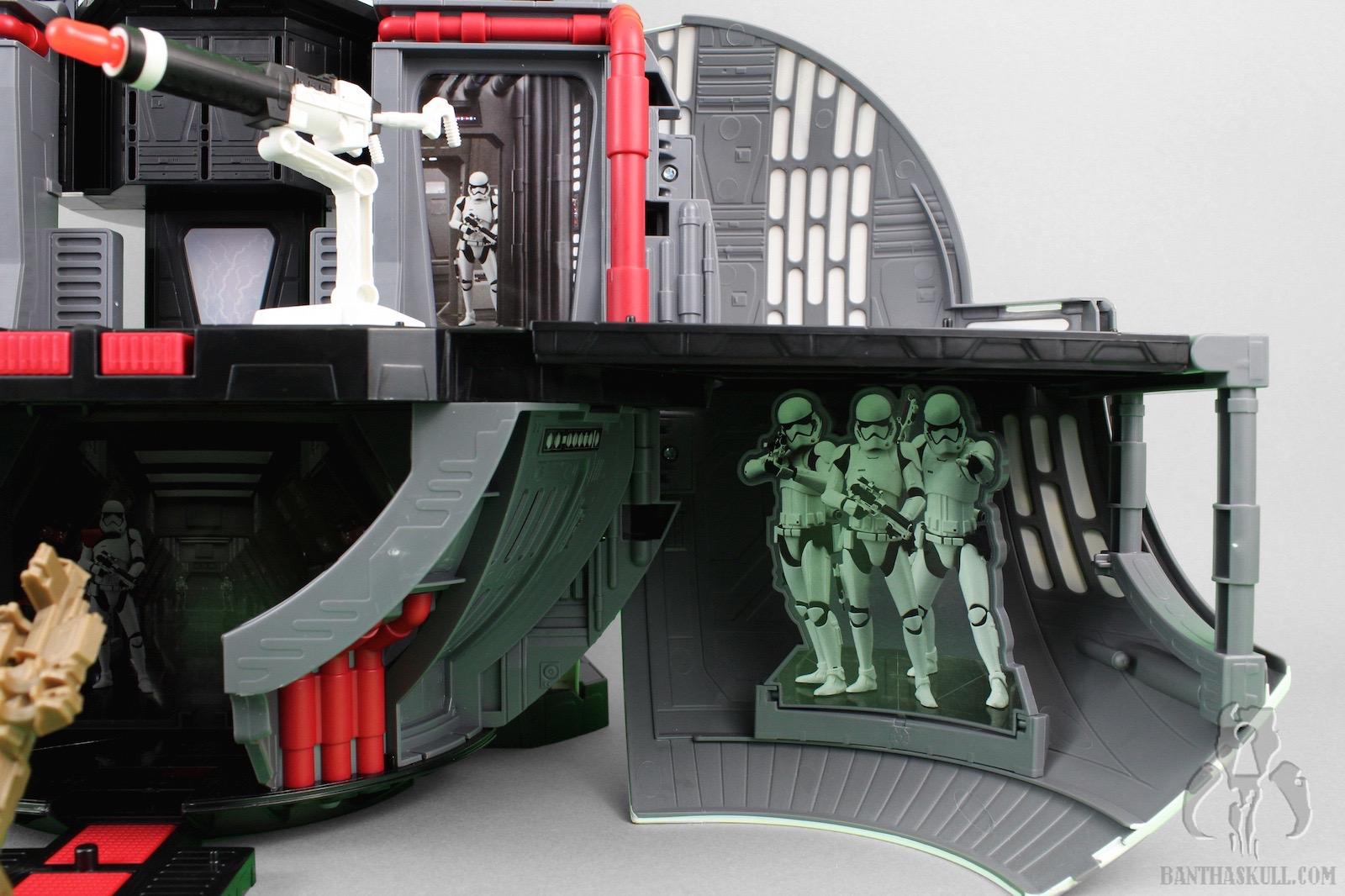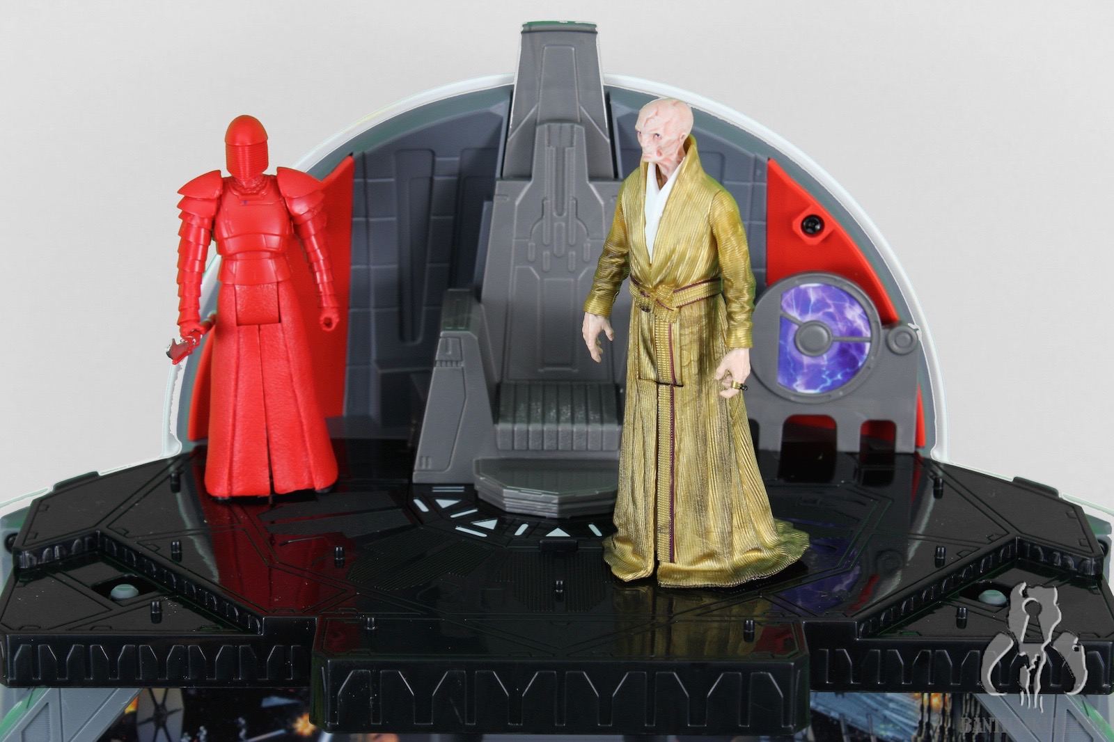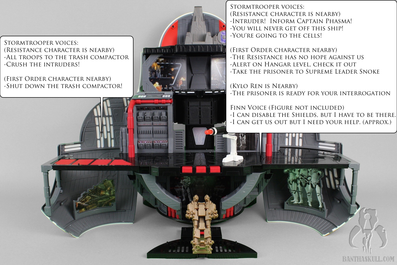 Now that we’ve had the opportunity to watch The Last Jedi, it’s more clear that this set is actually a mashup of 3 different locations spanning both sequel films. The prison cell / interrogation rack could be from the Finalizer, where Kylo Ren tortured and imprisoned Poe Dameron, before he escaped with the help of Finn. It could also double as the interrogation room on Starkiller Base that Ren used to interrogate Rey. The trash compactor fits most closely with the off-screen dumping of Phasma on Starkiller Base (although some of the sounds are reminiscent of the Death Star scene). The throne room is obviously on board Snoke’s flagship, Supremacy. The hangar section, as well as the hallway next to it, could essentially be any of the three locations. So the toy itself spans both movies, allowing for extended and creative play or display value.