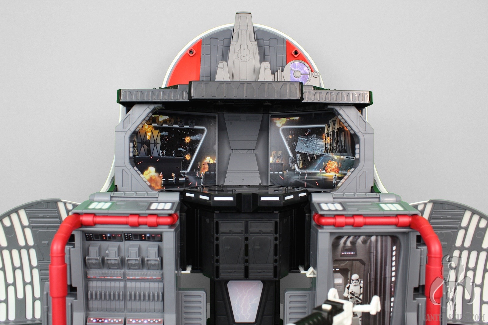 The third floor is the throne room. Via Force Link, you get some battle sounds as well as a Snoke quote. There is space for several figures, and Snoke can sit on the throne, albeit awkwardly since he doesn’t have knees. There’s a strange circular “window” or display next to the throne. Again, we’ll have to wait until TLJ to see what kind of sorcery is behind it.