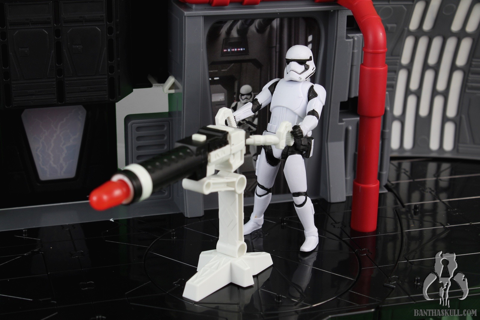 Once the playset is deployed, you have a large, interactive play area. The first “floor” has three distinct areas. There is a garbage room, which makes sounds via Force Link activation. The garbage sticker image has a dianoga on it, which may or may not be from the sequels. It could be our favorite compactor from the Death Star, or where Phasma was tossed on Starkiller Base, or from something yet to be seen in TLJ. There are no moving parts here, so it falls woefully short of the Kenner trash compactor. Sliding over to the middle, we have a detention cell lockup, which can hold a couple of prisoners, and can also then fold down to serve as a platform for an interrogation chair. This could be from Starkiller Base or still possibly from TLJ. To the right, we have a bunch of cutout troopers, which also interact with the Force Link Activator to play alarms and troopers talking.