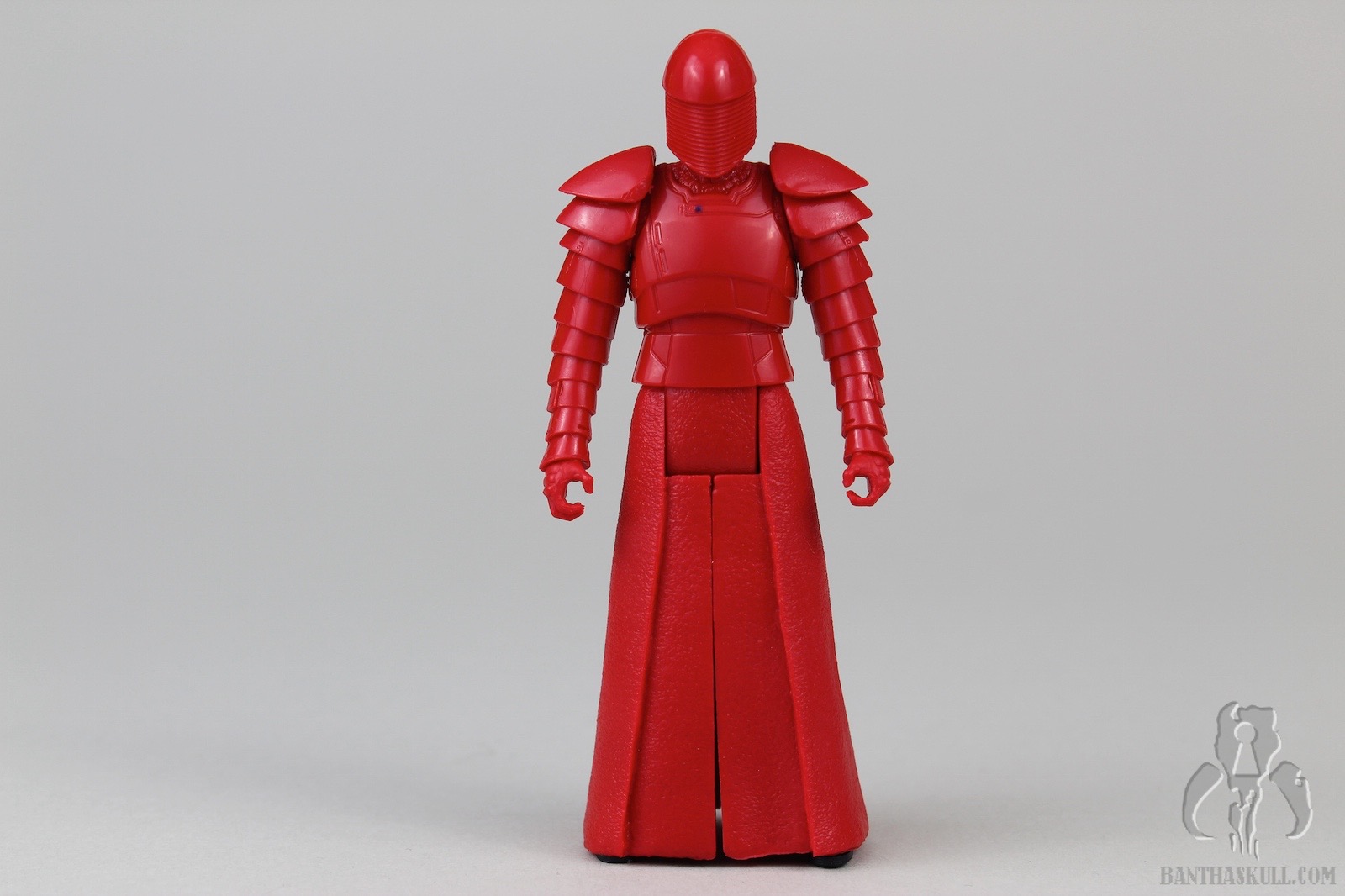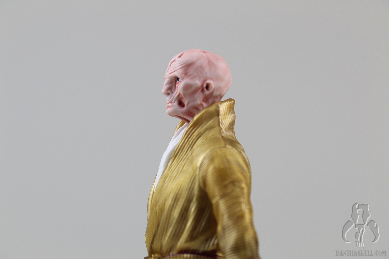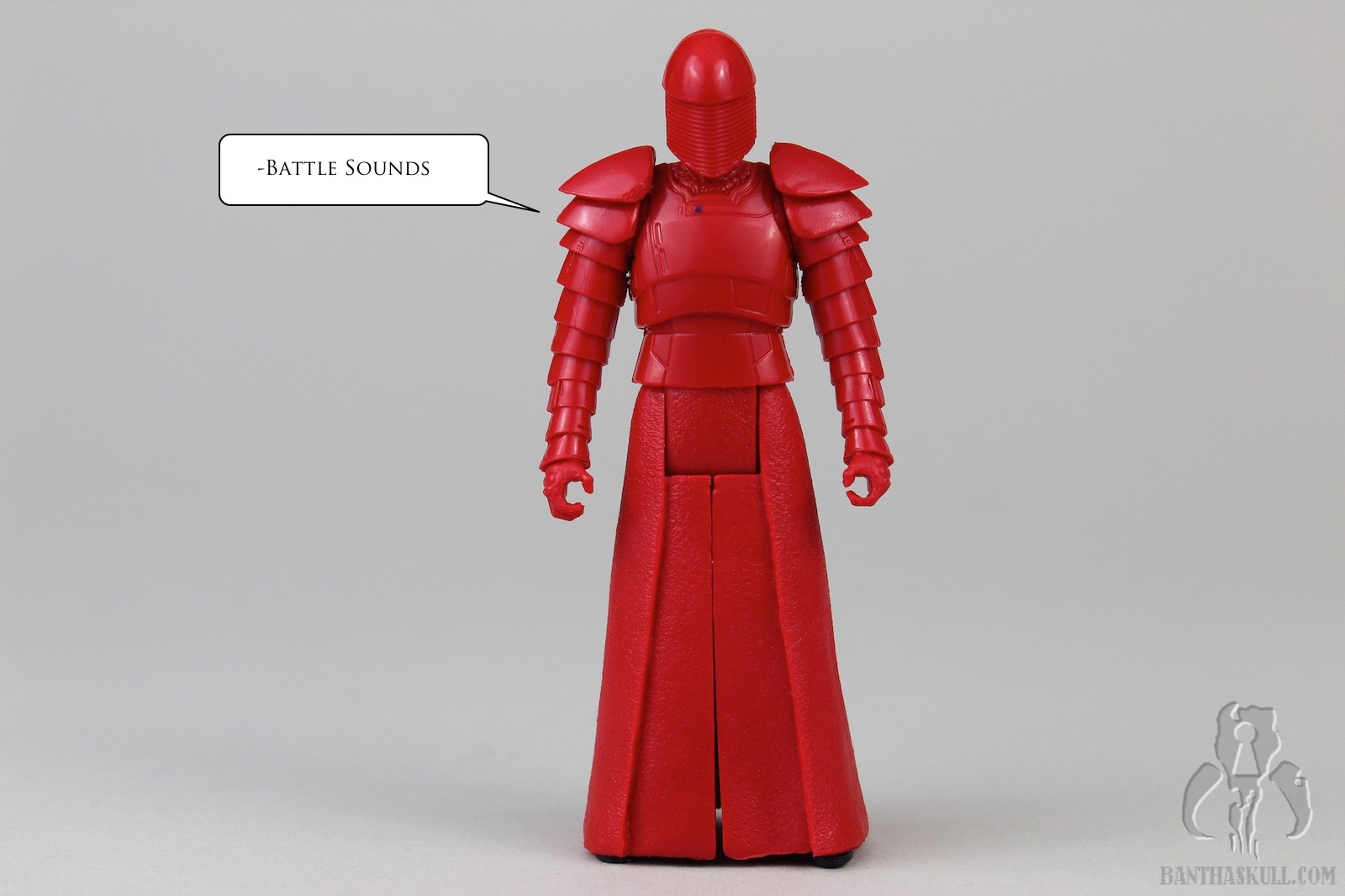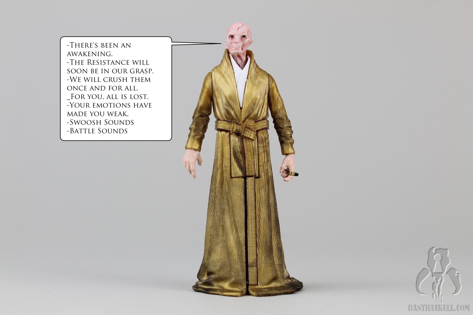 The set comes with 2 5POA figures. One of 2 types of Praetorian guards currently available at launch, with the other being in the Rey 2-pack. The figure looks pretty good, stands with sturdiness, and holds his weapon tightly. It has a ball jointed head, but otherwise, has limited poseability. Force Link reveals fighting sounds. Snoke is very tall. The face sculpt is pretty impressive. Again, the 5POA limits the figure’s usefulness, and it gets low marks because he looks ridiculous sitting on his throne. Maybe he needs an ottoman. One thing that stands out is his huge black ring. We’ll see what that’s all about soon enough. The Activator reveals many phrases and sounds.