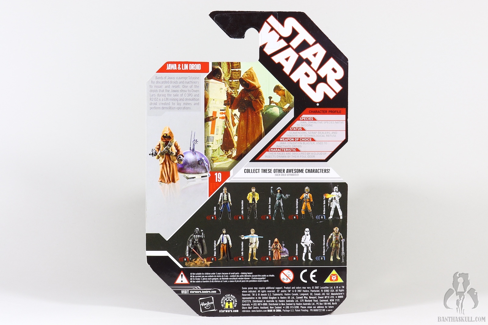 The Thirtieth Anniversary Collection (TAC) of 2007 was one of the best lines for collectors. Besides what may be regarded as the coming of age of super articulated figures, the character selection was outstanding, the card shape and artwork were always striking (if not classic), the value was great, and the included coins were highly collectible. In this particular case, we got an all new Jawa, with an all new look, and an all new droid as a two-pack, instead of a second jawa, as had been tradition.