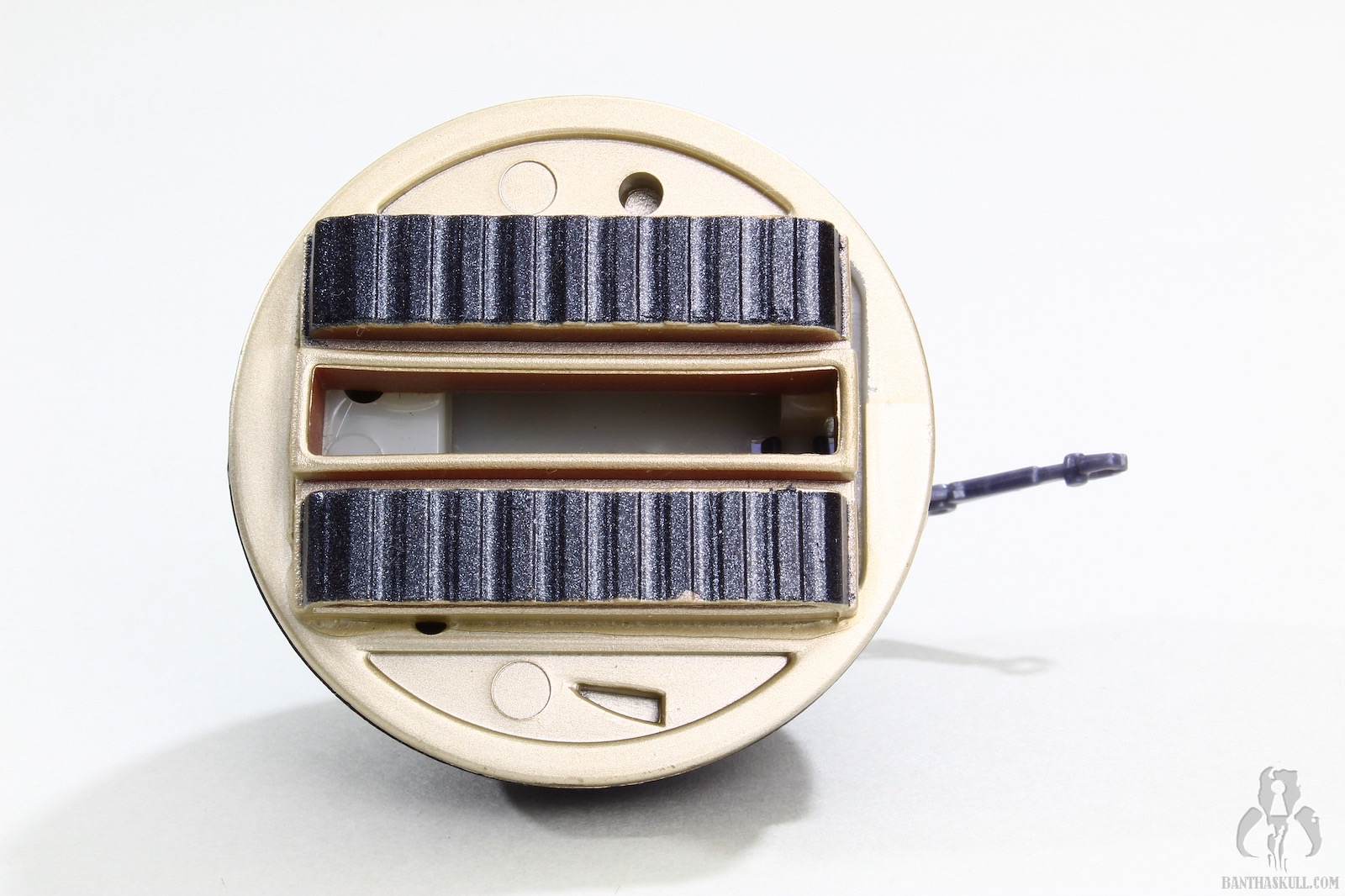 This jawa has a really nice sculpt, with the plastic robes having nice textures and folds. You can see the head wrappings under the hood, although, of course, there’s no real evidence of what these little guys actually look like. The eyes are bright painted, and look nice coming out of the darkness of the “face.” The upper arms are super articulated, and the figure also has a swivel waist and a ball jointed head (which is greatly restricted by the sculpt.). The lower body has no articulation, and has the effect of a salt shaker approach, but the legs are sculpted separately from the robes. For added depth, this jawa comes with a light colored vest. At first sight when the figure was revealed, I thought this was ridiculous, but sure enough some of the Jawas are wearing vests. I don’t wear vests myself, but this little guy rocks it. The double bandolier and holster is removable, should you be inclined to try. As with many of my figures, I wasn’t really interested in forcing it off the figure for fear of breakage, but it can be removed if you want. The bandolier has two working holsters. The one on the left side holds a small blaster, which the Jawa can grip tightly in either hand. But more interestingly, he also comes with a tiny droid caller, which fits snugly in its little holster, as well as the jawa’s hands. It is the first time this accessory has ever been offered. It’s great, just be careful not to lose it. It goes well with TLC’s BD29 R2-D2, the one with the restraining bolt.