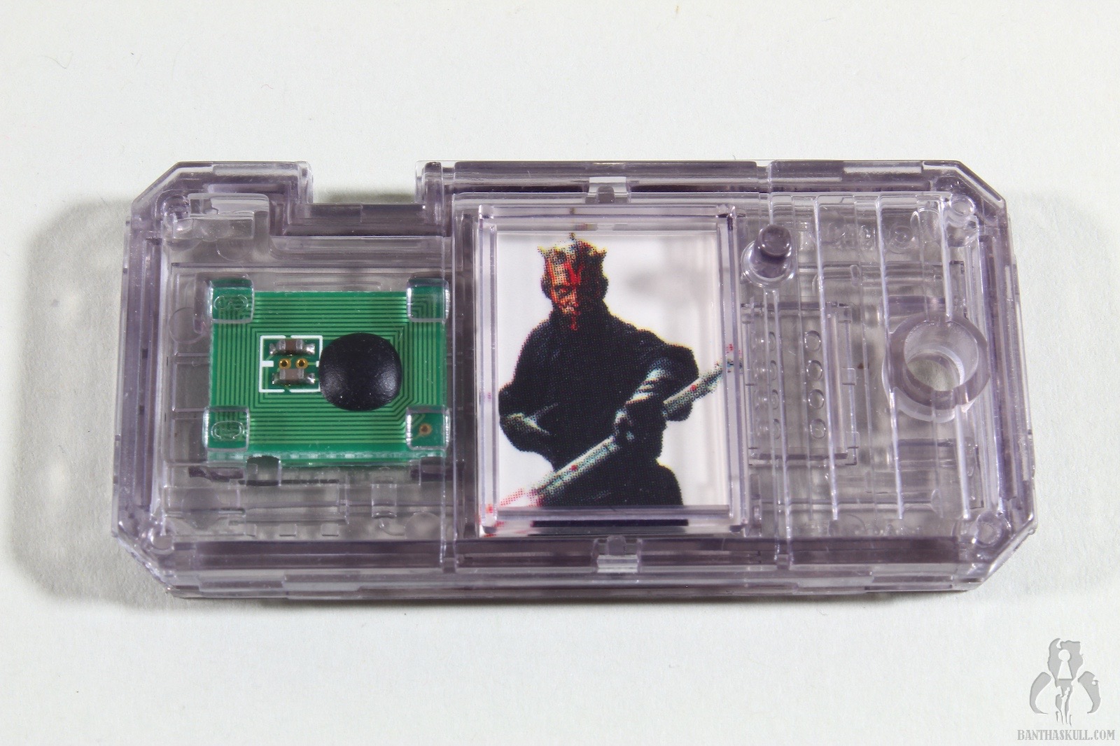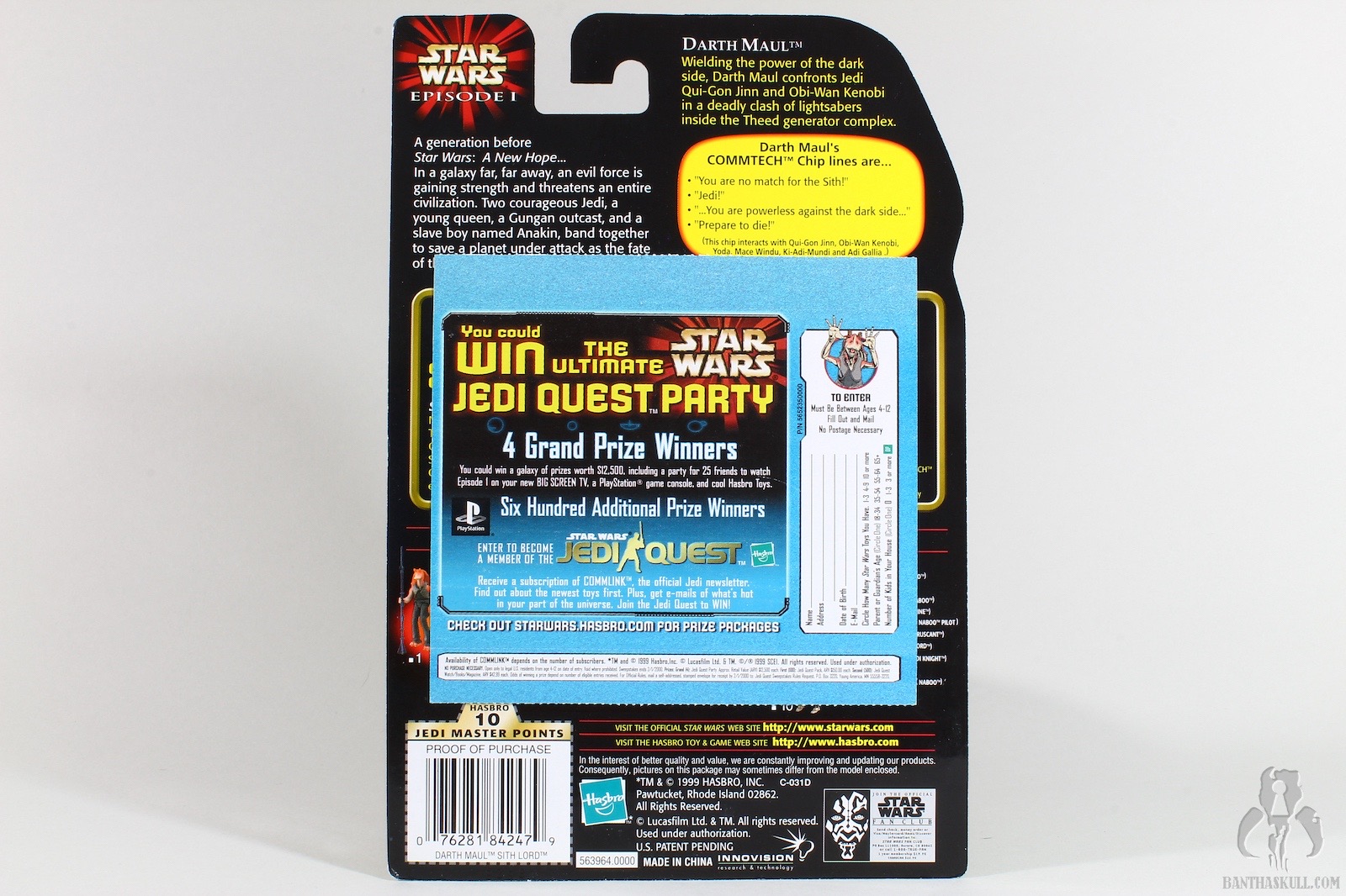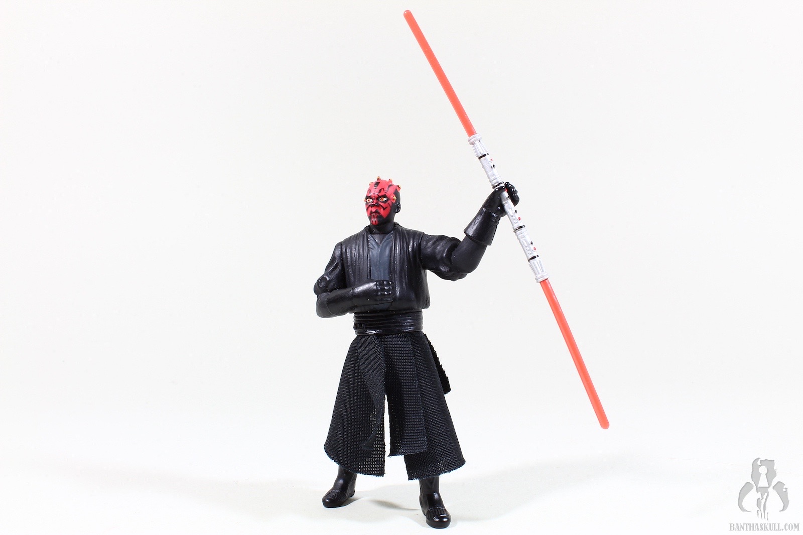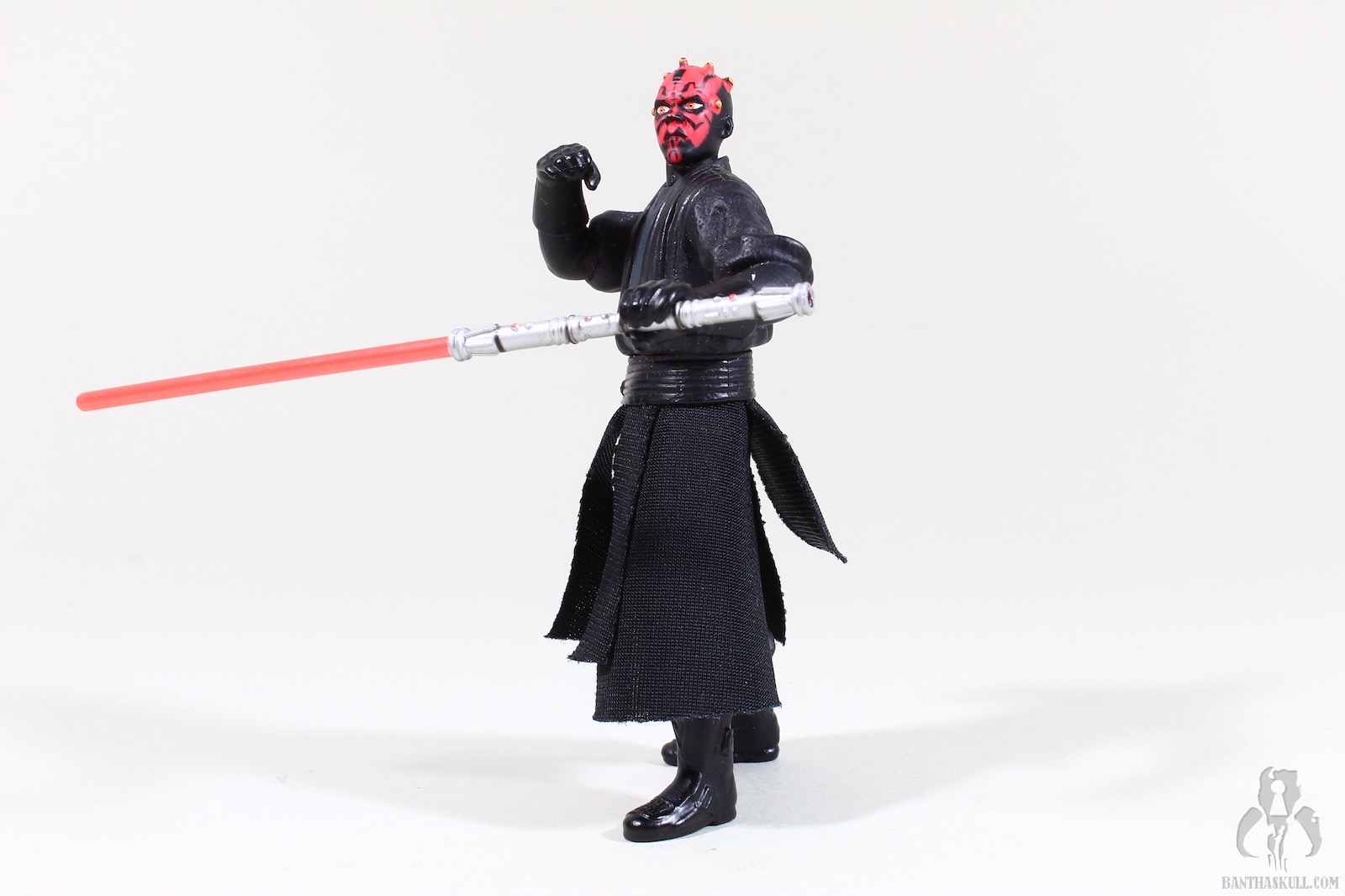 And so it ends where it began. We started our Month of Menace with a review of Darth Maul (Jedi Duel). That figure started my collecting hobby, so it was particularly meaningful to me. Hasbro released approximately 372 different Darth Maul figures during the run of the Episode I line, including 3 in the basic line (Jedi Duel, Tatooine, Sith Lord), and others from a cinema scene, Sith Speeder vehicle, Invasion Force off-screen Sith Speeder, Sith Speeder Handheld Electronic Game, Holograph, Deluxe (with the lightsaber handle that activated fighting action features), a two-pack (bisected) with Obi-Wan, and that “trophy series” one off (because it was such a poor seller, they never released any more). Thatsalotta Darth Mauls. I only wanted the first one to put on my desk, and here I am, thousands of figures later, a real chump. So now the circle is complete, as we finish the month with a look at Darth Maul (Sith Lord).