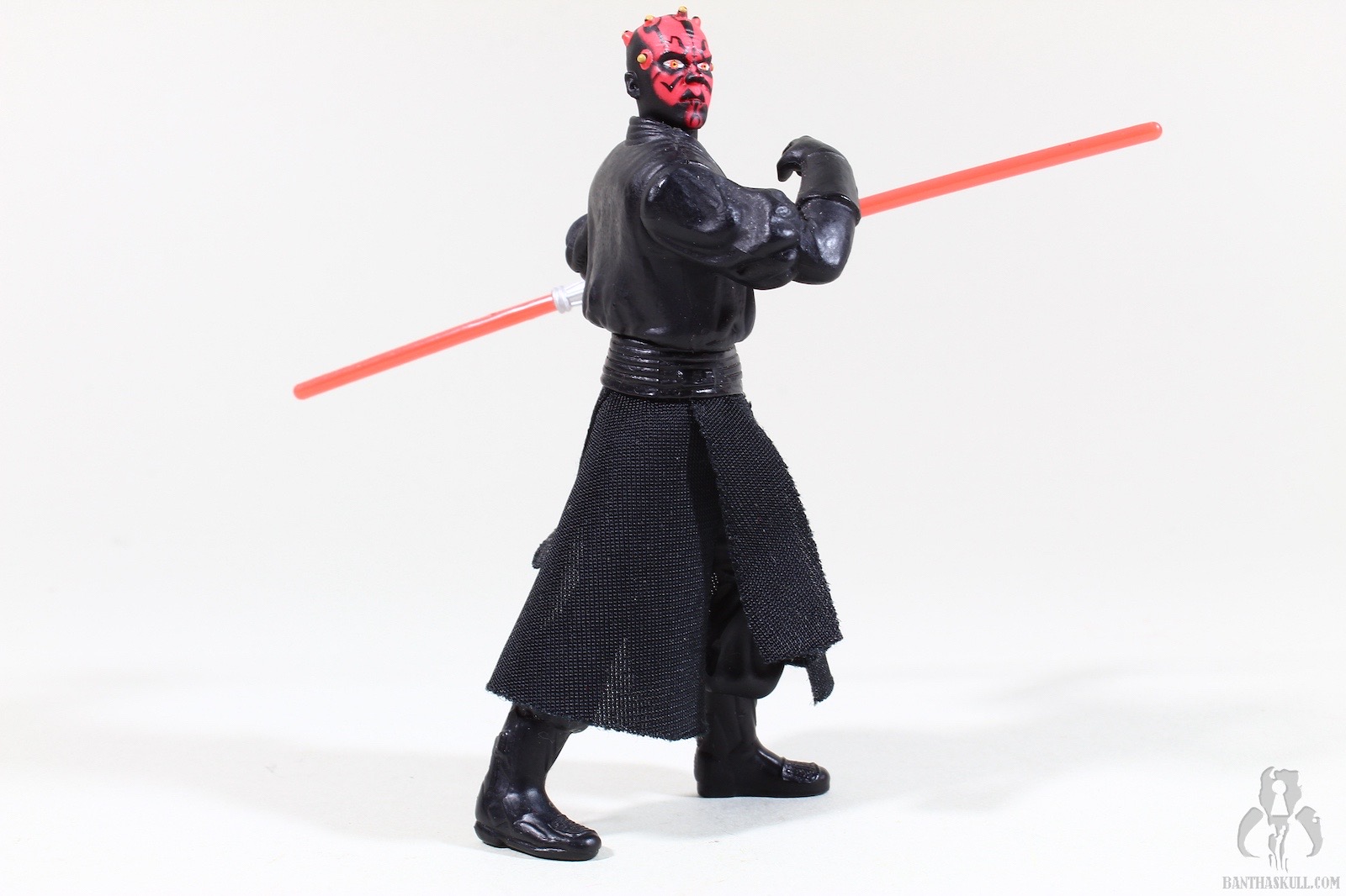 As mentioned in the last couple of reviews of some of the aforementioned core characters, this Darth Maul is basically the same look as compared to its original release, but Hasbro experimented a bit. Like the last basic releases of Obi-Wan and Qui-Gon, this Darth Maul includes some soft goods. Specifically, the “skirt.” Admittedly, it looks pretty great. Of course there’s just the standard swivel hips that represent the entirety of the lower body articulation, so the soft goods doesn’t really do anything to improve posability, as they often do in modern figures. It’s just a nice part of the figure that gives it the appearance of some added dynamism, even though it really isn’t all that dynamic.