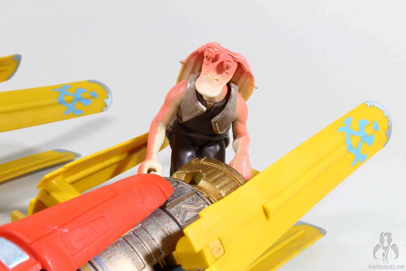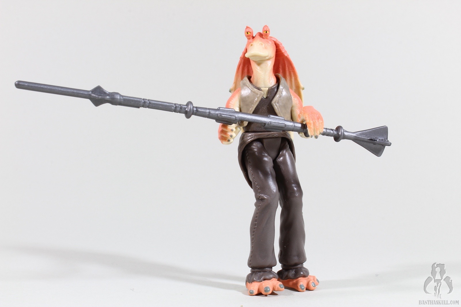 The figure admittedly is a nice sculpt, although it doesn’t necessarily have the same deep detail that other figures in the line have. But it looks just like the on screen character. His outfit isn’t textured, but it does include a removable vest and a separately sculpted kama/skirt. Jar Jar is not exactly in a neutral pose. His legs are slightly flexed as if about to take a step forward. His right arm is fairly straight, but his left arm is bent at almost a 90 degree angle. His right hand is sculpted into the familiar “c-grip” to hold the included accessory, while the left hand is flexed downward, also probably to replicate the position while engaged in Jar Jar’s comical gait. The face is fairly well done. It’s not overly comical, so this is about as “not ridiculous” as Jar Jar gets.