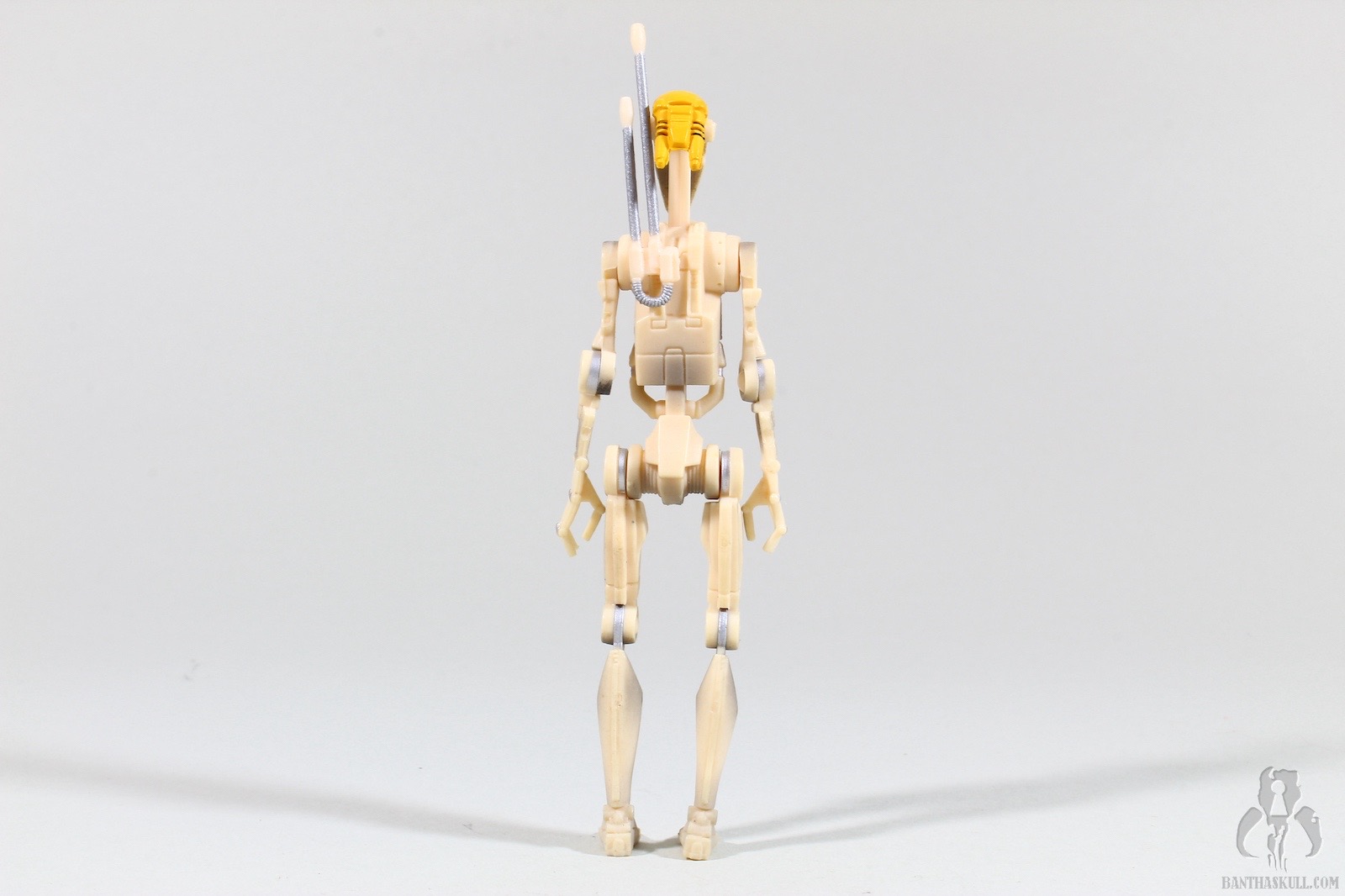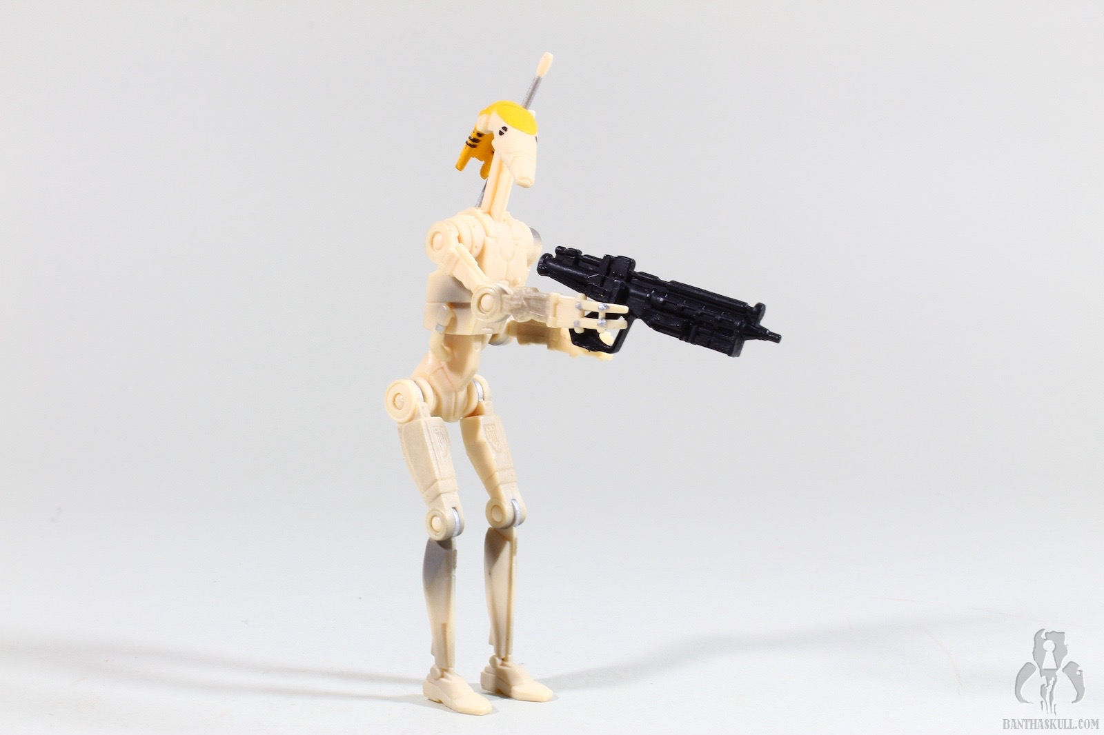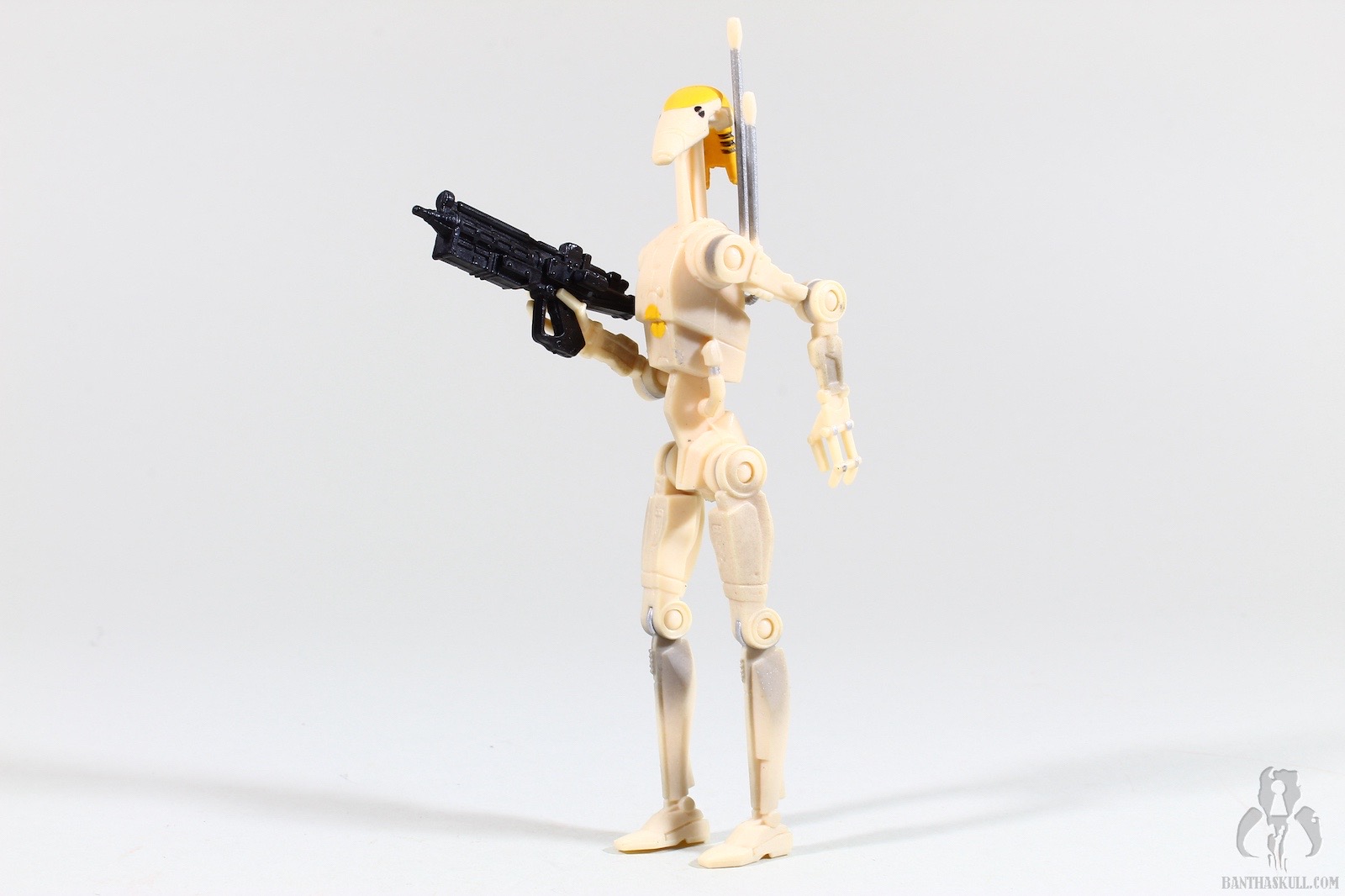 This figure is very similar to the other basic battle droid that was released earlier in the Episode I line, but there are several key differences. The backpack is replaced with a double antenna, which plugs into an off-center hole in the droid’s back. The neck extends and fully retracts. Perhaps this was meant to help simulate the unfolding of the the droid infantry, but that’s not quite how it happened on screen - and OOM-9 did not deploy/unfold on screen anyway. Another difference is the paint. He’s got the yellow markings of a command droid, and also notable is the absence of any battle damage, carbon scoring, or dirt. Besides the ball jointed head/extending neck, the figure has swivel shoulders, elbows, hips, and knees, which adds up to 10 points of articulation. Pretty good for a figure from 1999, although the lack of ankles means it can’t do anything other than stand straight upright, nor can it perform a THWG (Two-handed weapon grip).