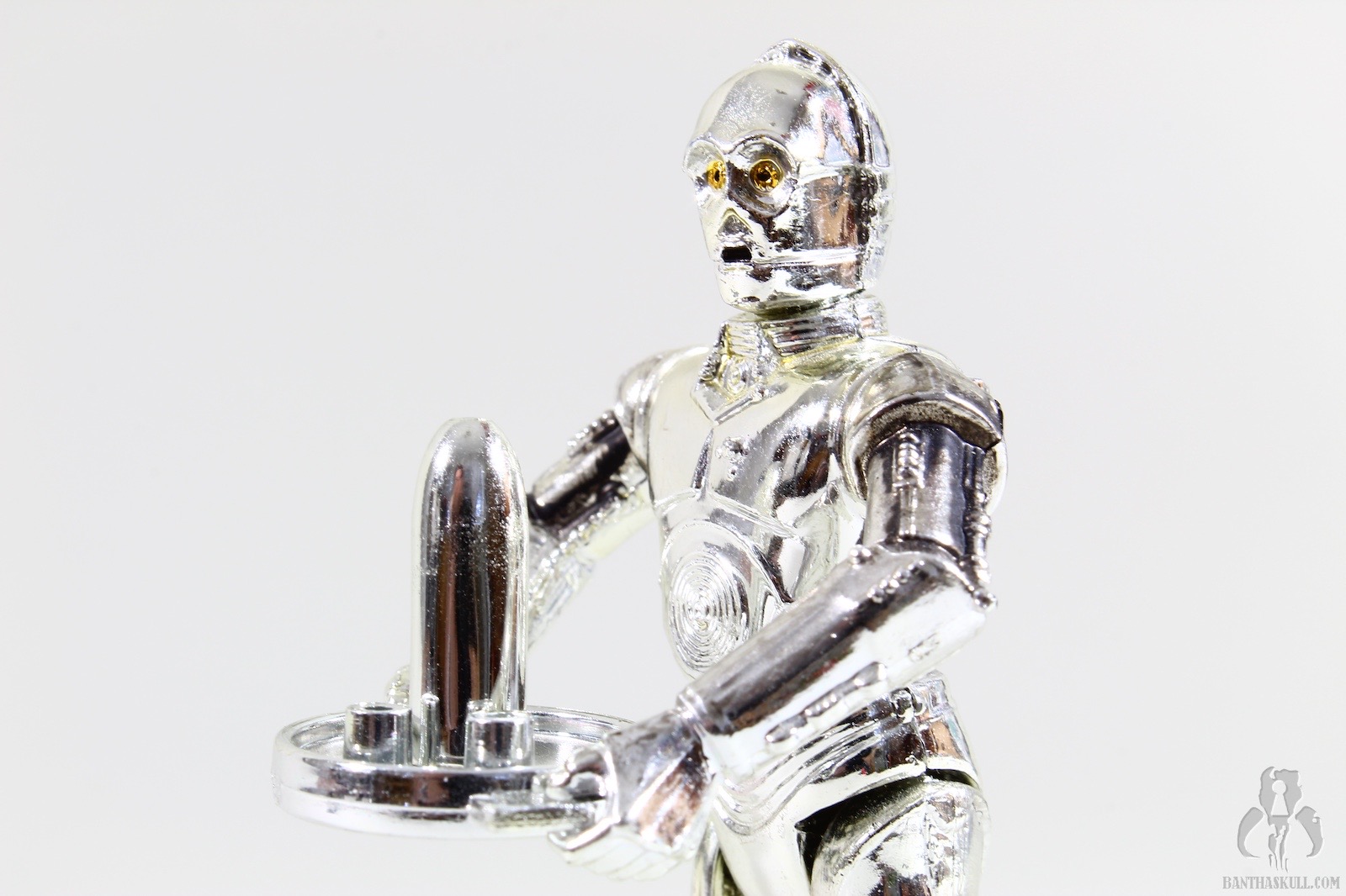 The aforementioned tray has two handles which fit nicely in TC-14’s hands. It has 2 silver cups which are sculpted onto the tray, so it’s kind of a trick TC-14 likes to play on unassuming guests that when they go to take a glass, it’s stuck to the tray. HA HA! Joke’s on them! In TC-14’s nervousness due to her realization that the ambassadors were Jedi, she decided to skip that trick on this occasion. In addition, there is a silver container, possibly a decanter of sorts (or perhaps something else for larger scale figures, wink wink nudge nudge), This piece is removable, but can be secured fairly well via a peg in the center of the tray, so it doesn’t keep tipping over.