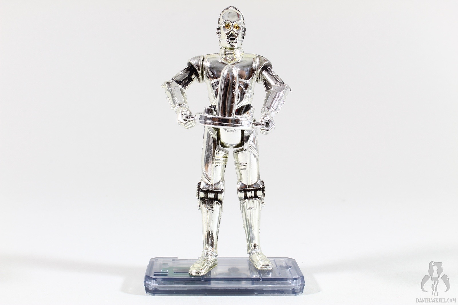 TC-14 is a 5POA protocol droid figure that seems based on contemporary C-3PO figures. The main difference in the sculpt is that each of TC-14’s hands is formed into a tight C-grip so that she can hold her refreshemnt tray accessory. Otherwise, it’s painted in a striking bright silver vac-metallization. To provide some depth, there are some paint details on the photoreceptors (“eyes” to you civilians), palms, and the abdomen wiring, as well as some dark wash to the knees. It’s a great looking figure, although it lacks any advance articulation that you’d find today in super-articulated protocol droids. It has swivel joints at the neck, shoulders and hips. It’s sculpted in a very slight non-neutral stance with one foot a bit forward of the other.