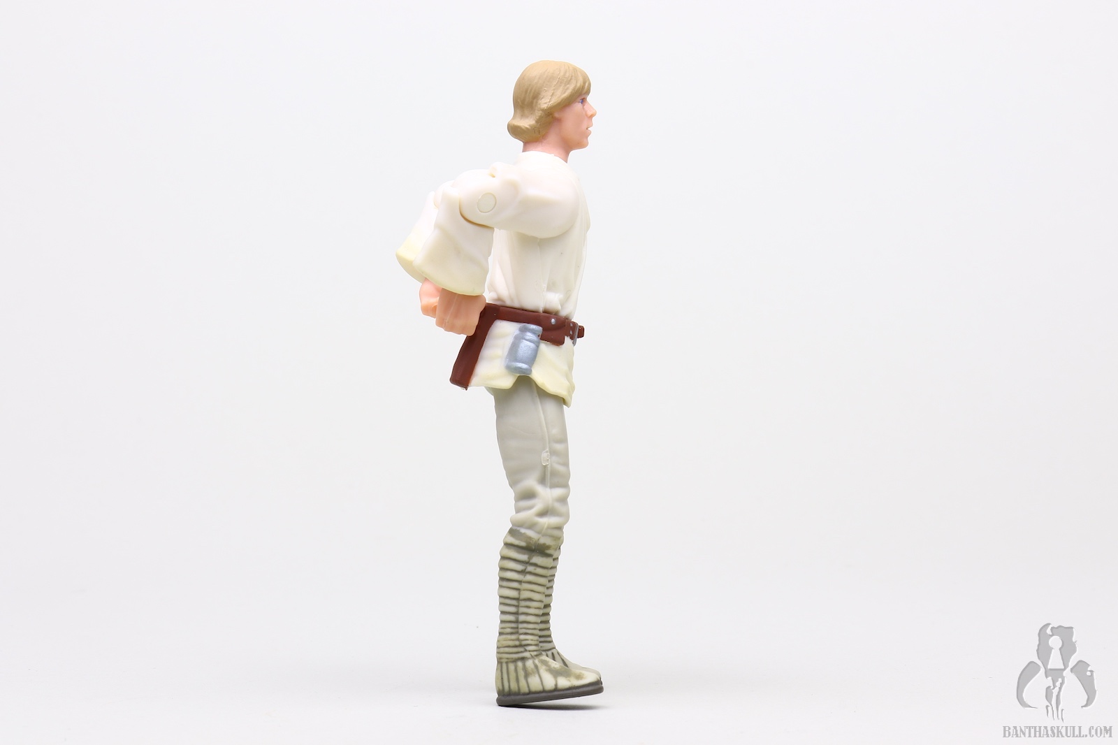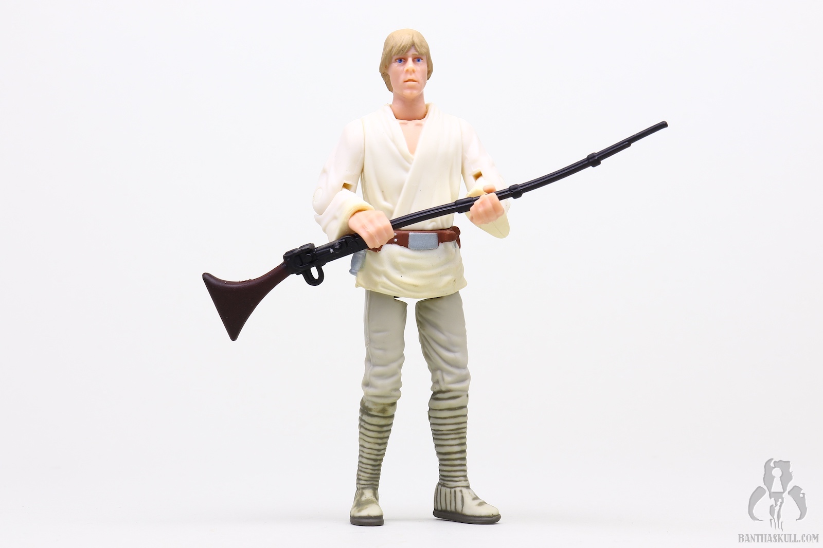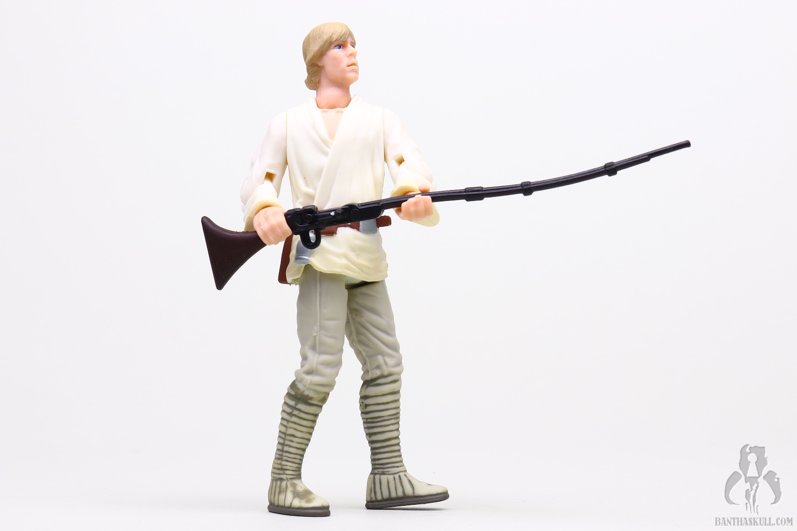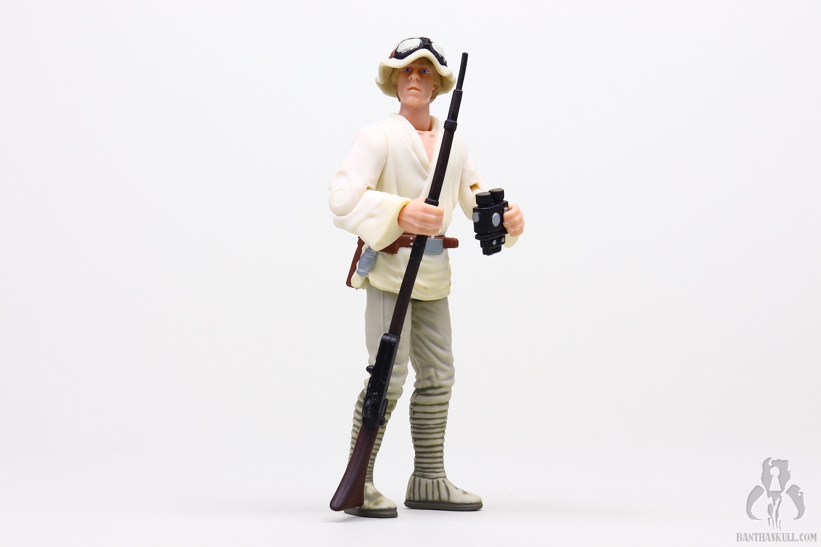The first thing that jumps out at you is that the figure does not include a lightsaber, but of course that would be accurate to the source of the figure as it was before Luke would even meet the crazy old wizard (it really seems like Kenobi did nothing to hide his identity). On the subject of saber-less-ness, the following year, the Commtech Darth Vader would be the only Darth Vader figure to ever ship without a lightsaber (unless my memory is failing me). Instead of the ligthsaber, which Luke actually only briefly used in A New Hope, this figure includes a trio of accessories. It includes the aforementioned floppy hat as well as the binoculars to recreate the battle gazing scene. It also includes the long rifle that attaches to Luke’s Landspeeder. He probably uses this rifle to target shoot small animals for sport.