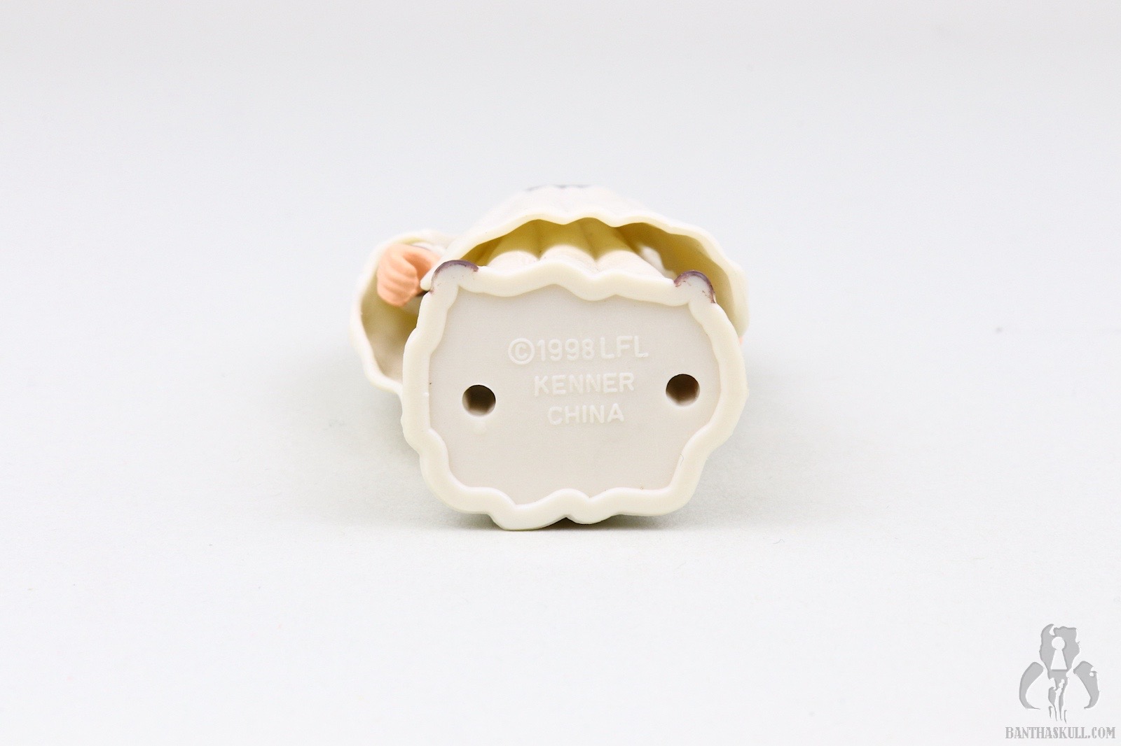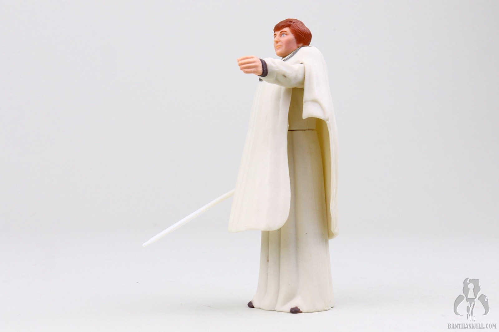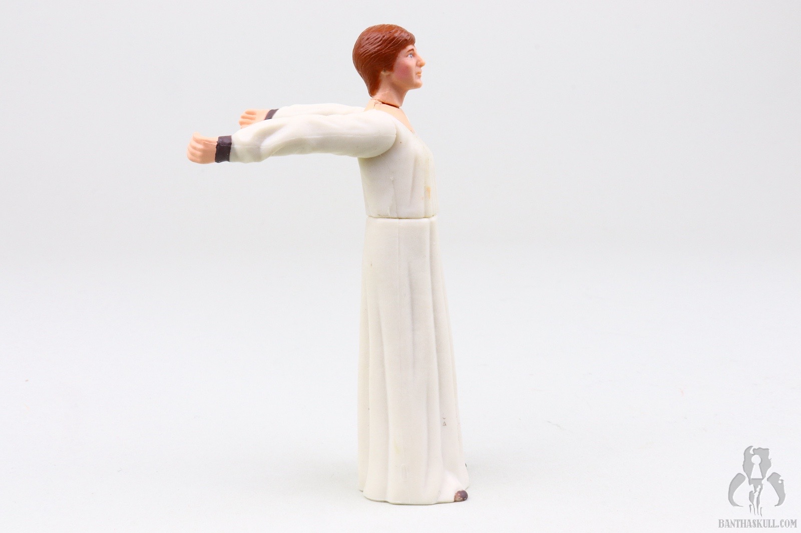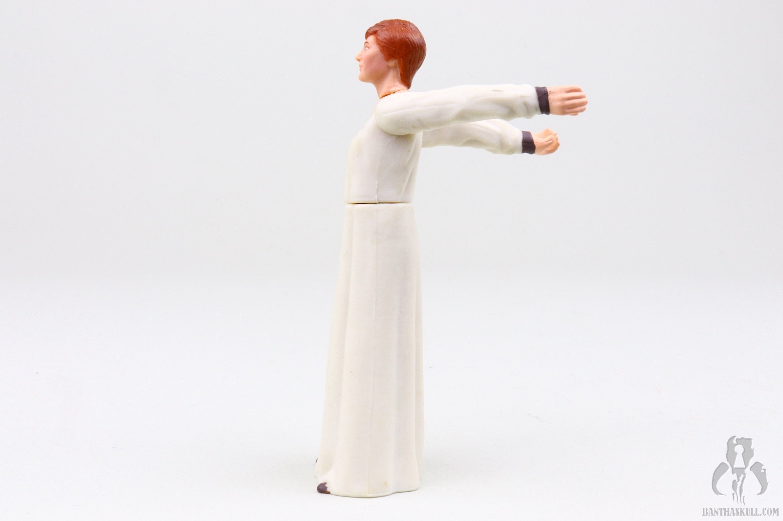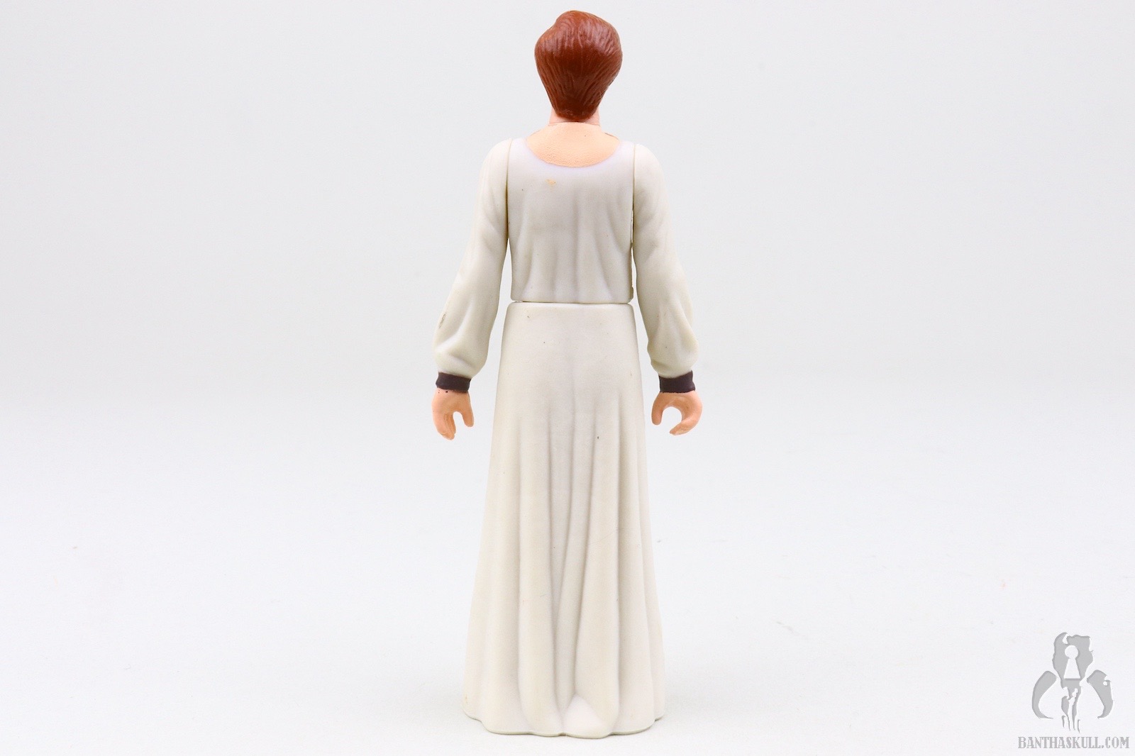 This figure can’t do much, aside from Rebel Queen to Rook 4. That is to say, the figure is the proverbial chess piece. “Salt shaker” is another designation to describe this kind of figure. The entire lower body is one solid piece. You can rotate the head. You can raise one arm, and when you get tired doing that, you can raise the other arm. If you’re really daring, you could raise both arms at once, but I don’t recommend it. One collector did exactly this and had to spend a week in a nervous hospital from the overwhelming spectacle of the event. If you’re still searching for some play value, you can remove the plastic molded outer garment, and you’re left with a figure that looks like a nursing home sunsetter who has wandered off the grounds, shuffling around town in her nightgown wondering aloud when Timmy is going to get back from the war in Europe.