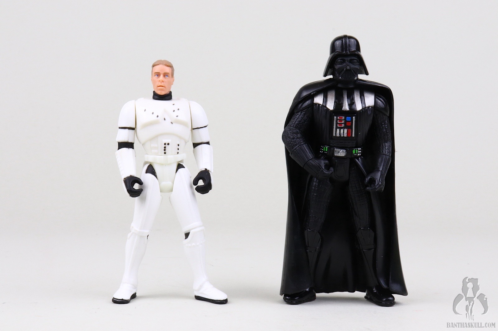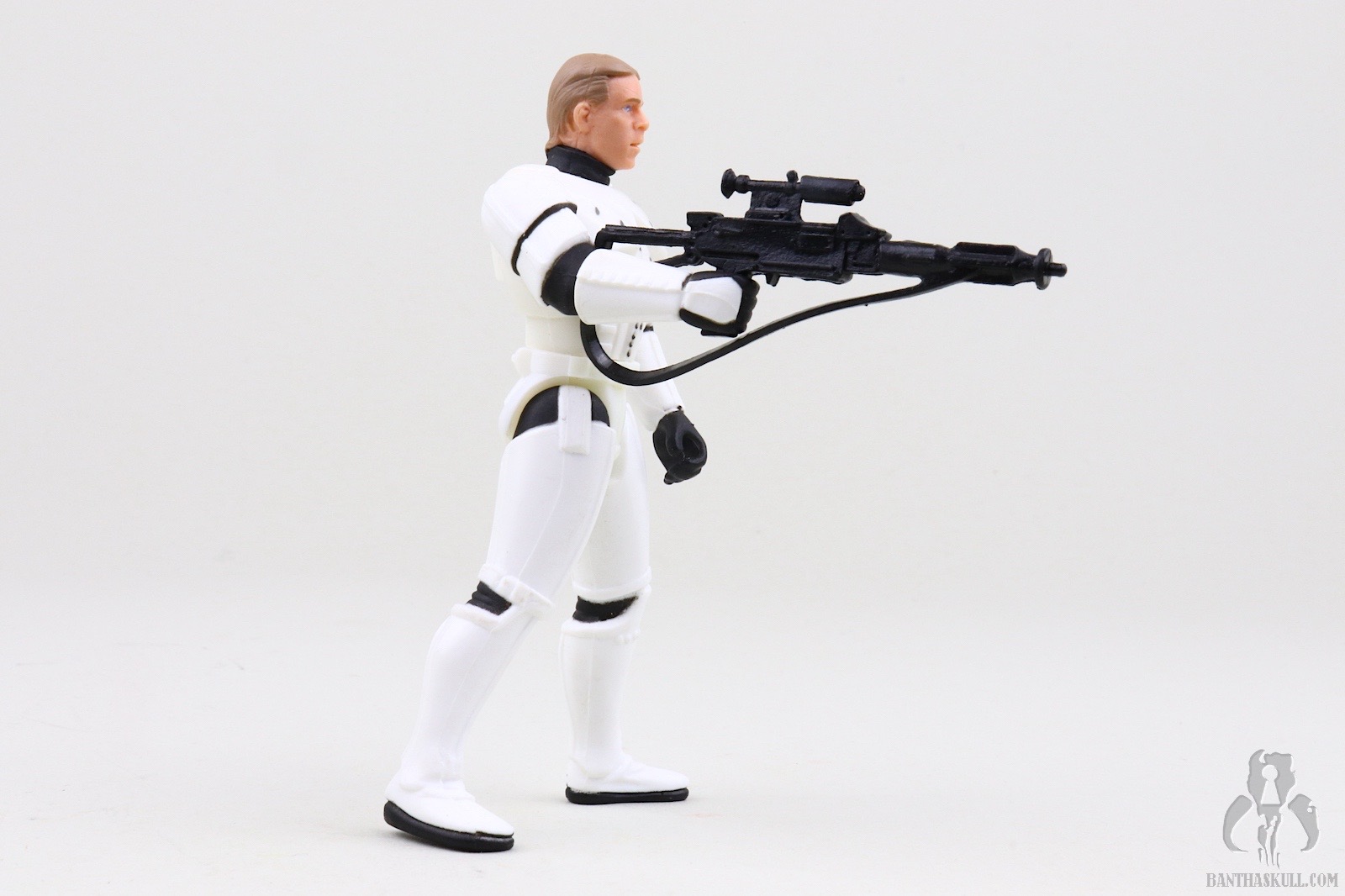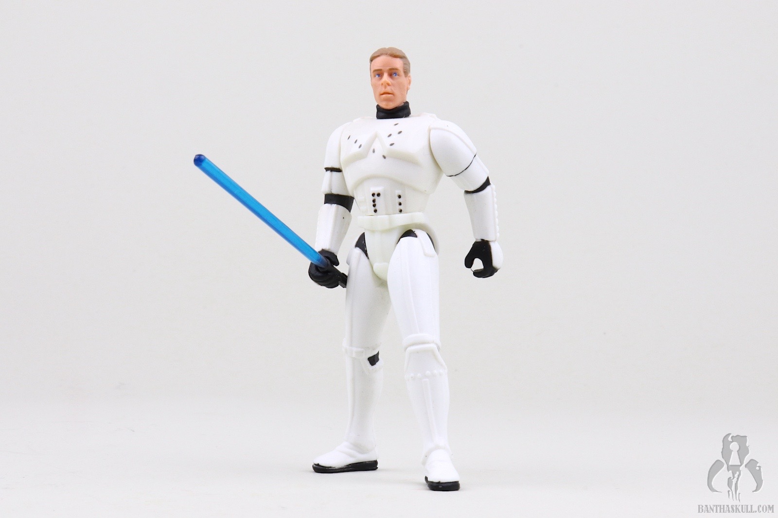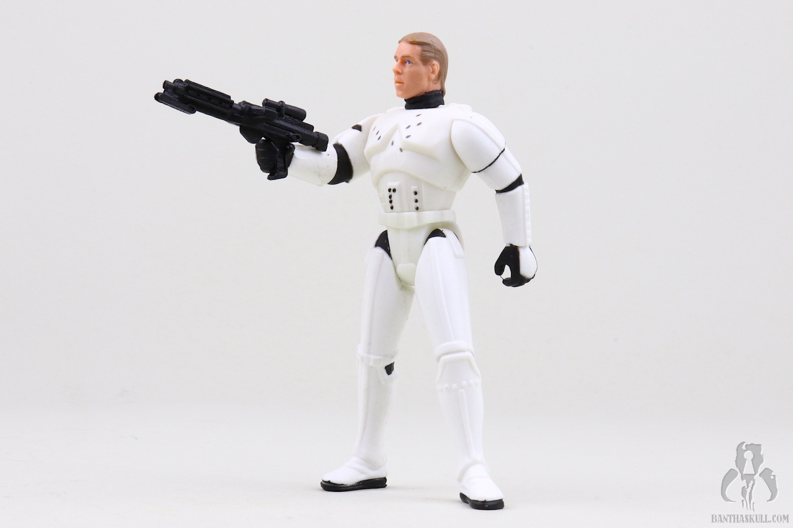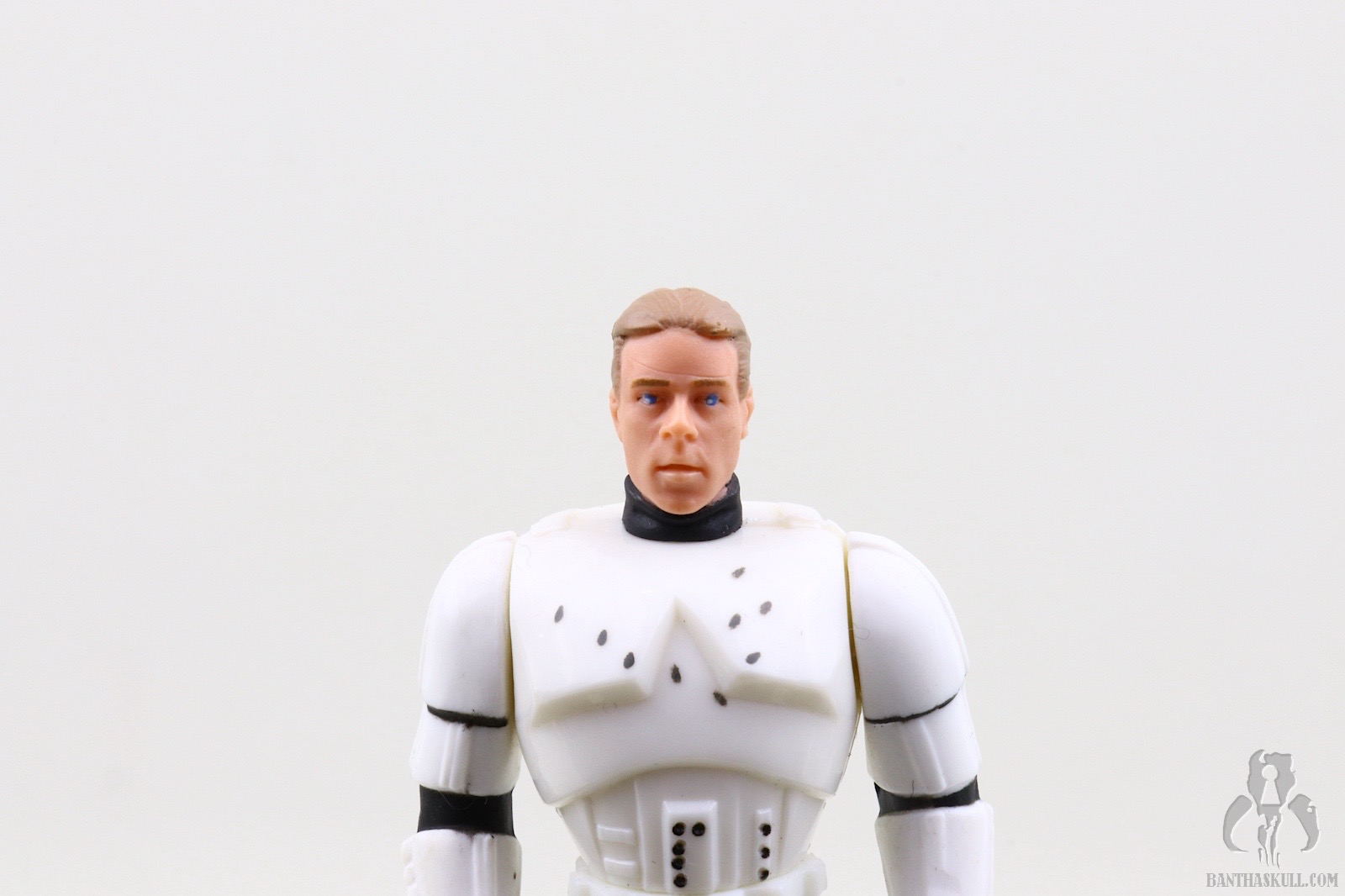 The weirdness doesn’t stop at the whole “board game with action figure pieces” thing. Let’s start with the Luke figure. It’s a moment-specific version of Luke when he was wearing the Stormtrooper disguise. After the dianoga beats tentacles out of the trash compactor, Luke emerges from the grimy garbage water with a bunch of fetzer valve-clogging goop on his armor. He also tilts his head as he emerges from the water so it slicks his hair back like a quart of pomade. It’s a swimming power move. Ask Phoebe Cates. This figure represents that appearance. It’s a new head and some new deco on the POTF2 - Luke Skywalker in Stormtrooper Disguise figure. The goop part is done somewhat crudely. The hair is done passably and even includes a sculpted duck tail in the rear. That’s not the weird part. It’s the accessories. Luke includes a blue light saber. Aside from the fact that he never carried a lightsaber on the Death Star, it’s not his saber. It’s an all black Darth Vader hilt with a blue blade. Optionally, you could equip Luke with his green saber from two movies down the road. Finally, in addition to the E-11 blaster, you could also arm Luke with a DL-44 blaster, or a blaster rifle. I assume these accessories have something to do with the gameplay. Please refer back to the section on me not caring about the gameplay. The figure is what it is. It’s a POTF2 figure with all the associated warts that come with that designation. It’s a 2 out of 10.