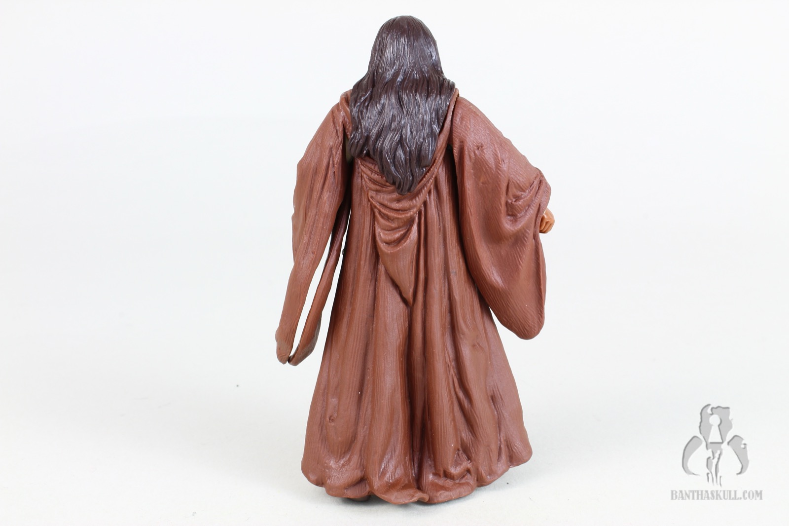 When the robe is taken away, you’re left with a figure that is only a little more possible. Whereas the sleeves erased the usefulness of the arms, you can use them to their full effect without the rebe. Unfortunately, while the shoulders are ball jointed and work well, the elbows are stupid. They’re swivel, but even that is minimized because the “cut” is at almost no angle, so rotating the elbows accomplishes almost nothing. The cuffs of the tunic are also sculpted in such a way as to inhibit the usefulness of the wrists. As for the lower body, it was also useless with the robe, but the lower skirt, which is made of a papery soft goods, is Lilo and Stitched in such a way as to restrict the range of motion of the hips anyway.