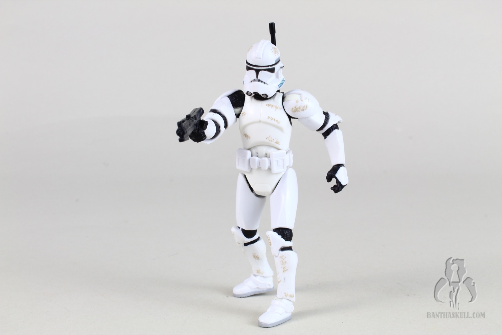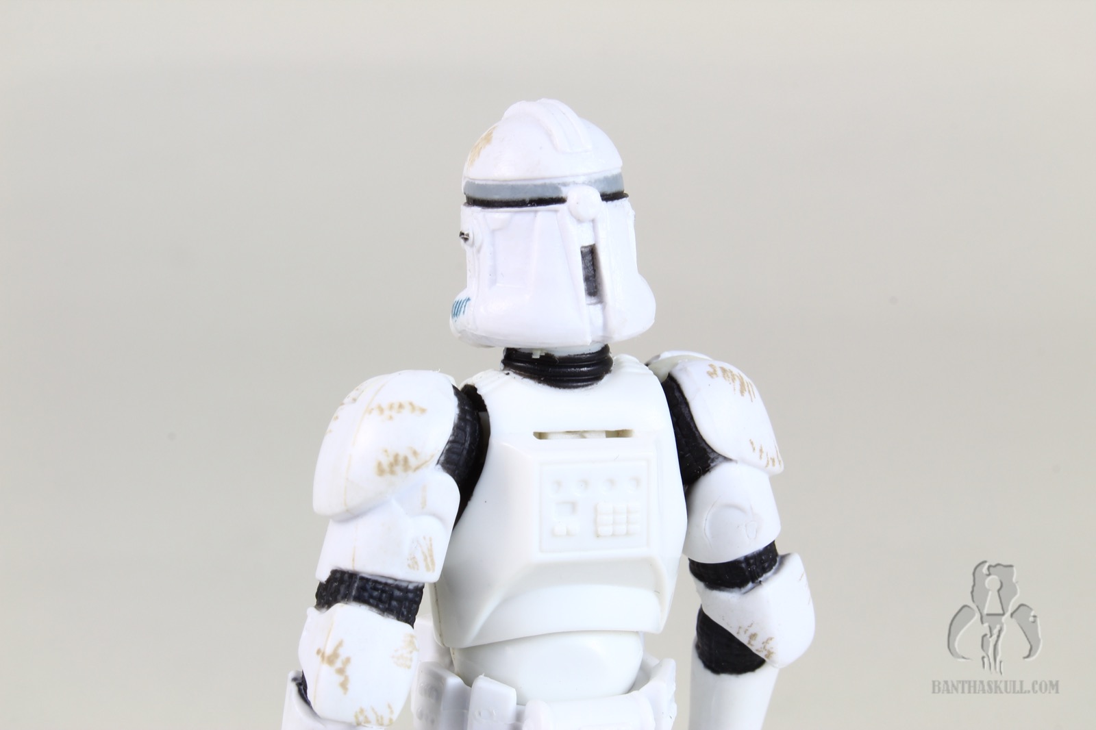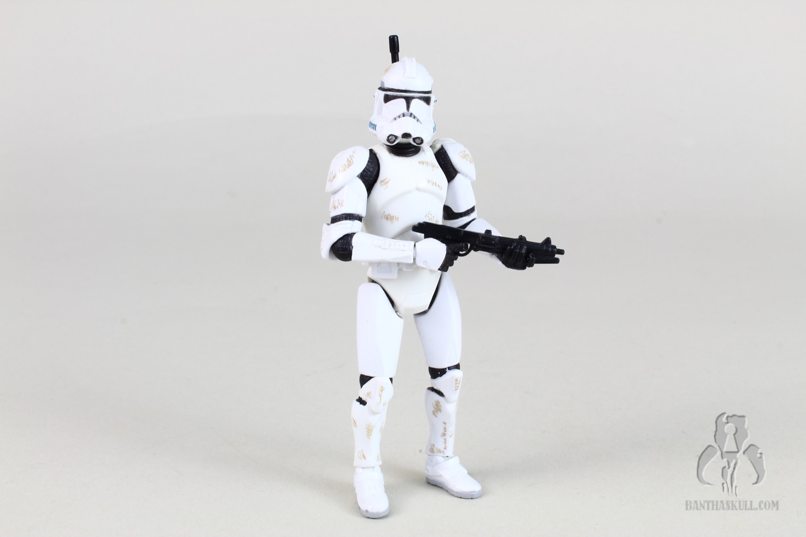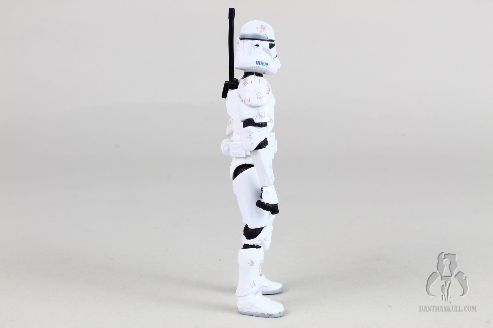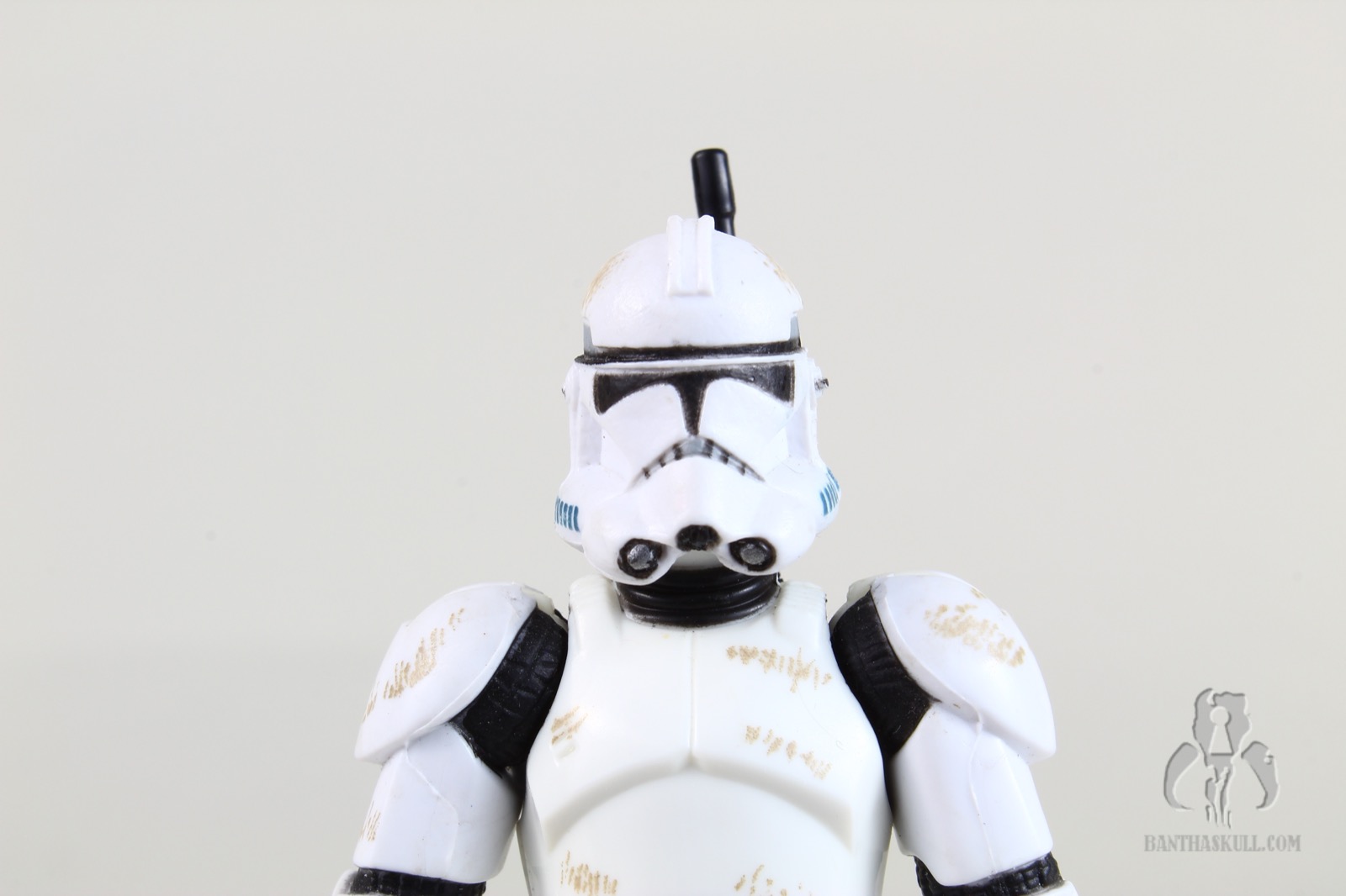 The figure takes that same base, and the first thing it does is give it the Phase 2 helmet. It’s nicely proportioned (as is the rest of the body - unlike the absurdly inhuman skinny proportions of VC45, which was the next significant change to the 3.75” clone trooper. Many of the clone figures from this era had the removable helmets, which seemed to not be all that well-received. However, ROTS 41 had the permanently helmeted headsculpt. The other big change was the inclusion of the black antenna accessory, which plugs into a horizontal slot on the figure’s back. It was a long time before I learned that this antenna is actually from the film. If you look closely at the gray 41st Elite troopers that greet the aforementioned gunship, at least one has the antenna on his back, although it is much more slender (almost invisible) than the giant rod (giggity) on the figure’s accessory. But again, it wasn’t an all white trooper that had this, so despite the effort, it’s still not screen accurate. And finally, there’s the weathering. It was a nice change of pace to include the various scuffs and scratches (but no carbon scoring) on the figure to add some “used” quality to the armor. Again, however, no white clones in the film to justify this added detail.