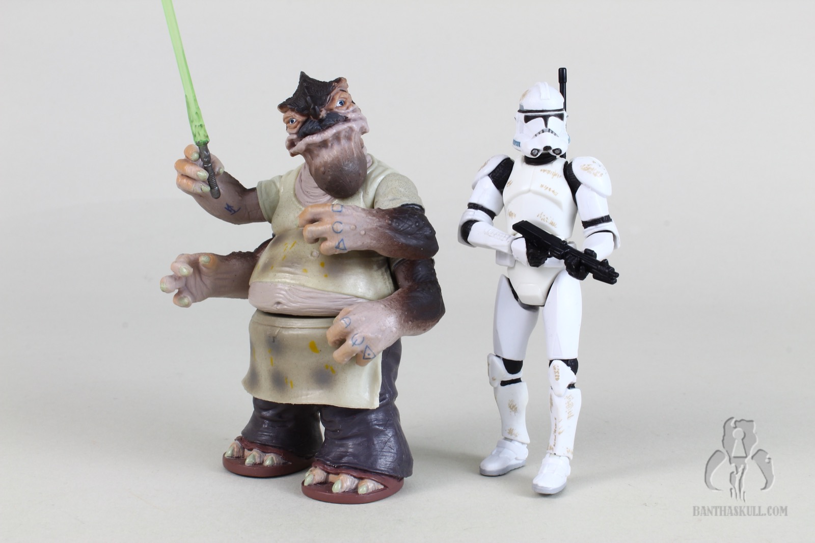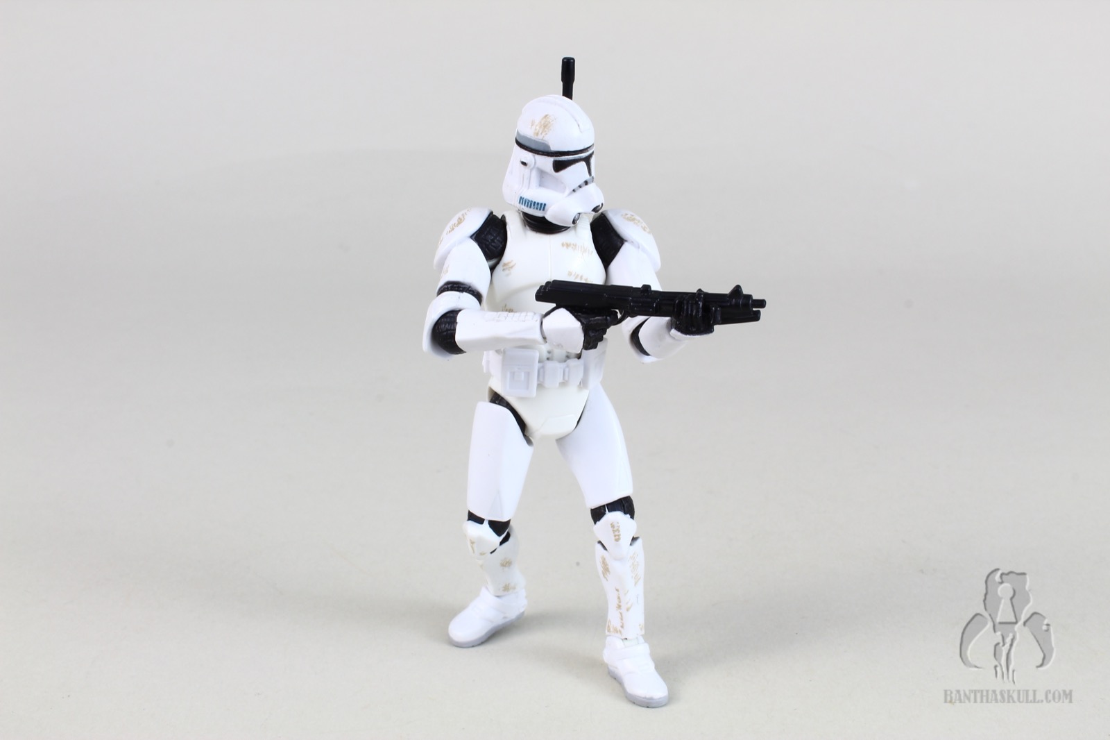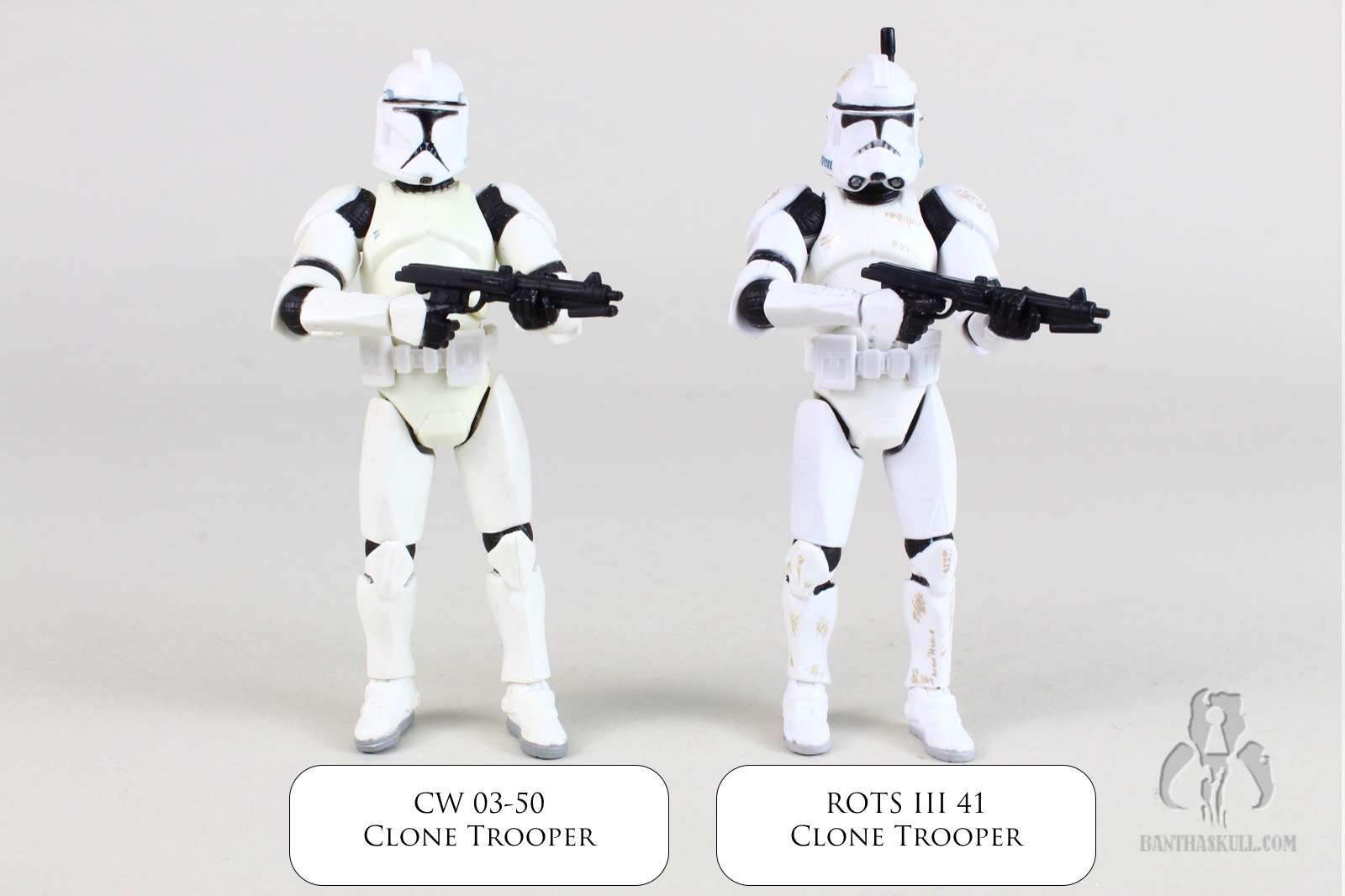 The all white Phase 2 Clone Troopers are a pain in the tushy. The promotional materials were filthy with these, uh…clean white troopers. The problem is that they didn’t make it into the final cut of ROTS, unless you include the ones that were on board the gunship in the skies of Coruscant that transported Yoda, Mace, and Obi-Wan to the 41st Elite Corps staging area prior to shoving off to Kashyyyk. It is widely believed (confirmed?) that those were an editing error, and should have had the gray flashes of the 41st - which are seen in large numbers on the ground when the gunship lands. Hasbro, going off either the promotional images or additional intel provided by LFL, was all in on the white clones, starting with figure III 06 Clone Trooper. We recently reviewed that figure, and it was fairly lame because it was both a step back from the gold standard Clone Wars ‘03-50 Clone Trooper [Phase 1] as well as it having included an action feature.