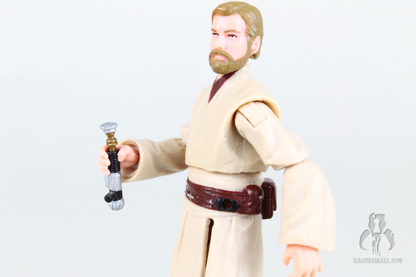 For accessories, Obi-Wan comes with an unlit hilt that plugs into the belt nicely, and can be gripped reasonably well. Skipping the removable blades (thankfully), you also get a fully lit lightsaber. He also comes with a plastic robe, which fits pretty well, in a neutral and slightly mopey kind of stance that Ewan MacGregor often made throughout ROTS. It’s got that “melted chocolate” look to it, but it’s better than similar robes from the past. Finally, as this is intended to be a pilot figure, he comes with a removable headset that fits pretty well over his head.
