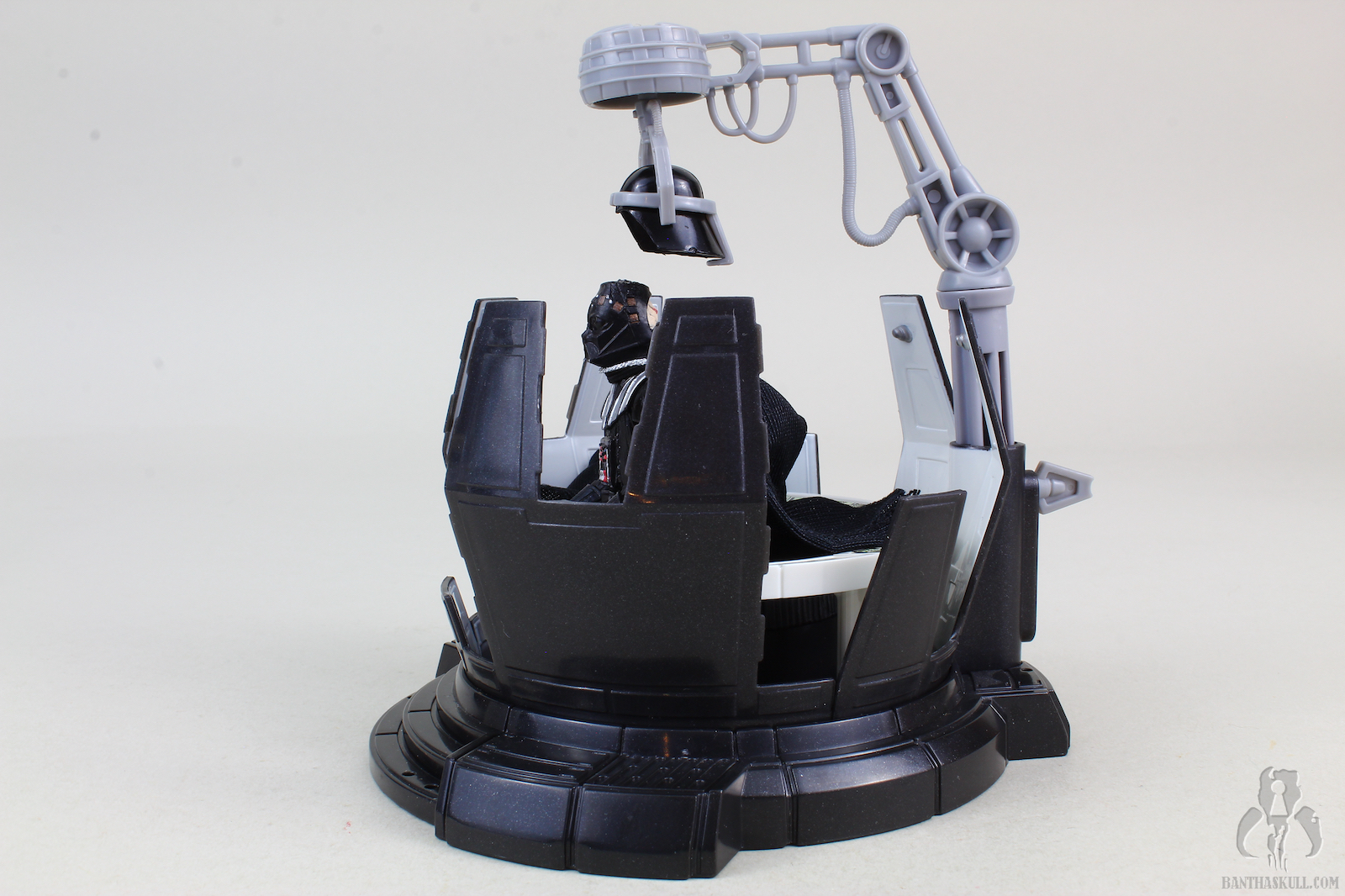 The chamber is the star of the set, of course. It’s nicely sculpted, although definitely on the small-ish side. The packaging is actually part of the chamber. The plastic bubble also doubles as the top part. It doesn’t actually close, as is (barely) shown in ESB, but still serves that purpose. It’s not great, by any stretch, but at least it’s there, unlike, say, the carbon freezing chamber claw in the upcoming TVC set. The helmet crane is fully functional. It works even inside the packaging, as the lever is exposed for operation. Vader’s helmet dome fits snugly in the claw, which rotates, and raises and lowers perfectly over Anakin’s head. The seat conforms to the figure nicely, and Vader looks pretty sweet sitting inside, making his officers uncomfortable. The set could definitely be improved upon by today’s standards, 15 years later. A larger chamber, with fully functional top half (minus the plastic “window”), on a dais would be excellent, especially if it came is packaging with a sturdy cardboard backdrop depicting the interior of the room, where Vader can freak out the likes of Veers or Piett.