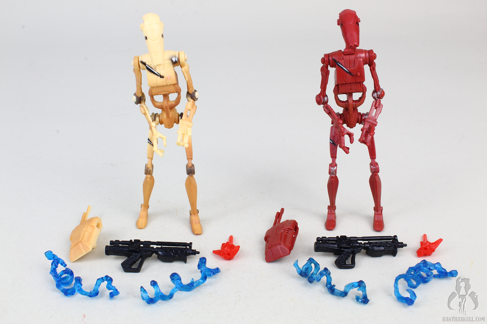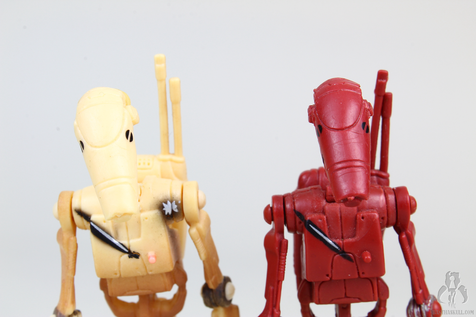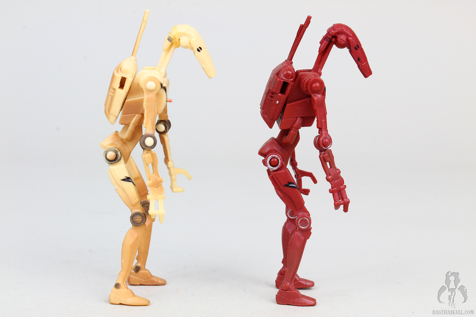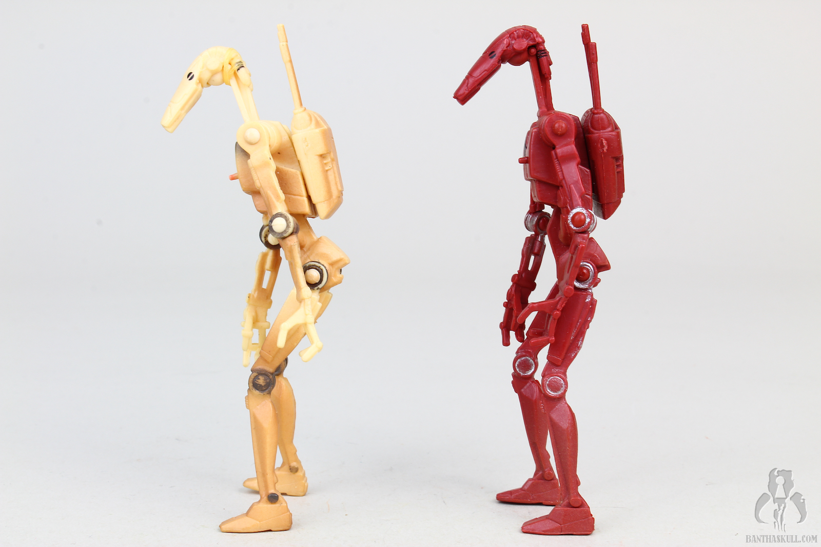 Running changes where Hasbro gives us variants of a figure are always a good thing. Sometimes a running change is a minor correction, but as is the case here, we get two different figures meant to represent two different on screen characters. The tan battle droid is, of course, from The Phantom Menace, while the red variant is from Attack of the Clones.