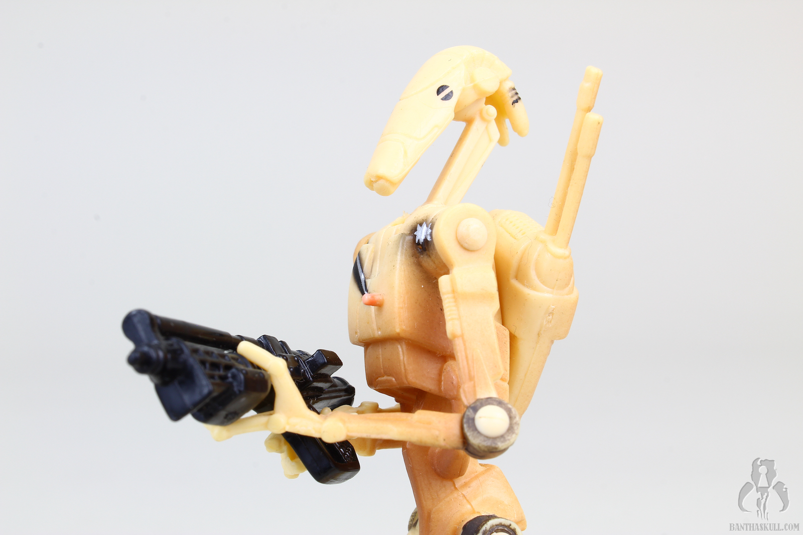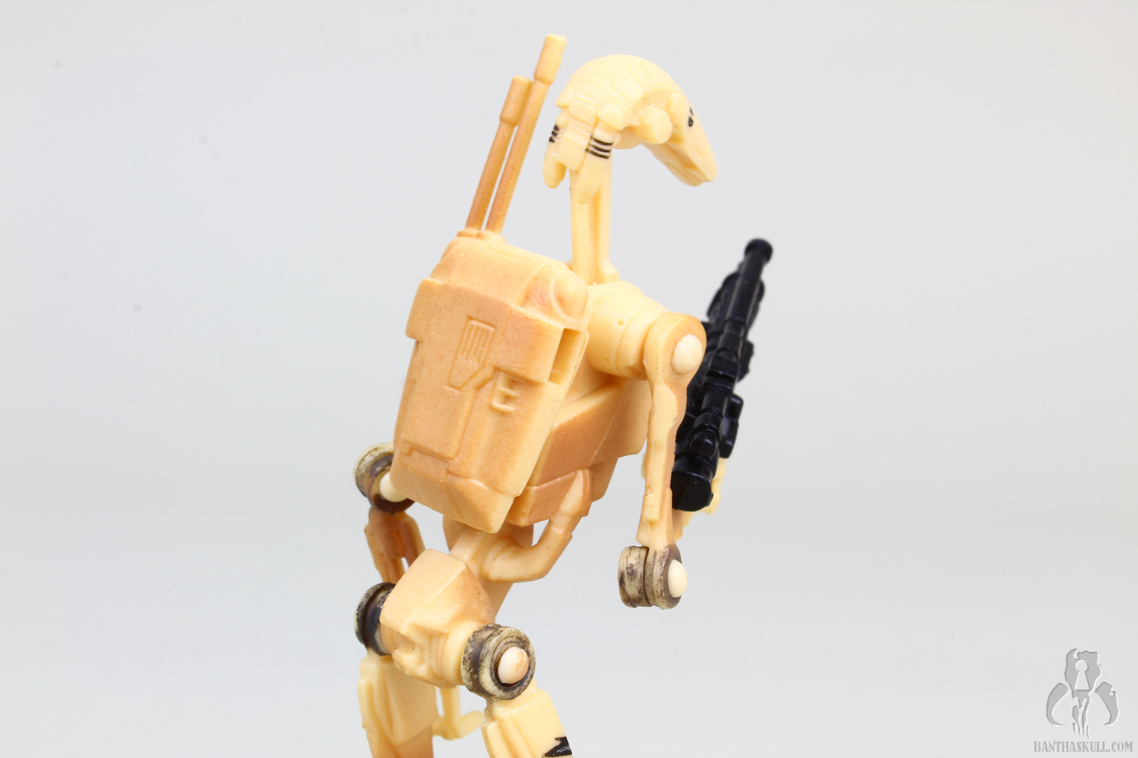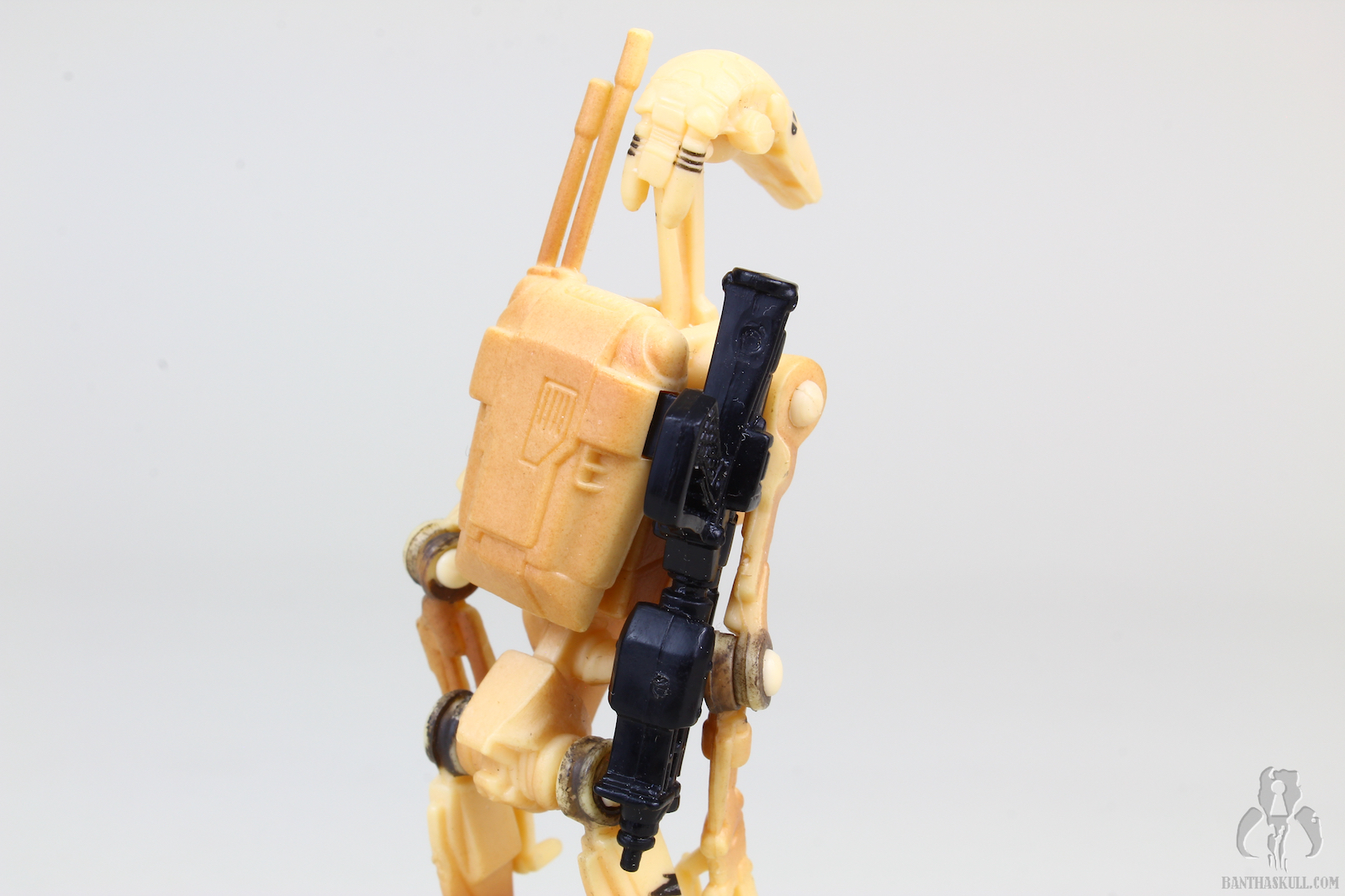 The figure is fairly weak, especially when compared to more modern releases. There is no articulation below the hips at all, so right off the bat it limits the posability. However, the upper body is decent. There’s the usual double neck, with a ball joint were the stalk meets the head, and a hinge where it meets the shoulders. It allows for a bit of expressiveness out of the droid. The shoulders and elbows are swivel (as are the hips). The hands are positioned in such a way that you can get a THWG, something welcome (so far) out of the Battle Droids since the spindly nature of these figures seems to preclude articulated wrists.