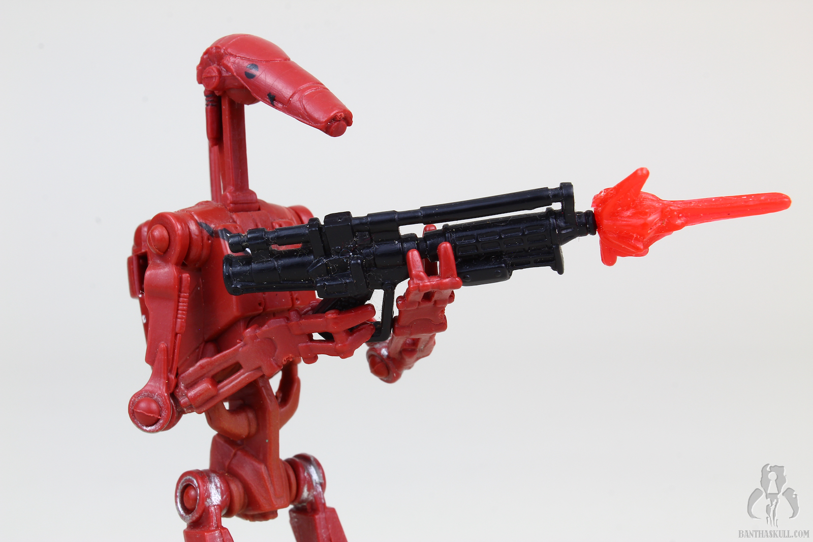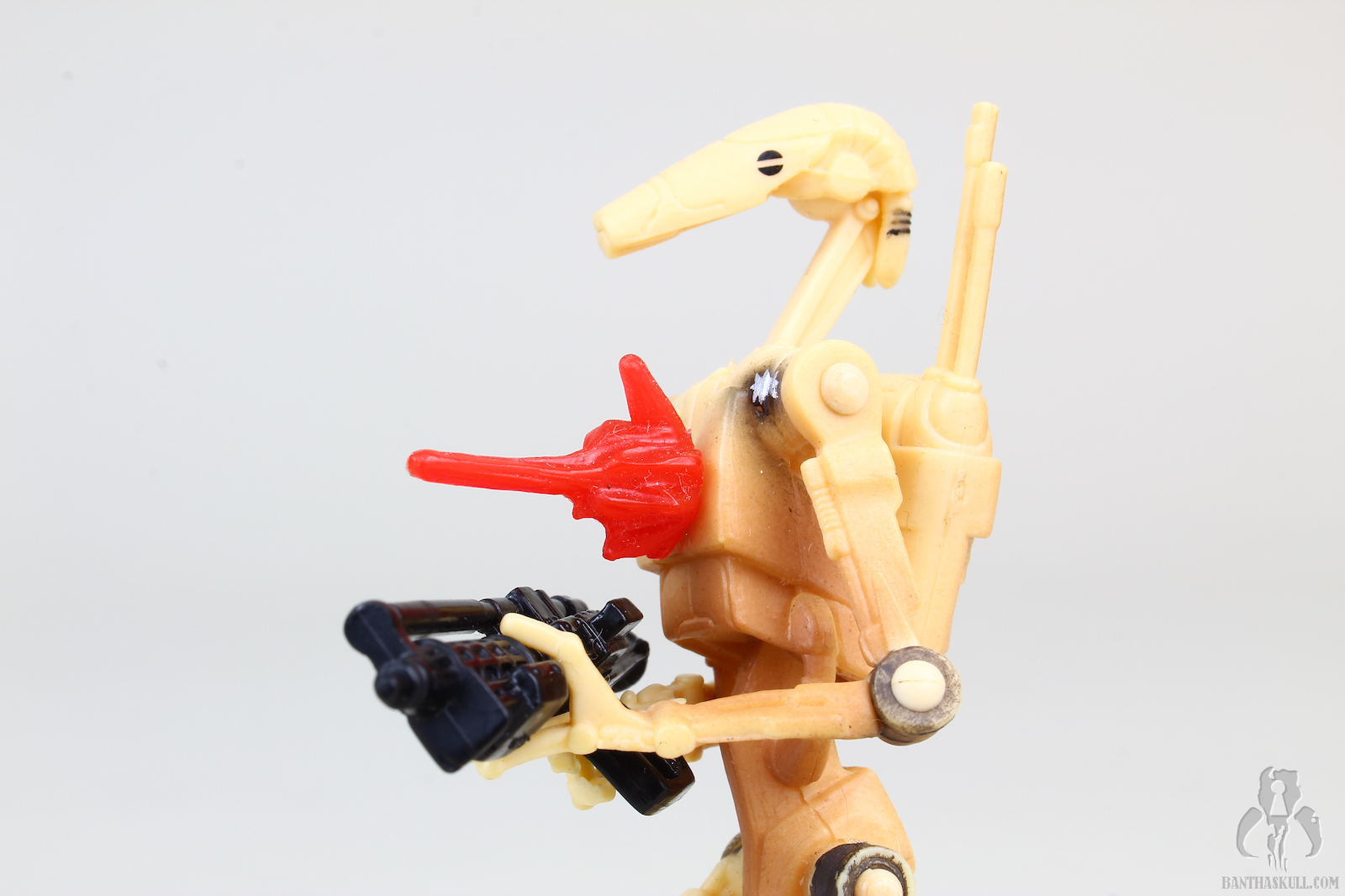 The paint is fairly simple, red or tan, with similar battle damage markings on both versions, notably a diaganal slash across the chest and right hip, while the tan version also has a prominent blast mark on the left shoulder. The backpack is removable, but also sports the notch where the droid can stow the included blaster. An additional accessory is the red blast effect, which can either be plugged into the tip of the weapon for a firing look, or it can be attached to a peg on the droid’s chest to represent it getting hit with blaster fire.