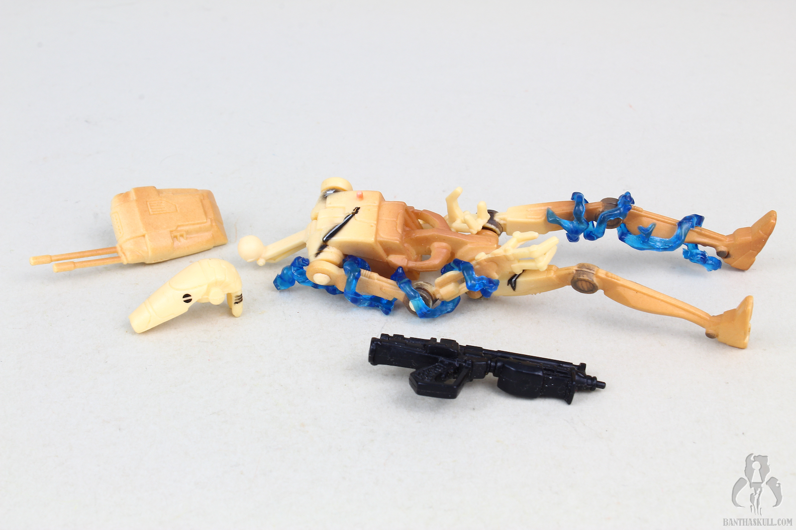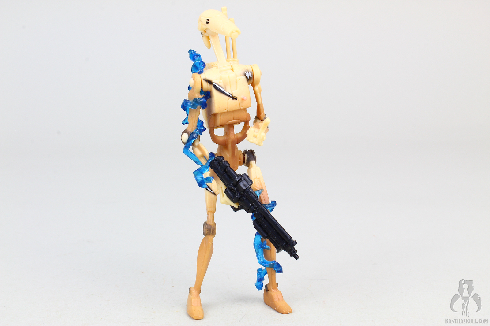 The main reason for this figure’s existence is the included blue electro-blast effects. There are two of them, which wrap nicely around the right arm and left leg, respectively. Together with the aforementioned red blast effect attached to the chest, it gives a nice display of the moment this poor droid gets shot.