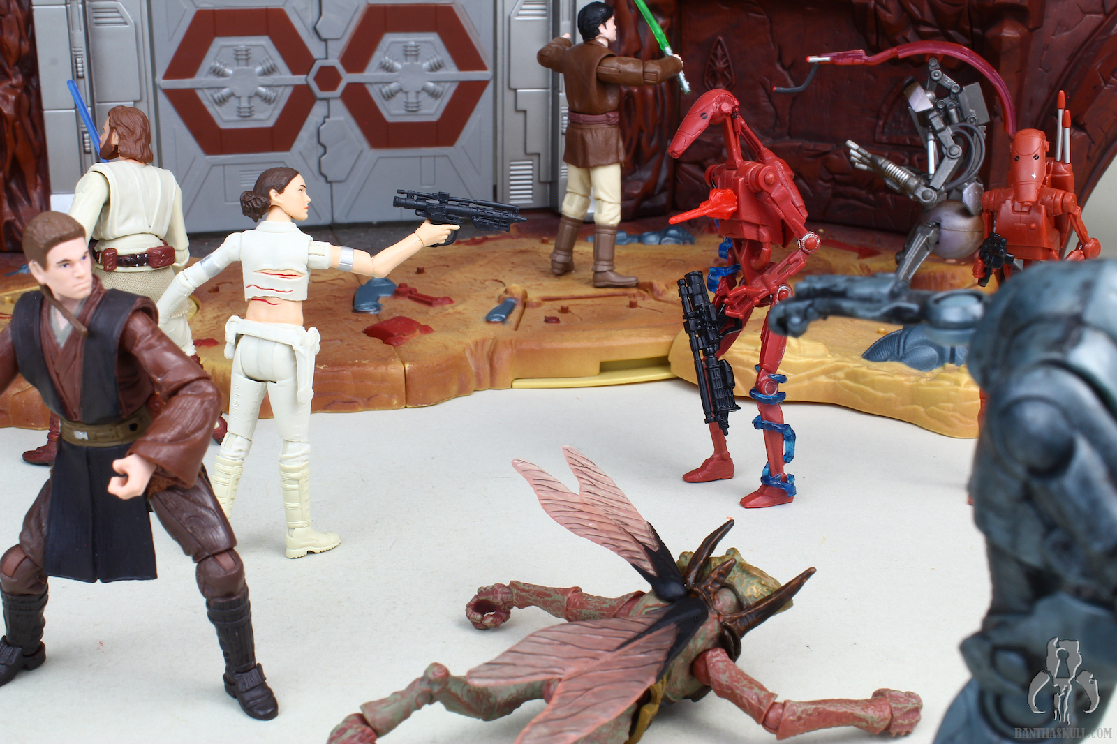 The design is likely inspired from Episode I, as several droids can be seen “shorting out” when hit with blasters or the blue Gungan energy weaponry. In fact, I don’t recall that type of effect being in AOTC at all, but there certainly was plenty of opportunity given all the droids shown on screen during the arena battle. This looks like a TPM-specific snapshot, where Hasbro just took the opportunity to repaint in AOTC colors. Whatever, it works for me.