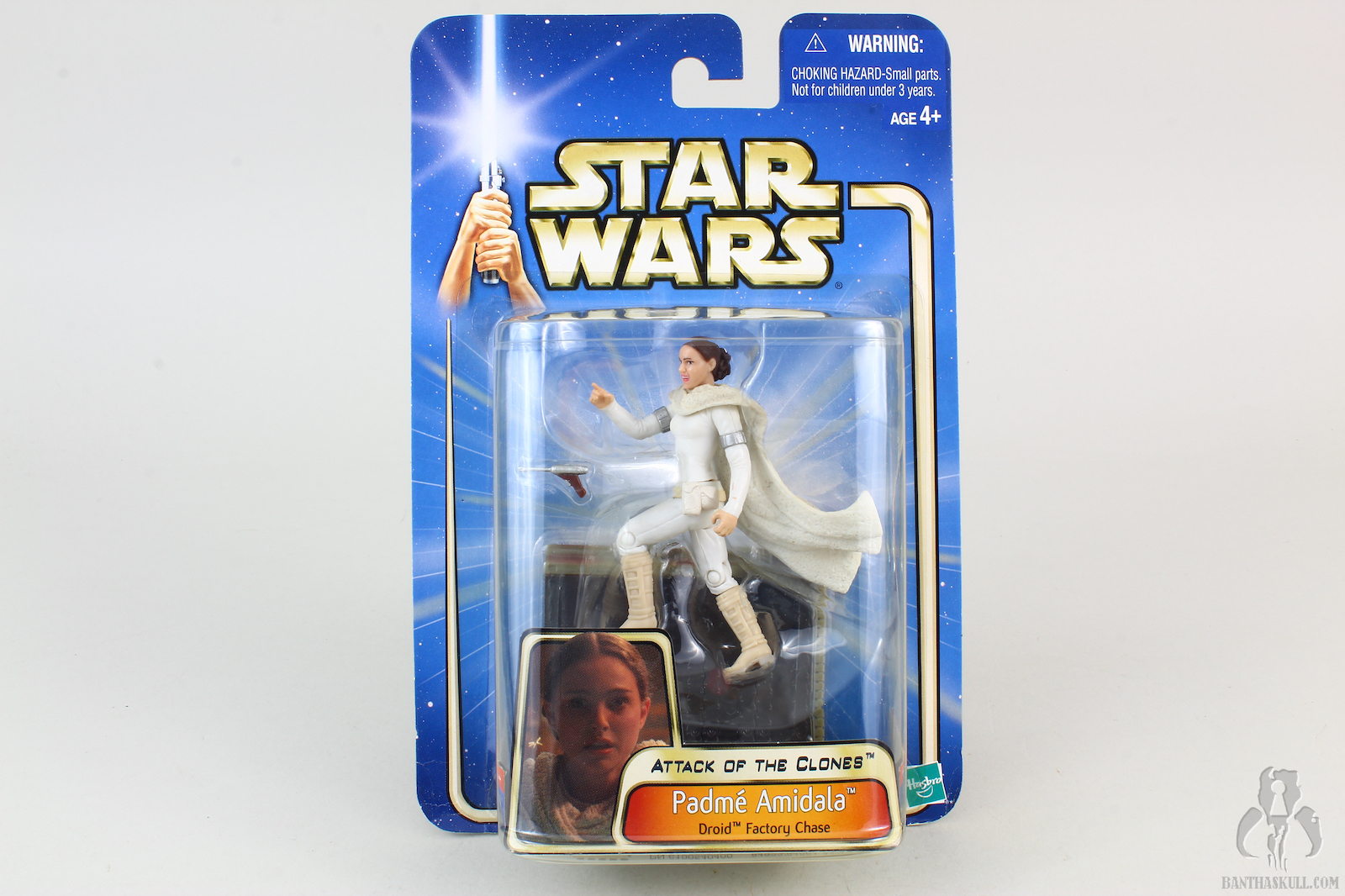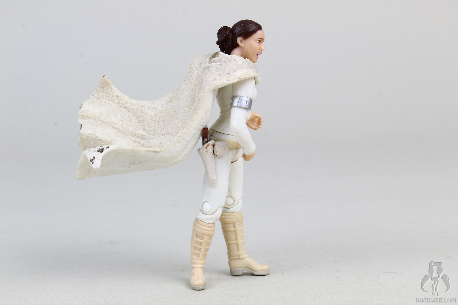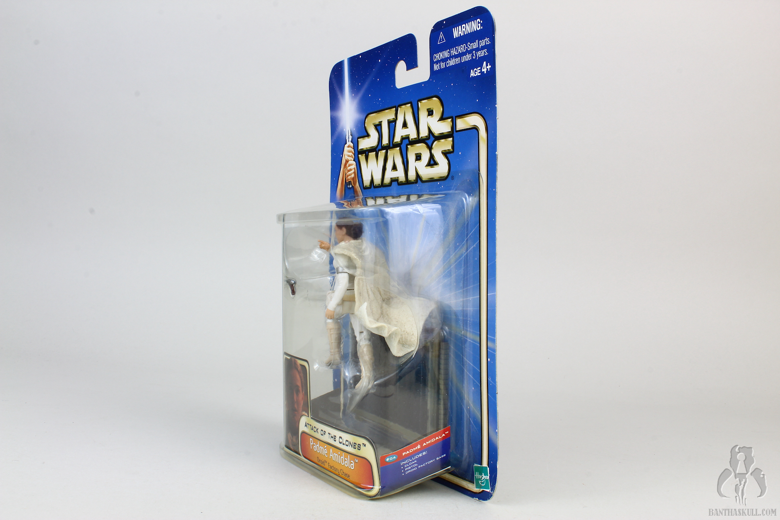 In 2003, Hasbro made another attempt at Padmé in her white AOTC outfit. There are basically 3 variants to this outfit, and two can be combined into one figure. First, she is wearing the clean bodysuit with shawl (head covering in hand) when she attends Shmi Skywalker’s funeral on Tatooine. While on board her yacht, she is is without the shawl, but then wears it one more time when she and Anakin enter the Geonosian Hive and falls into the factory. During the arena scene, she is without the shawl again. Up to this point, one figure with a removable shawl can achieve both looks. But after her run in with the Nexu, her bodysuit is ripped and she has the claw wounds on her back.
