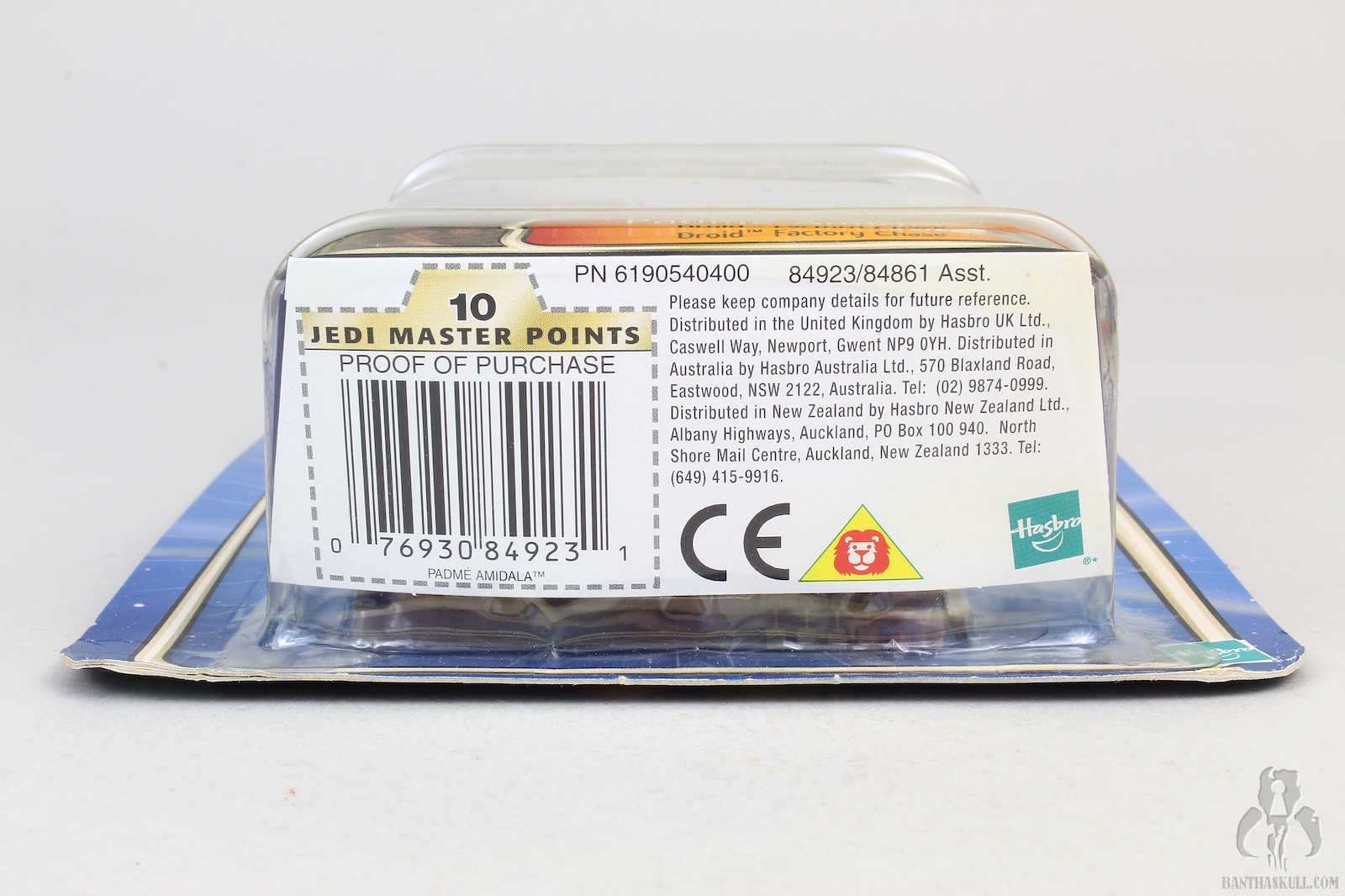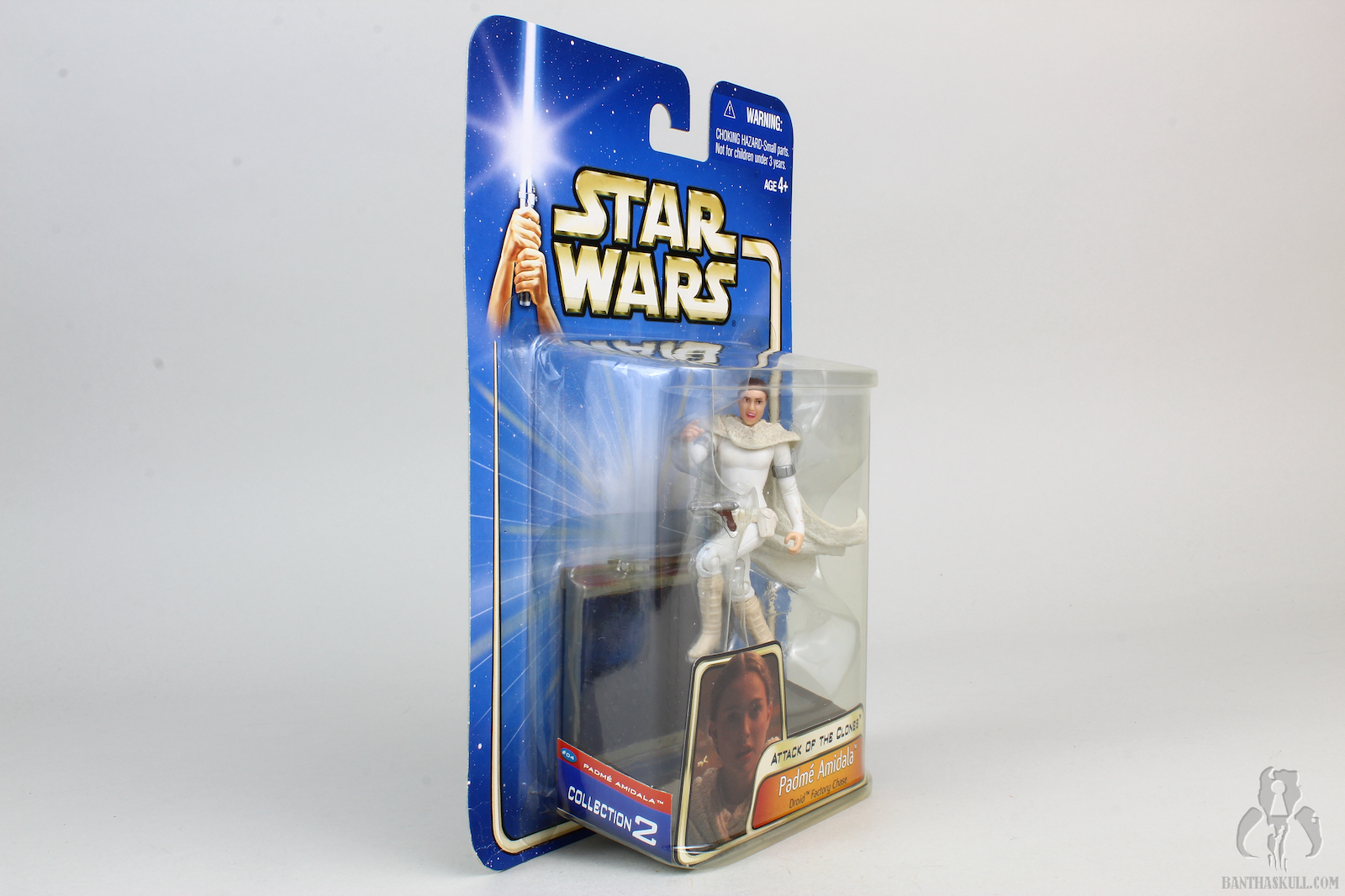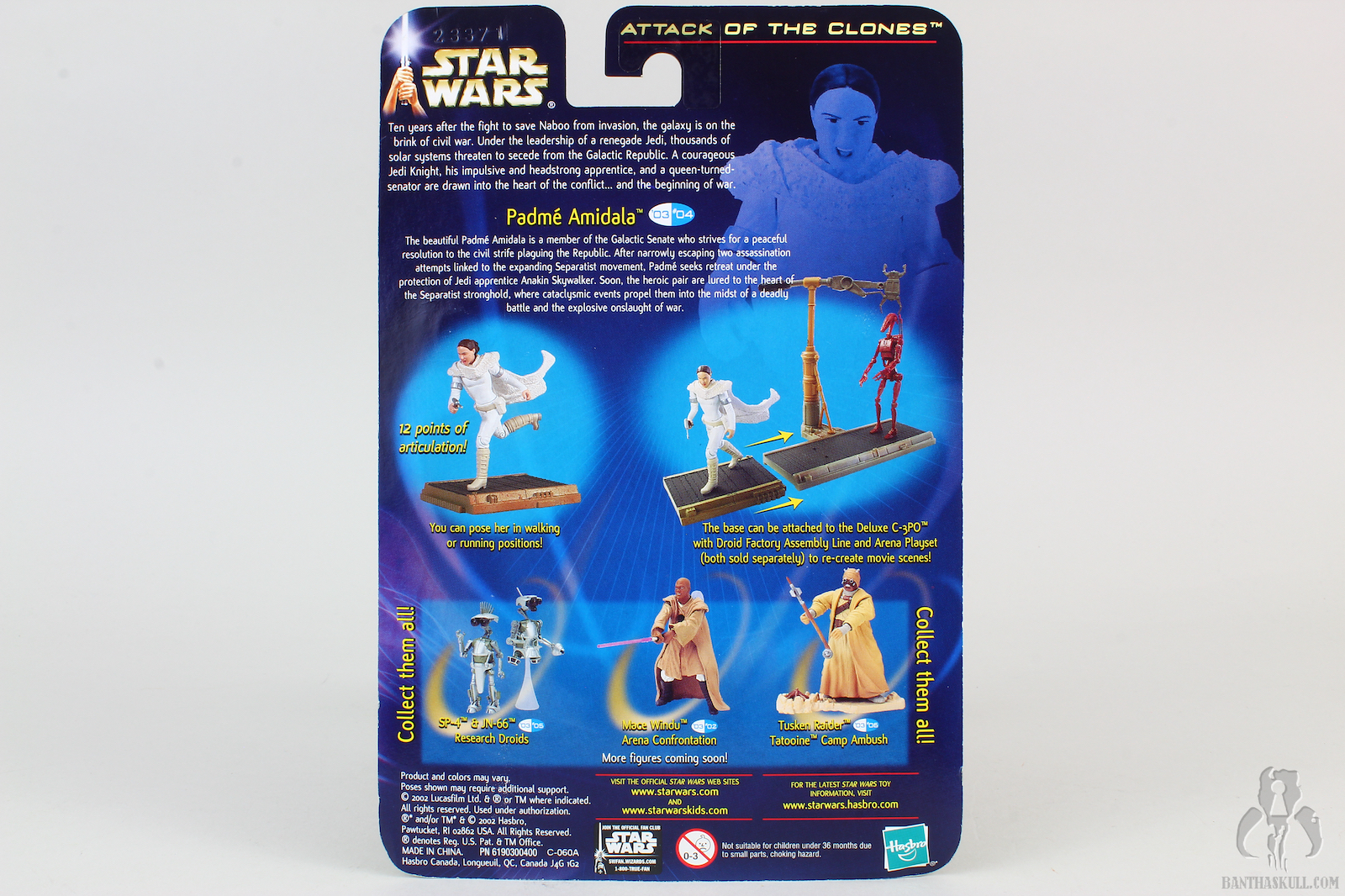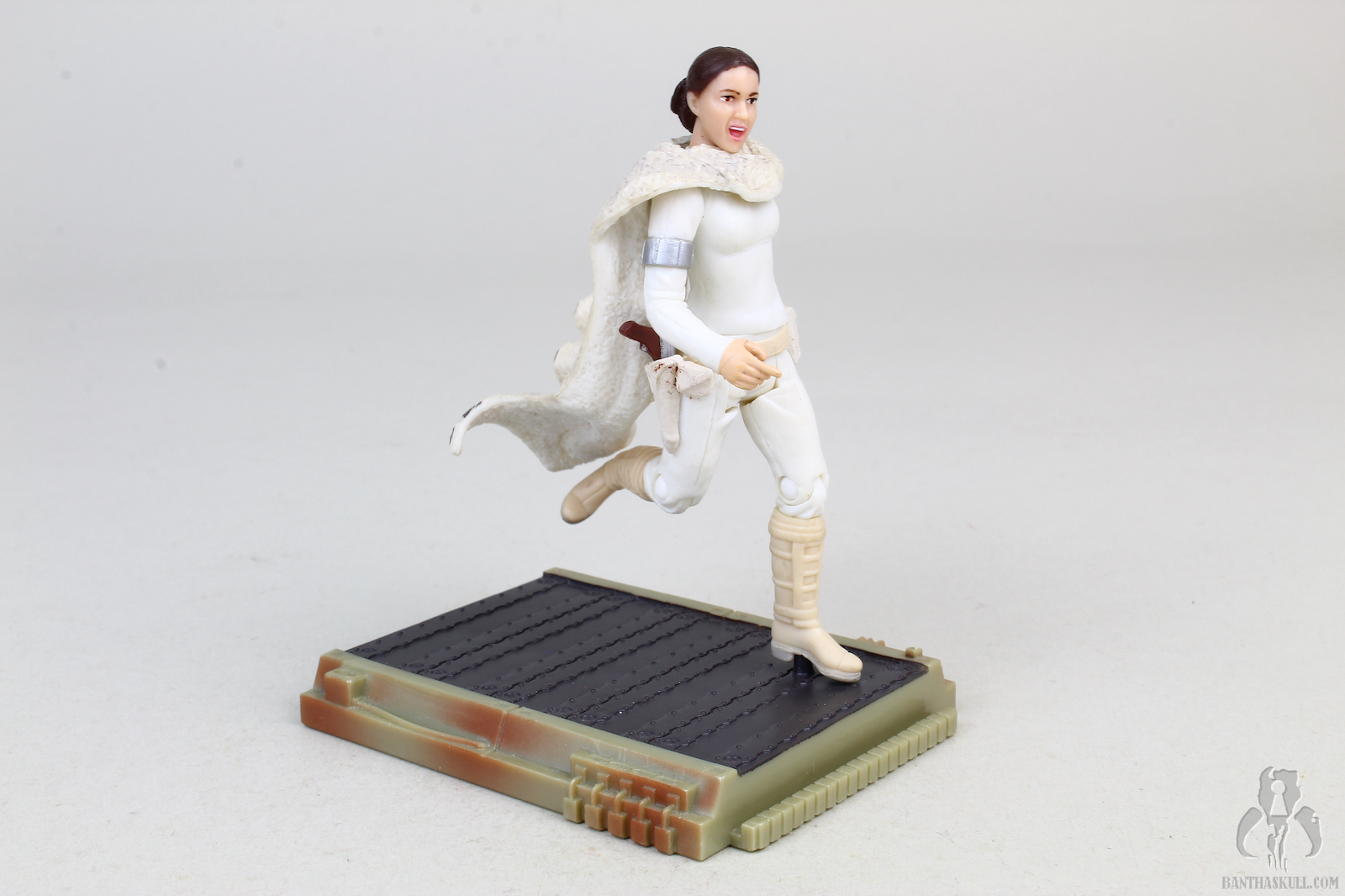 This one has better articulation and a better sculpt, while it lacks an action feature (spring loaded arm). But sadly, it’s preposed (sort of) to be in a distressed situation. To be fair, Padmé was most definitely in distress during the factory chase scene. And the flowing shawl is intended to help give the figure a vibe that she is in motion. She also comes with a rather alarming face sculpt. It’s alarming in both the sense that she is alarmed, but also that it should be alarming to the collector looking at it. This version has improved articulation (hinged knees), but it seems to beg you pose it in a running position. Knees alone do not normally allow a figure to run. Fortunately she comes with a stand. (More on that in a minute). Having the figure stay upright is a bit of a challenge. Maybe my 17 year old figure is just a little bent out of shape, but I had a very difficult time getting it to stand up unassisted for the shots in this gallery. I’m glad to be able to move on with my life.