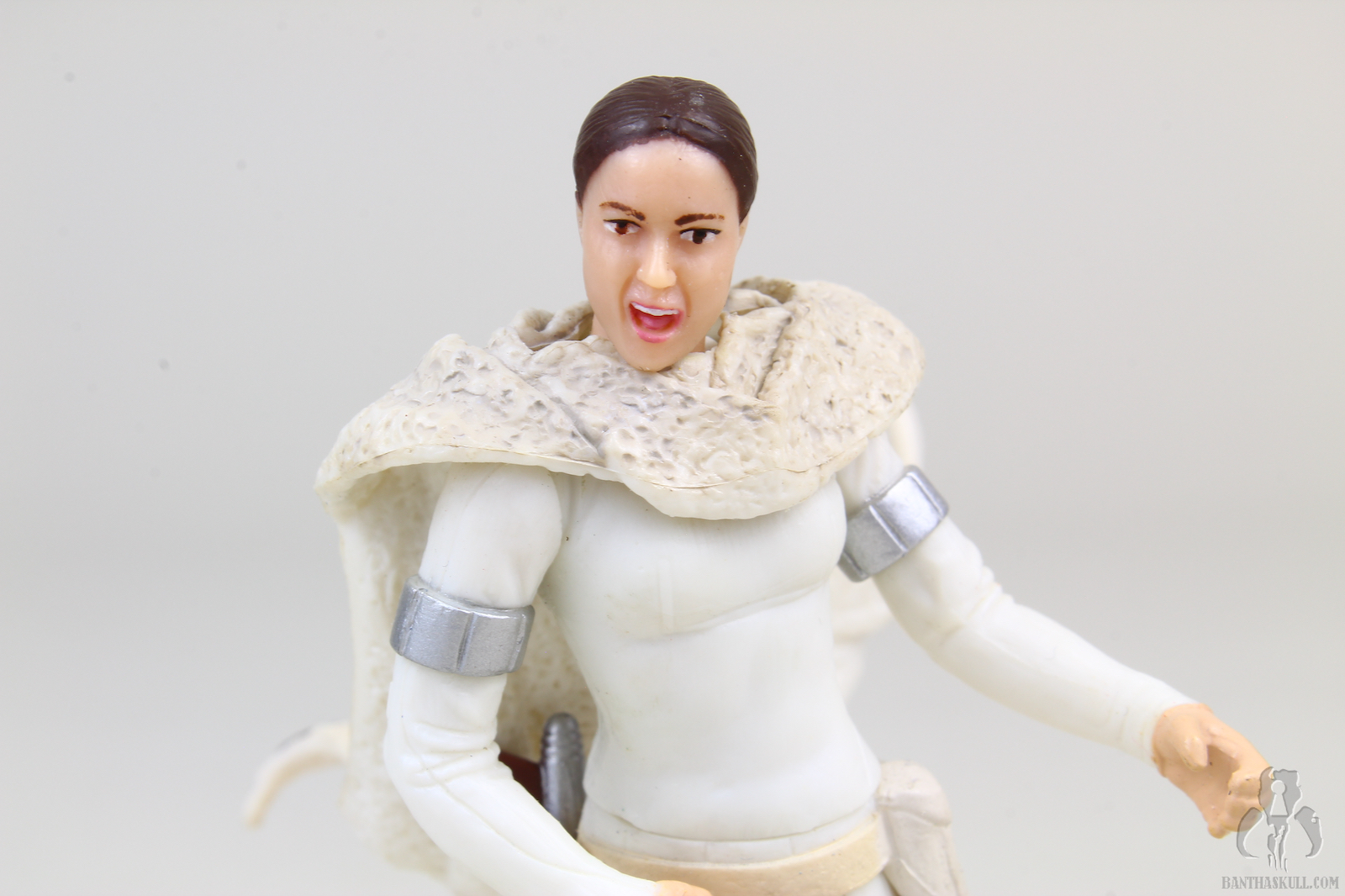 The first figure of this outfit was attempted in 2002 with 02-02 Padmé Amidala (Arena Escape). That figure captured the post-Nexu look. Hasbro got the outfit and claw marks basically right, but the figure was just…awful. Their second attempt was this figure, and Hasbro looked to get her pre-Nexu look. This time, her bodysuit is complete, she doesn’t have the claw marks, and she comes with a shawl. Again, they got the look right, but the figure is just…awful. Definitely a lot less awful than the previous release, but still…awful.