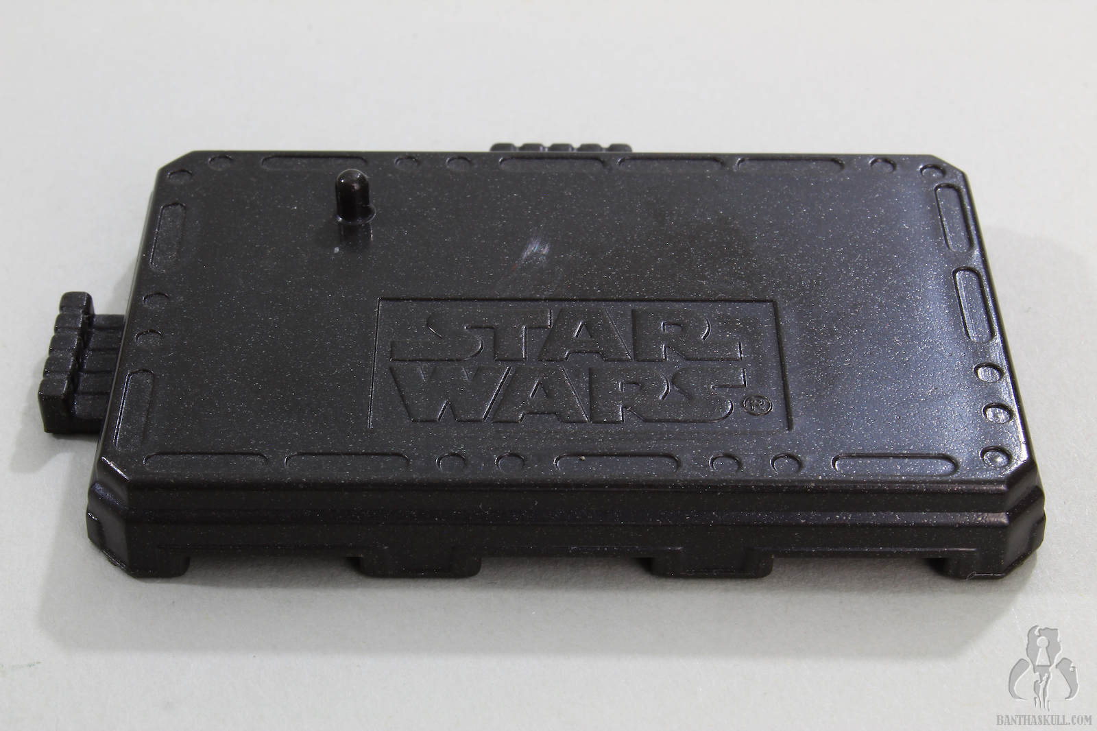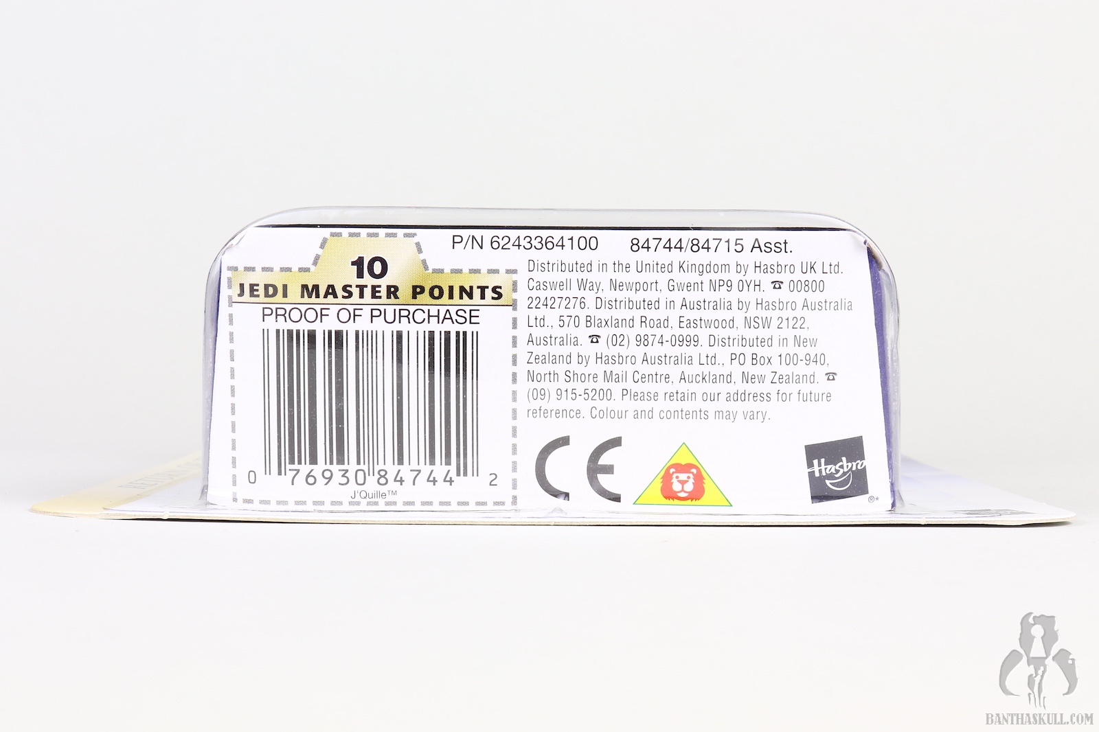 J’Quille comes with a weird rifle, that is reminiscent of some WW1 machine guns. He can grip it reasonably well in either hand, but there is insufficient articulation in the arms to allow you to pose it in a realistic manner. This type of rifle really requires a THWG, and that just isn’t possible here. Of course, the weapon is made of very soft plastic, so you could probably bend it into a THWG position, if you wanted to try. Also, as with most of the figures in this phase of the Saga line, J’Quille comes with a dark gray/black figure stand, embossed with a generic Star Wars logo.