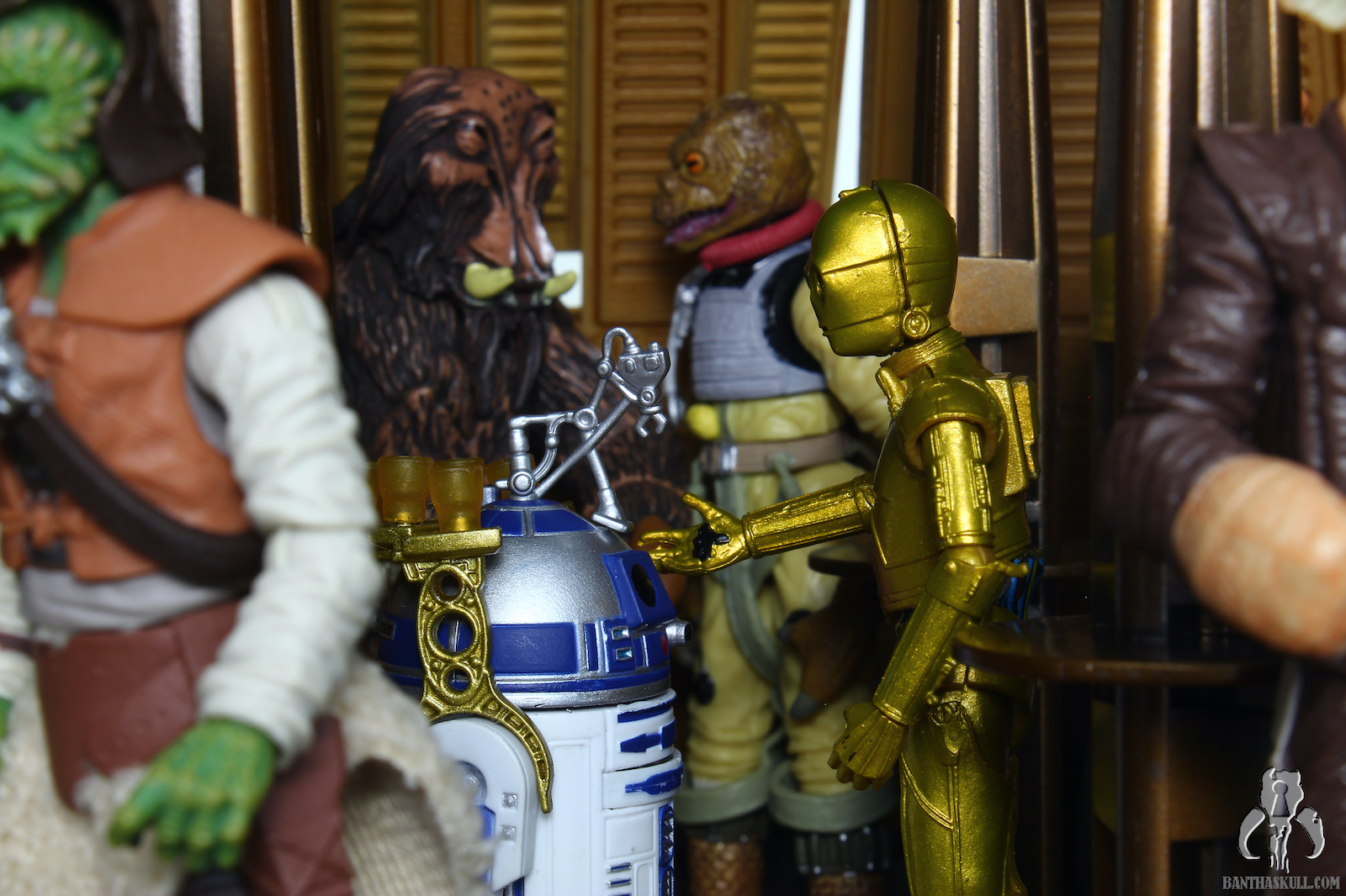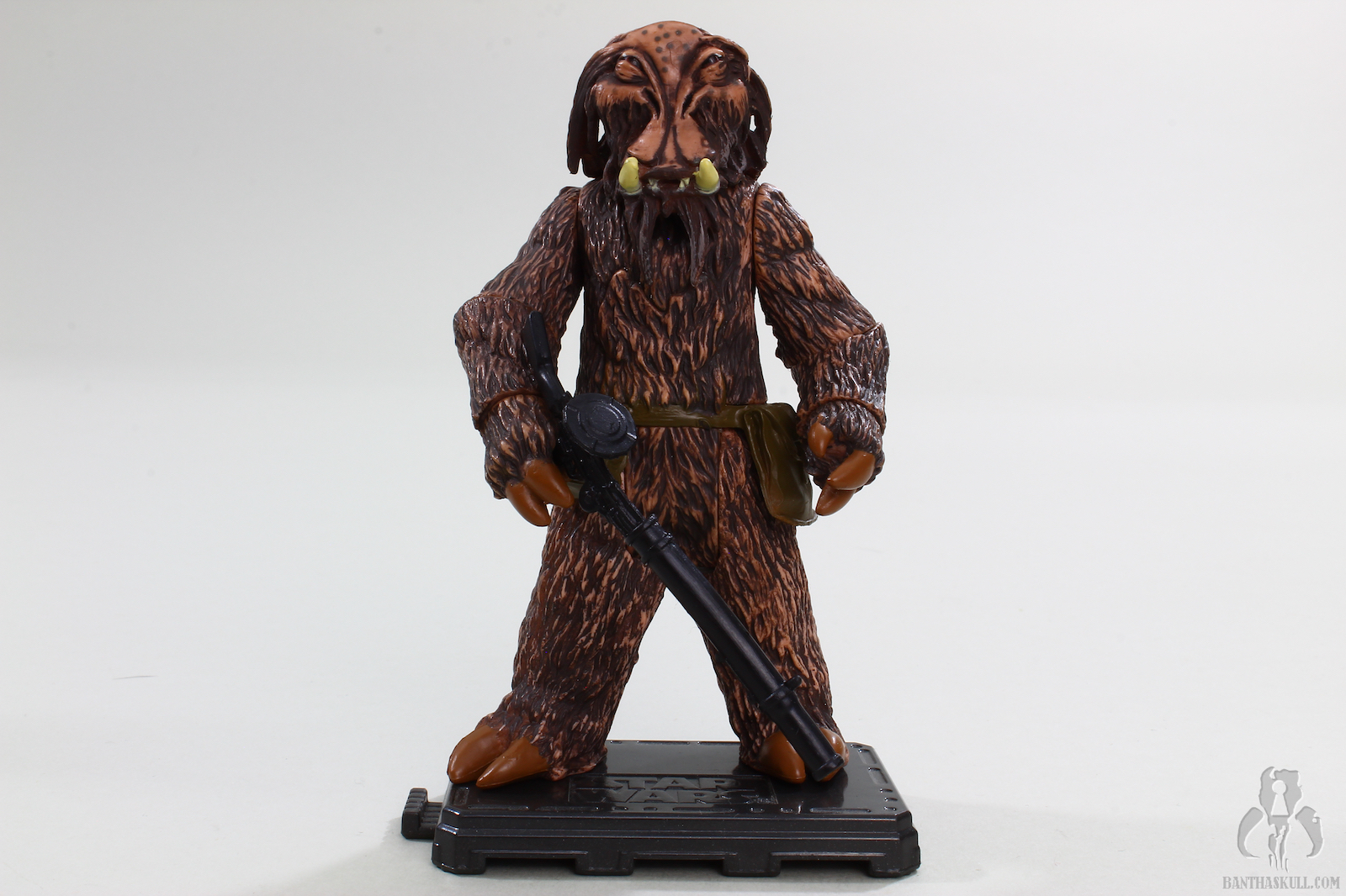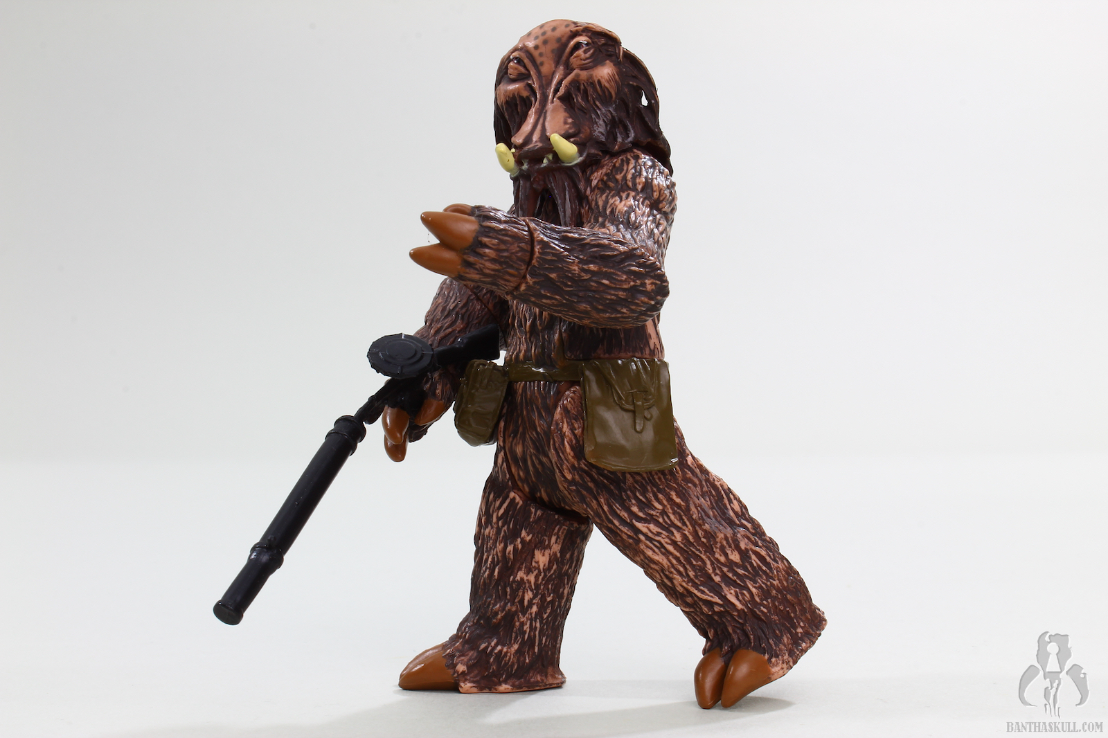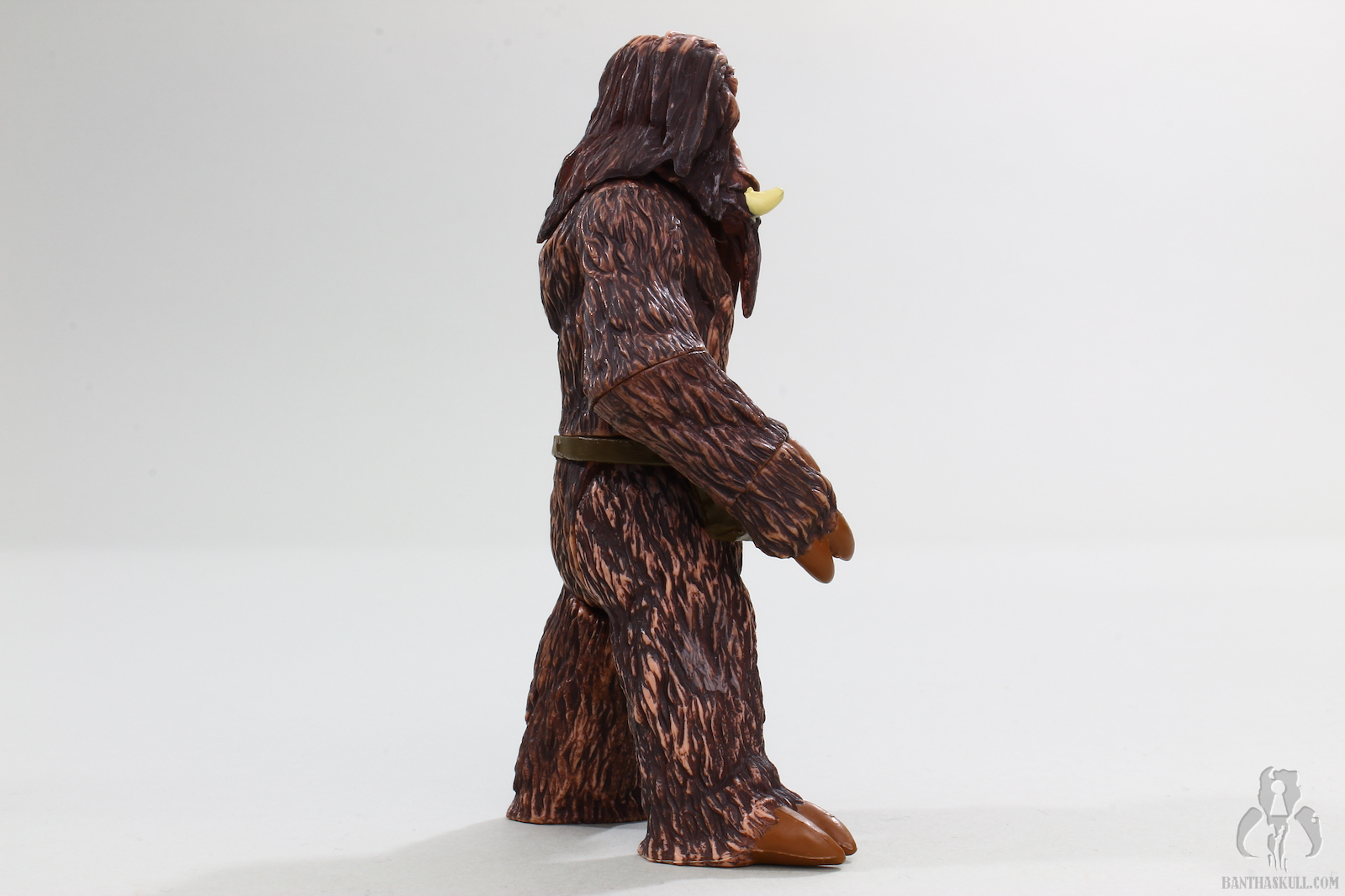 J’Quille is a rather large figure. The body stands taller than most other figures, but is also pretty thick. He’s got a huge, ugly, and toothy face, which is appropriate for the species that we see on screen. The paint applications on the face really bring out the details of the hair, eyes, and tusks. The body is covered with hair, and we get a nice bit of paint washes to highlight the sculpting details throughout. The figure is a far cry from having modern articulation standards. He’s got swivel joints at the neck, waist, shoulders, elbows, wrists, and hips. The swivel/cut articulation at the elbow is usually better than nothing (take that, 5POA!), but the frustration experienced trying to make useful poses is almost not even worth it. As far as legs, there is no real purpose to the hip joints without knees or ankles, but they do help get the figure solidly planted with feet flat on the ground.