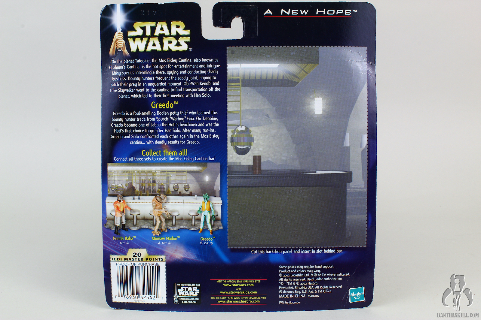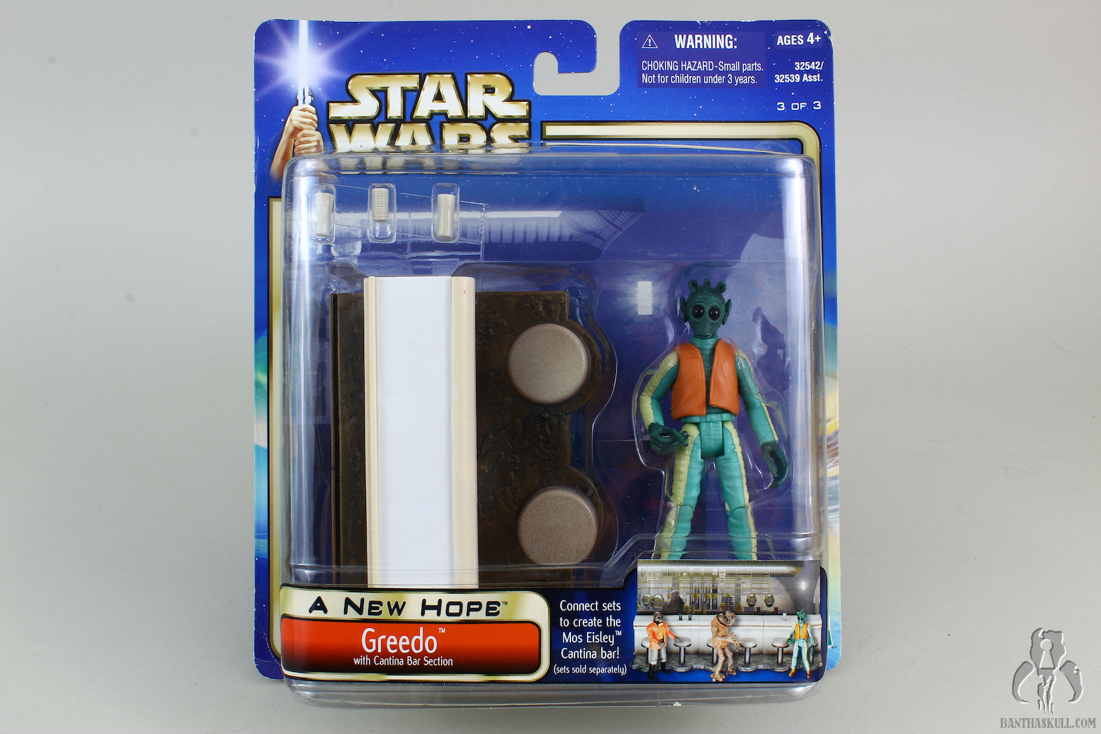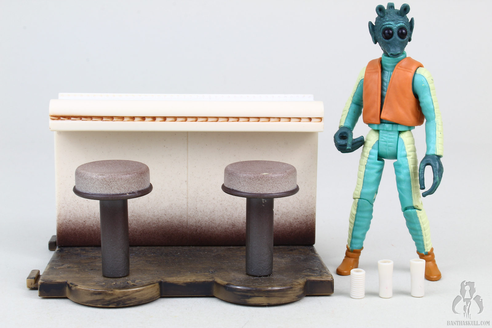 Each of the three sets included a cantina figure, 3 bar glasses, and most importantly, a cantina bar section. The Greedo figure was a repaint of the POTF2 Commtech release. It wasn’t bad for the time. It had basic articulation with added hinged knees, allowing the figure to assume a realistic seated position. The left hand is able to grasp the bar glass accessories, although the closed-grip right hand is still only good for holding his blaster (not included here). The three bar glasses are 2 different sculpts, and were included in each of the 3 cantina sets.
