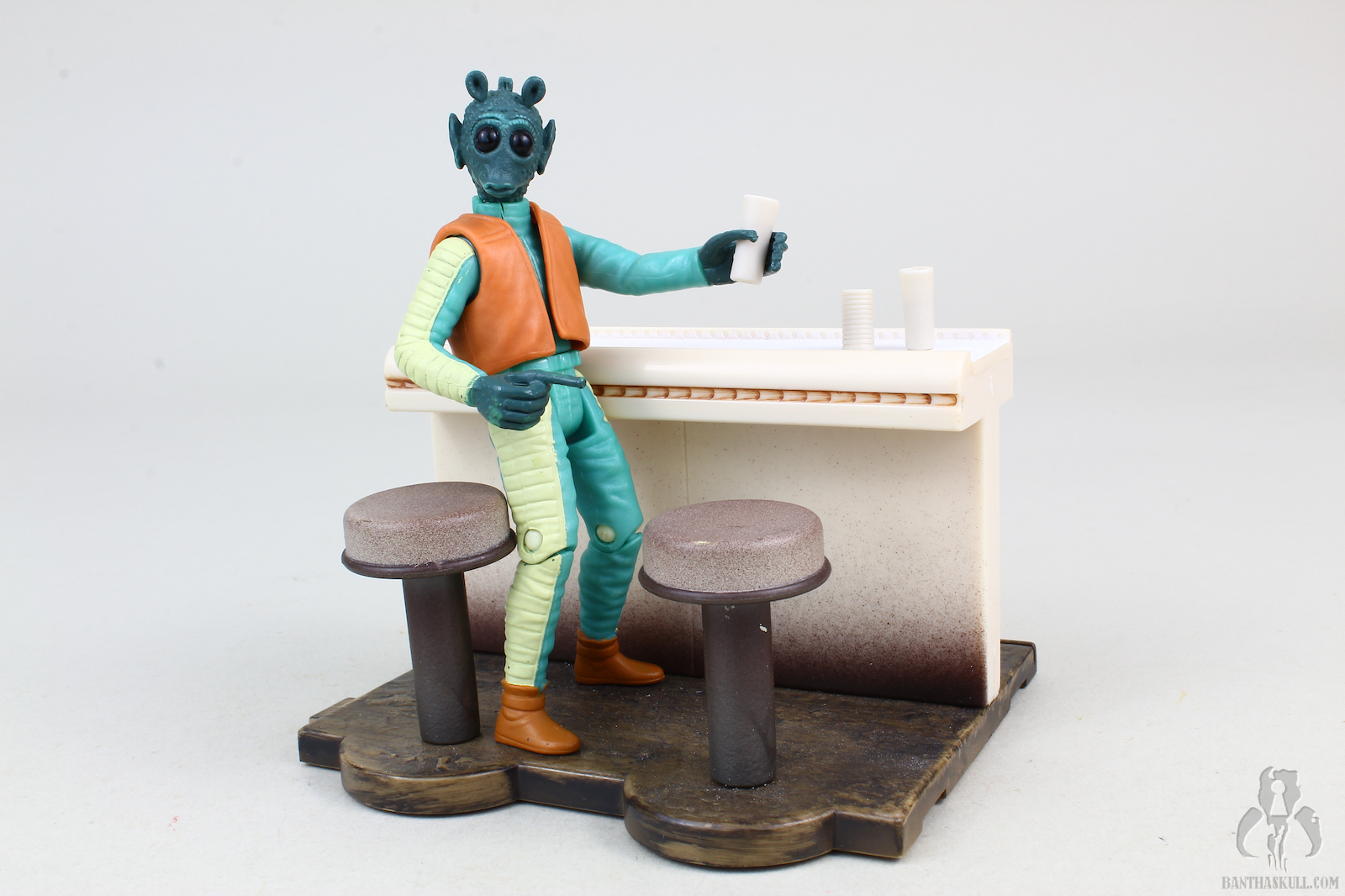 The figure is okay. It deserves a 5, but was rendered mostly obsolete by the VTSC release (unless you swap vests.). The bar section is also pretty cool, although the stools are frustrating. Putting them all together does give you something worthwhile, although you could also get the straight sections in the OTC Cantina Screen Scenes, if that’s your bag. More on that another day.