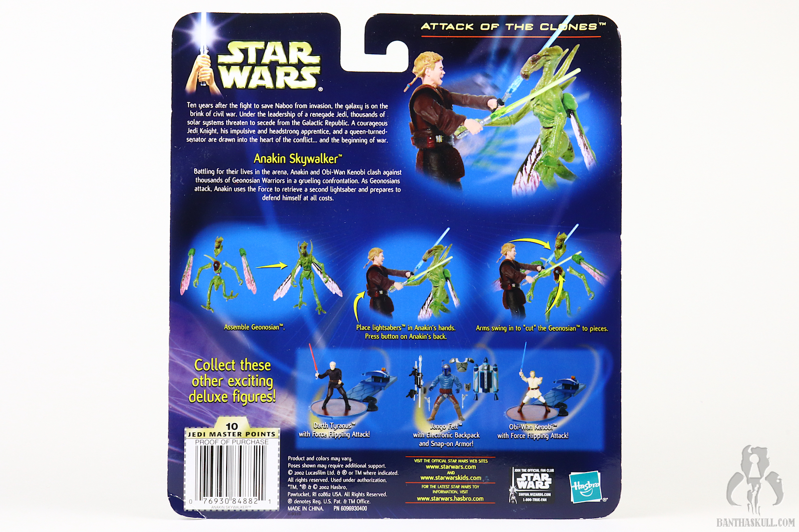Anyway, the Anakin figure is bizarre, but it does sort of live up to the “slashing action” label. Yet another action feature by Hasbro puts a button square in the center of Anakin’s back, which activates both of his arms in a way that would allow him to perform a “pass incomplete” motion. Hasbro obviously loves football, as they also produced the 02-36 Obi-Wan Kenobi (Starfighter Pilot’s) action feature that signals a touchdown. With blades in hand, Anakin performs a move vaguely similar to the one he would use later in ROTS when he beheads Dooku.