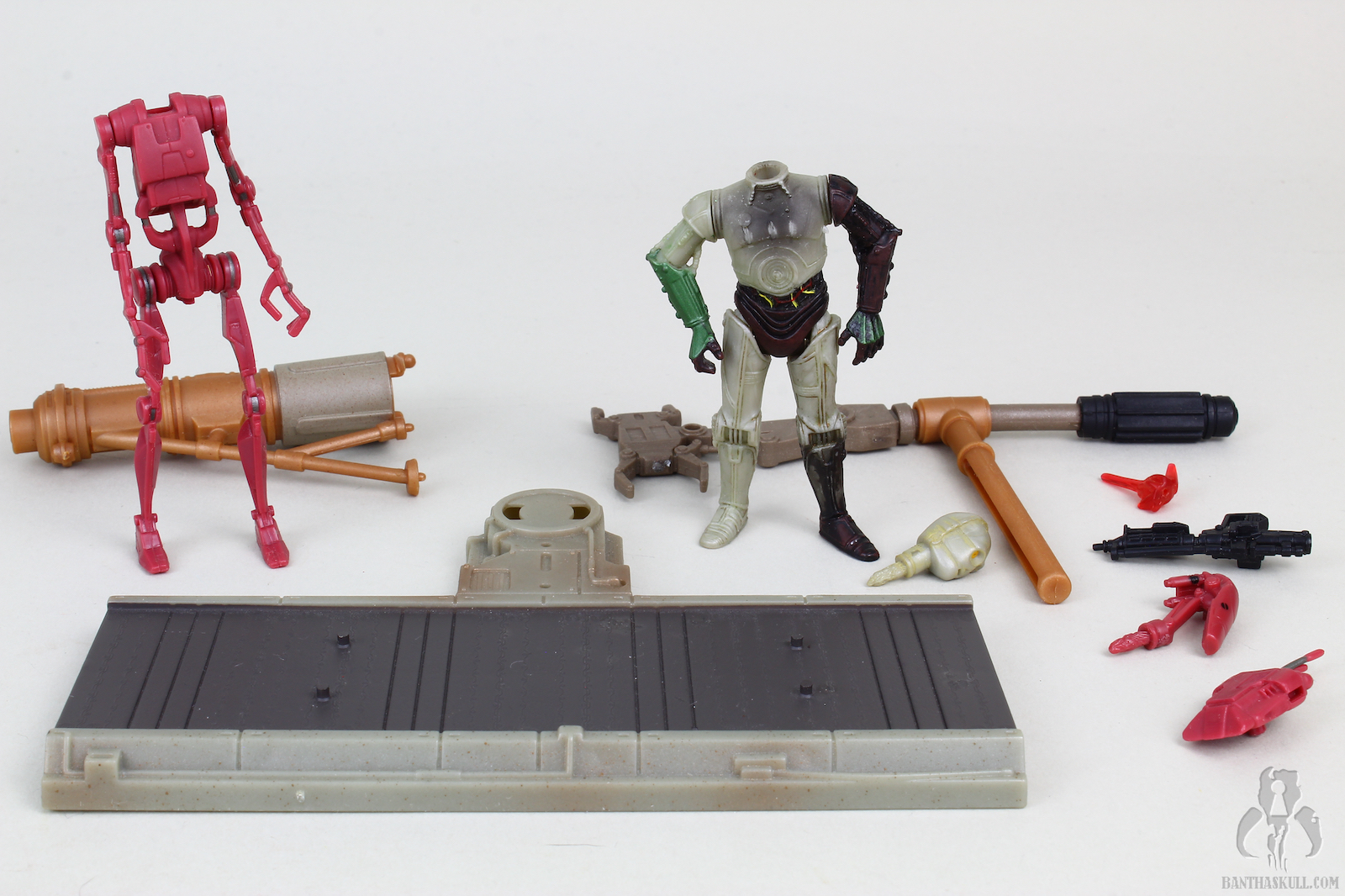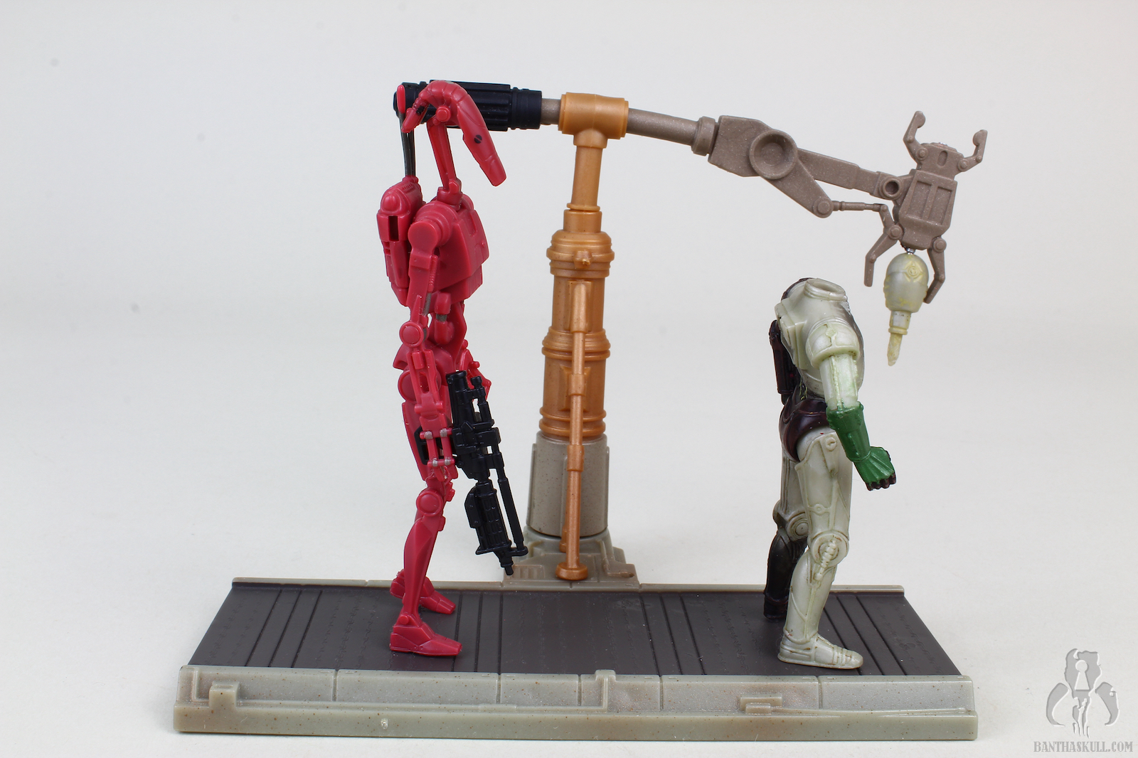 The conveyor is modular, and is meant to attach to several other pieces of the Geonosian droid foundry. The features work fairly well, with a little patience, but the adult collector should simply appreciate the modular aspects of the set. The two droids are outclassed by later releases, but the magnets in the heads give them specific value to this set.
