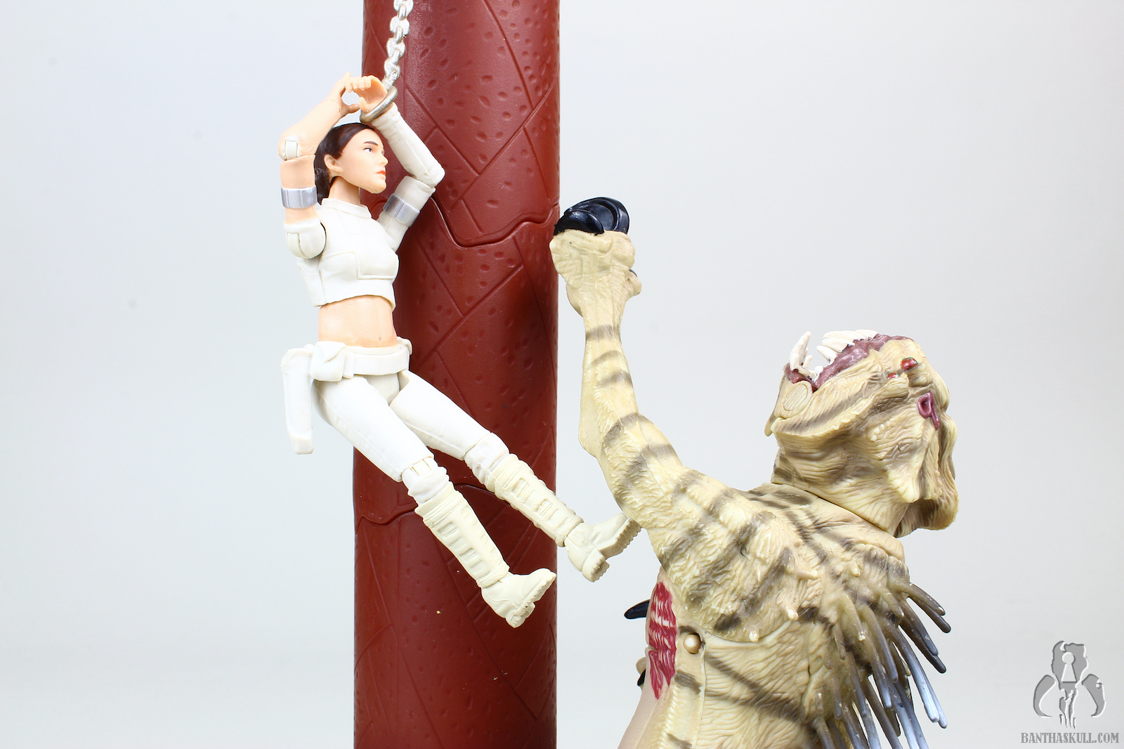 The Nexu was guided towards Padmé, as she was chained to one of the pillars. Fortunately for her, she seemed to be on top of things, and managed to climb the column to relative safety. Unfortunately for her, the Nexu was capable of using its large claws to also climb the column. It took a mighty swipe at Padmé, and in the process, invented the “wardrobe malfunction.” Padmé got a bit of revenge when she donkey-kicked Nexu right in the belly. Take that, cat!