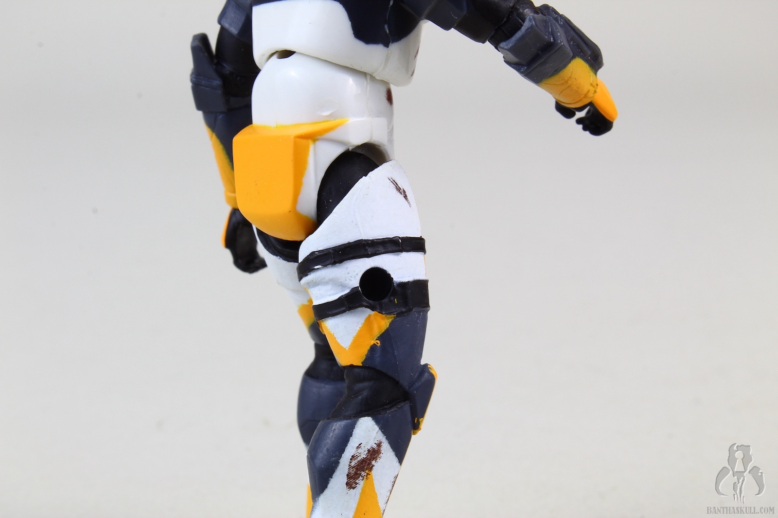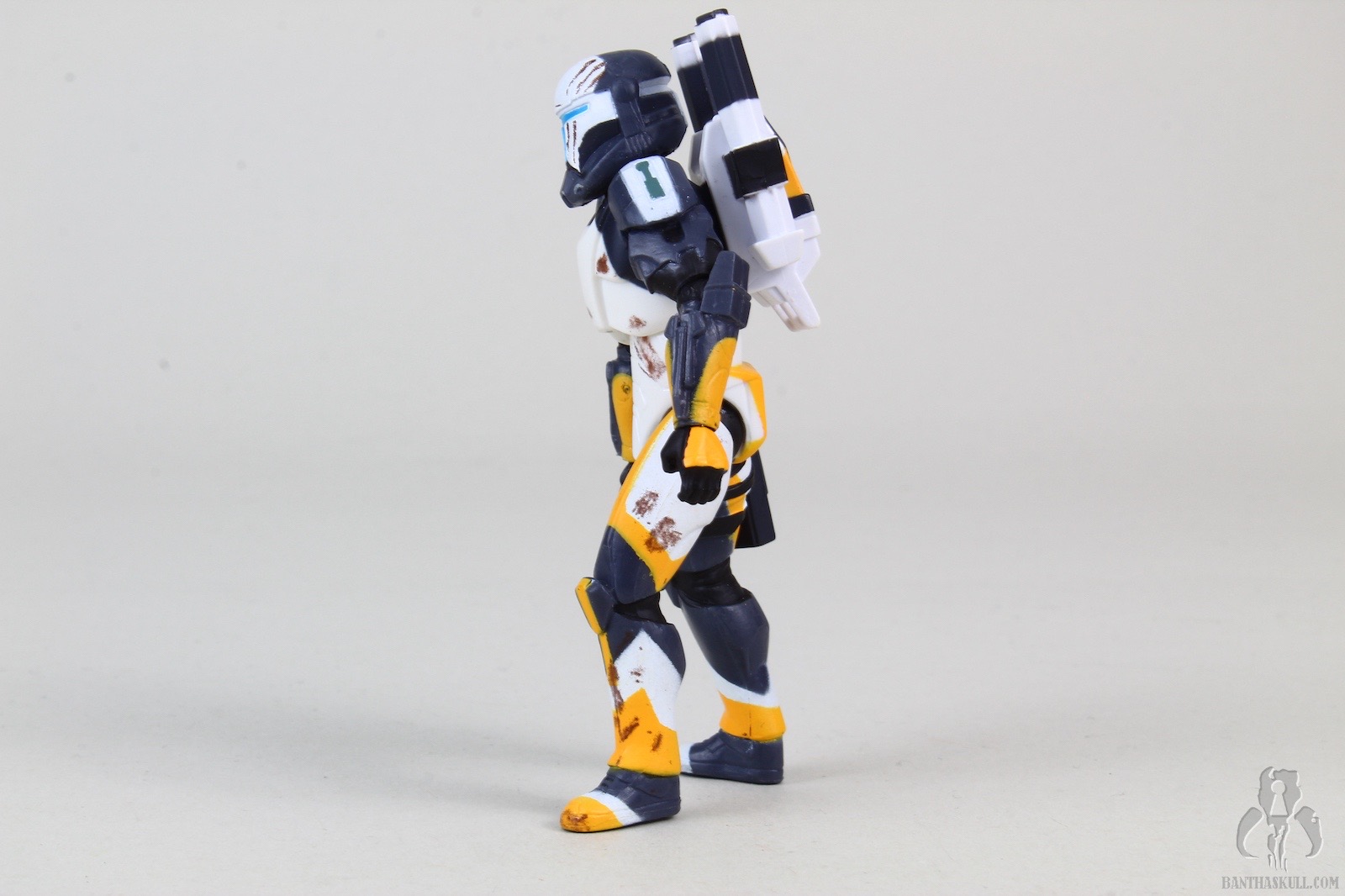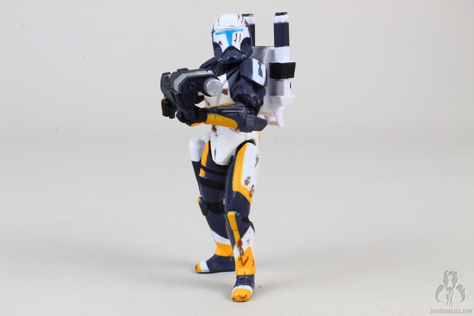 The colors and patterns on the armor are striking, and unlike any clone design previously seen. The paint is applied fairly well. The helmet style was all new in the game, and gives the impression of the standard clone phase one helmet on steroids. The dirt and scoring on the figure are pretty great as well. The marks on the helmet could almost be the inspiration for the bloody handprint on Finn’s First Order helmet. The blue visor is a great touch as well. You could almost see the HUD as you imaging being on the other side of the helmet.
