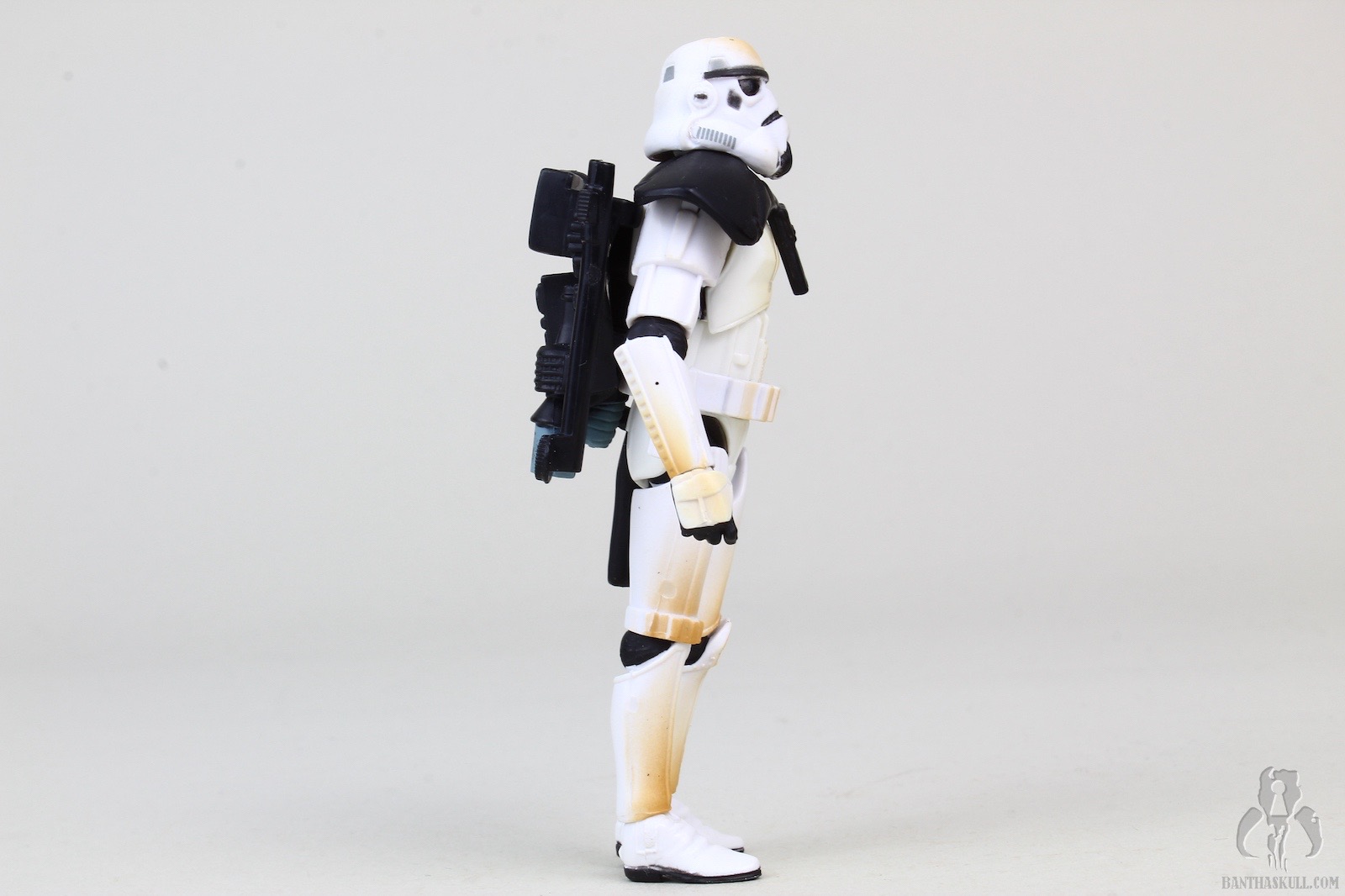 The figure is based on the VOTC stormtrooper from 2004. At the time, people dug that figure. And back in 2004, when we were idiots, that made sense. But it didn’t age well. Chris (and I) have droned on and on about how terrible that figure turned out to be, and morphing it into a fake sandtrooper didn’t help the situation. The narrow stance, rigid hands, and awkward helmet hurt the figure to begin with, but then things got worse.