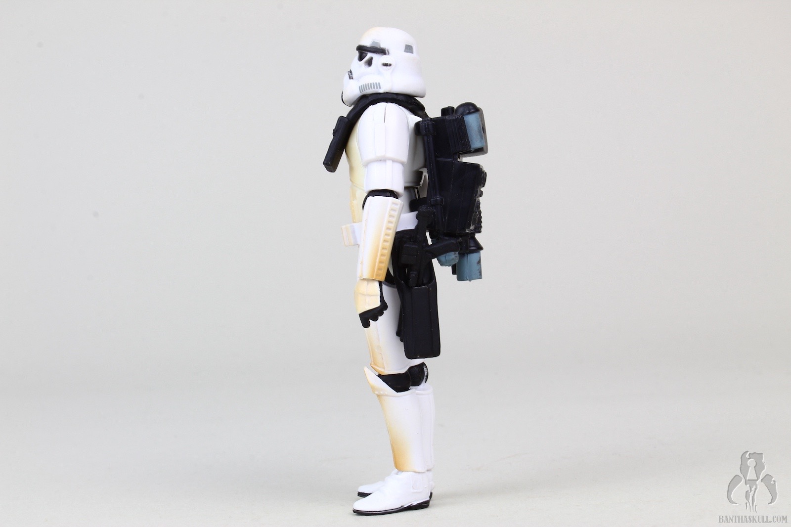 Here, Hasbro added the dreaded “back slot” to accommodate the sandtrooper backpack, and also tweaked the belt to accommodate a removable rear canister (which can’t be worn at the same time as the backpack). There is, of course, the removable black pauldron (not to be confused with a Black Cauldron) denoting this as a corporal. He comes with a blaster, which can be awkwardly holstered, as well as the Animal Abuse Pole to subjugate some poor dewback. It’s all topped off with the ubiquitous Saga Collection figure stand.