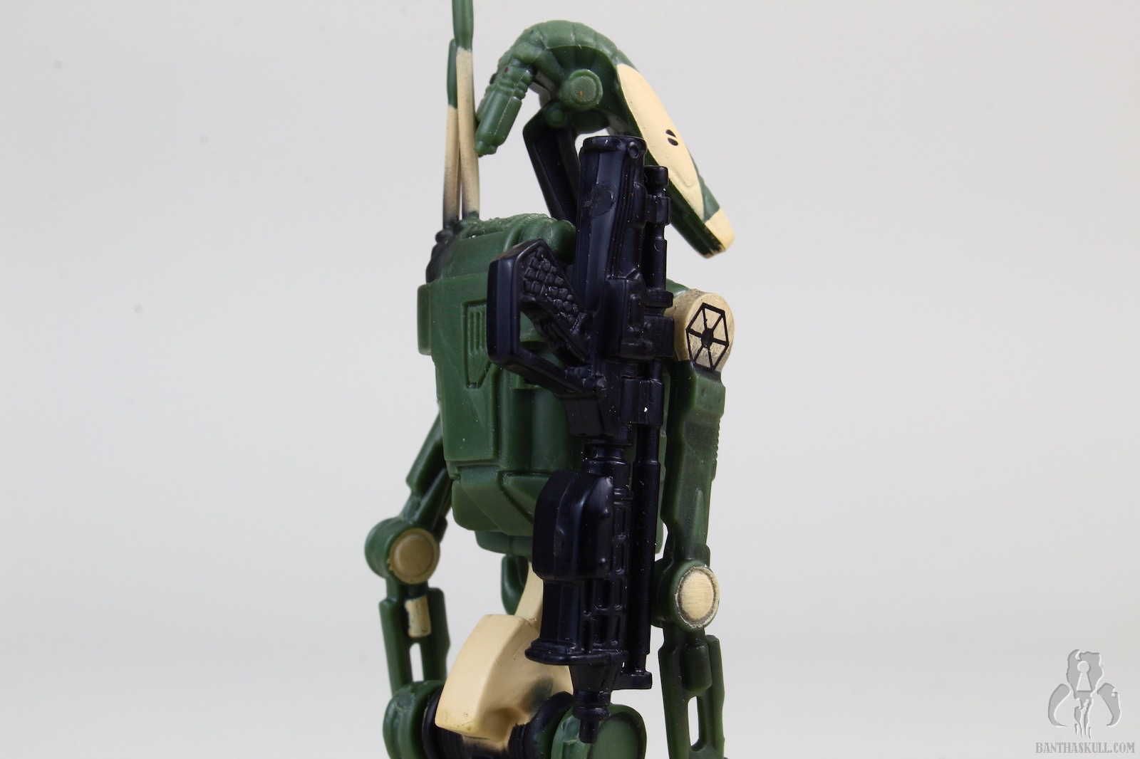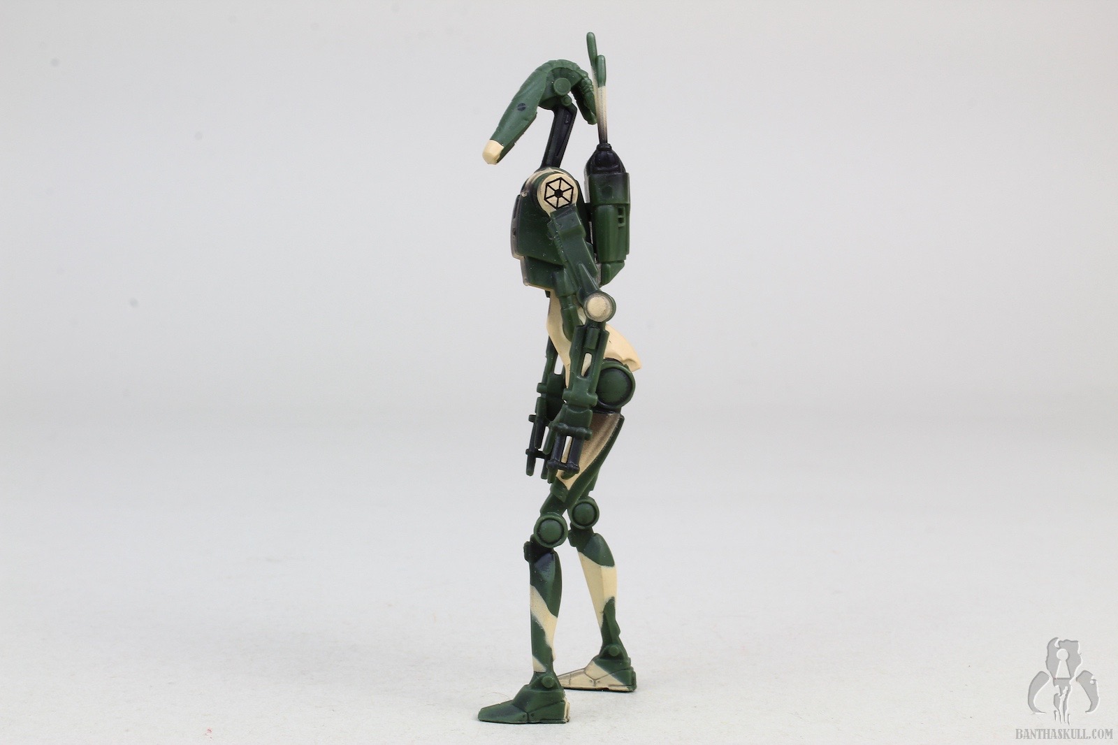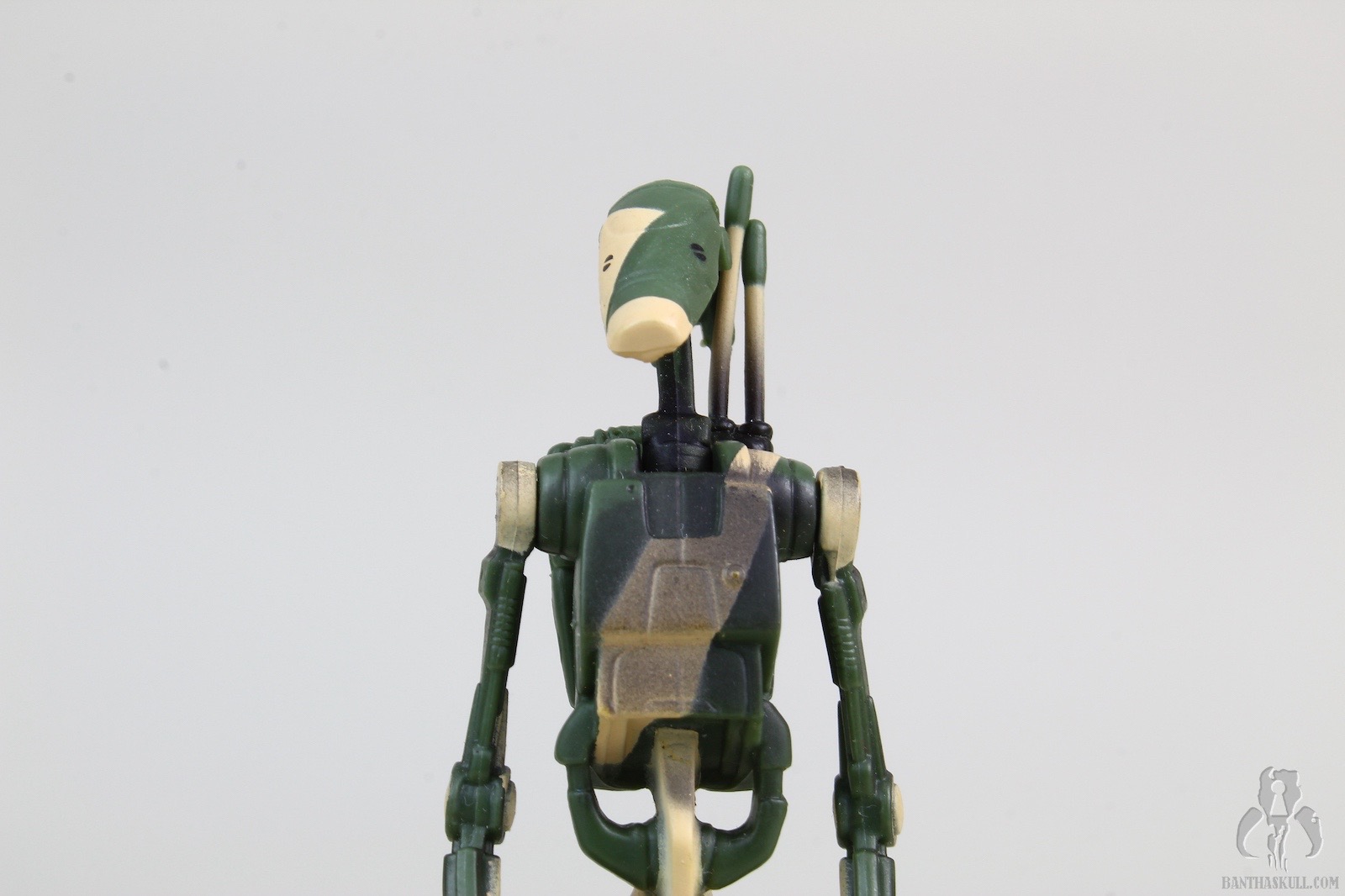 Aside from the camouflage, the battle dorid figure itself is awful. It is 5POA (swivel neck, shoulders and hips). It can barely hold the included blaster, and definitely has no shot at a THWG. You’re lucky if you can get it to stand upright unassisted. Getting both to stand together is a near miracle. Over time, I assume many loose samples require figure stands in order to not topple over. The backpack is removable, and do have the notch that holds the blaster, a feature that devolved and was lost in the TVC version. This is a repaint of the version that first came out in the 2002 SAGA Deluxe C-3PO with Droid Factory Assembly Line!. The head is removable, which ends up working for you here if you want to litter your Kashyyyk beachhead with destroyed droid parts. Kinda neat.