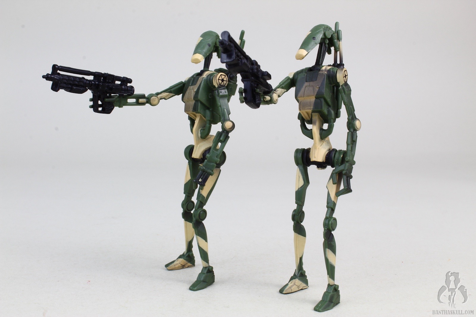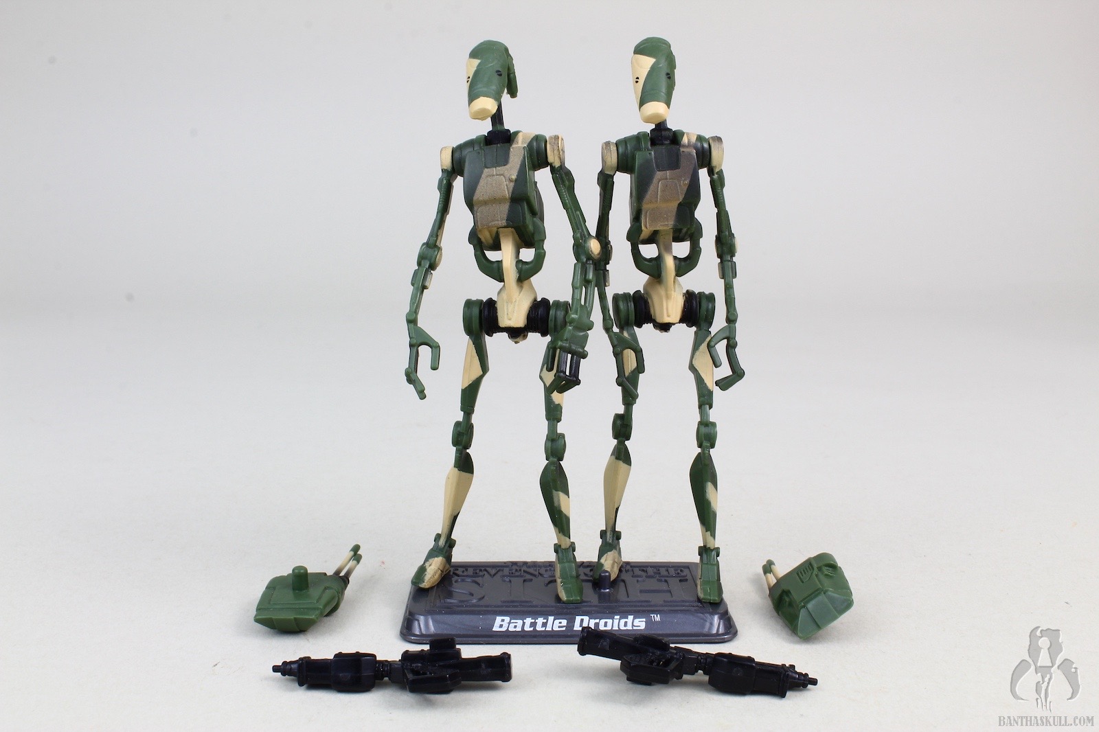 Yesterday we reviewed The Saga Collection Super Battle Droid, which was a repaint made to look like a combatant on Kashyyyk with jungle/beach camouflage. Well, a not terrible move to provide companion pieces to this scene, Hasbro turned out - you guessed it - another repaint! This time, a pair of B1 Battle Droids get the Kashyyyk camo treatment.