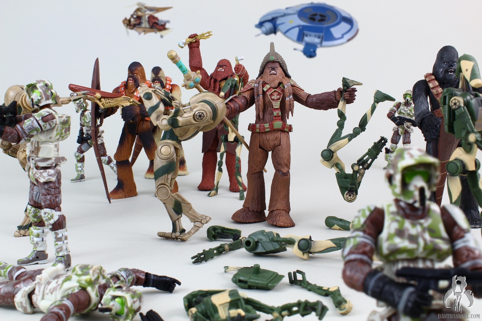 The good news is that you get a pair of droids in this two pack, so if you picked up just a few, along with a couple of the SBD’s, you’d have yourself a decent showing for the CIS forces on (imaginary) Kashyyyk. I tried watching the ROTS scene repeatedly, where the droids make their amphibious assault. There is a decent shot of a few battle droids riding into battle standing on the sides of a snail droid, but it’s so fast moving and fleeting that it’s hard to verify if those B1’s sported any kind of specialized paint scheme, or if they were typical tan models seen elsewhere. For the record, I can’t find a shot of any SBD’s on Kashyyyk, but at least the B1’s were definitely there, even if possibly painted differently.