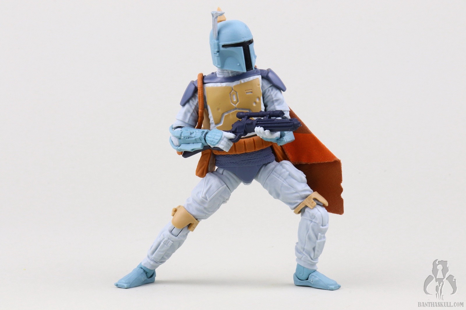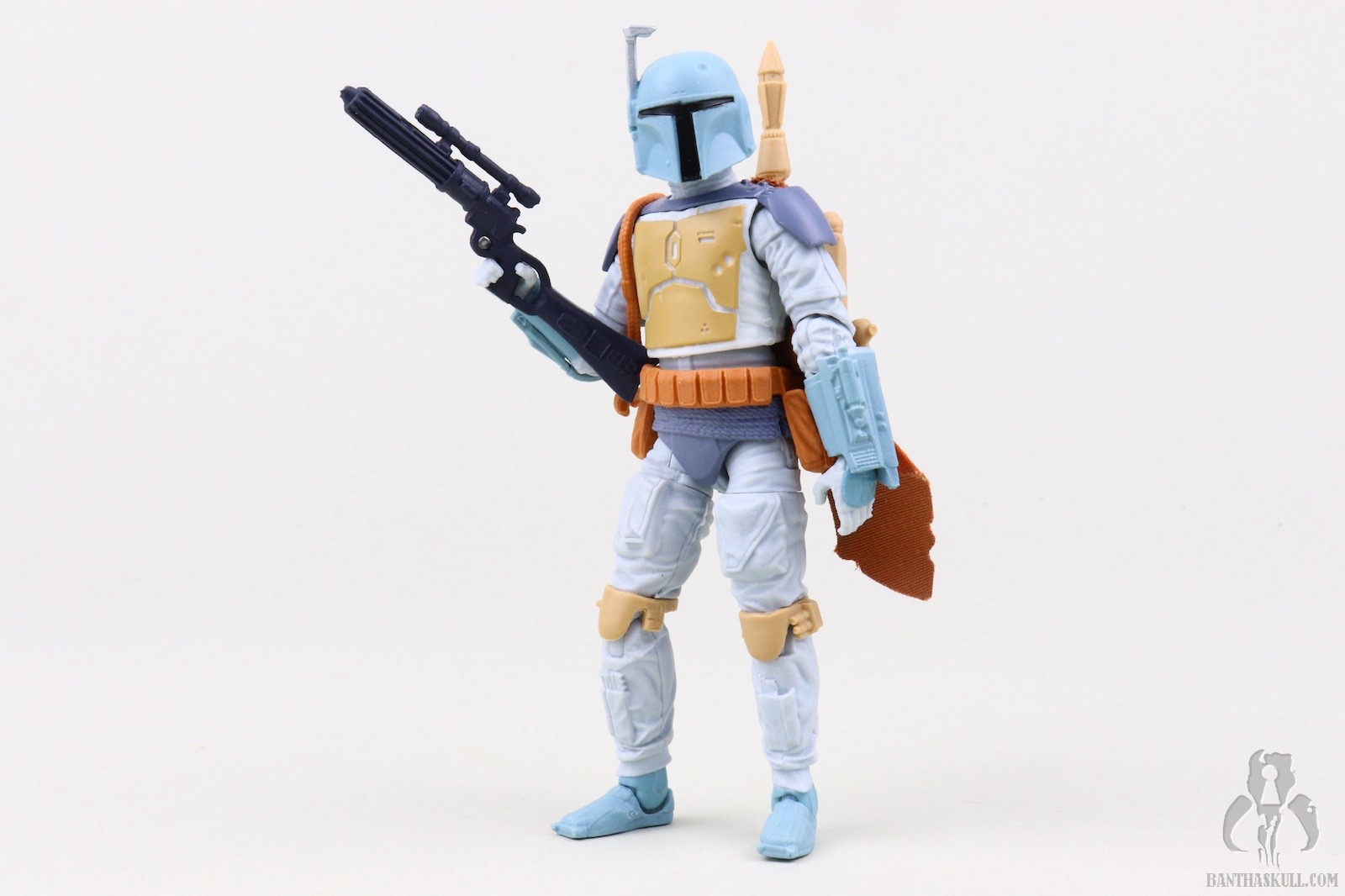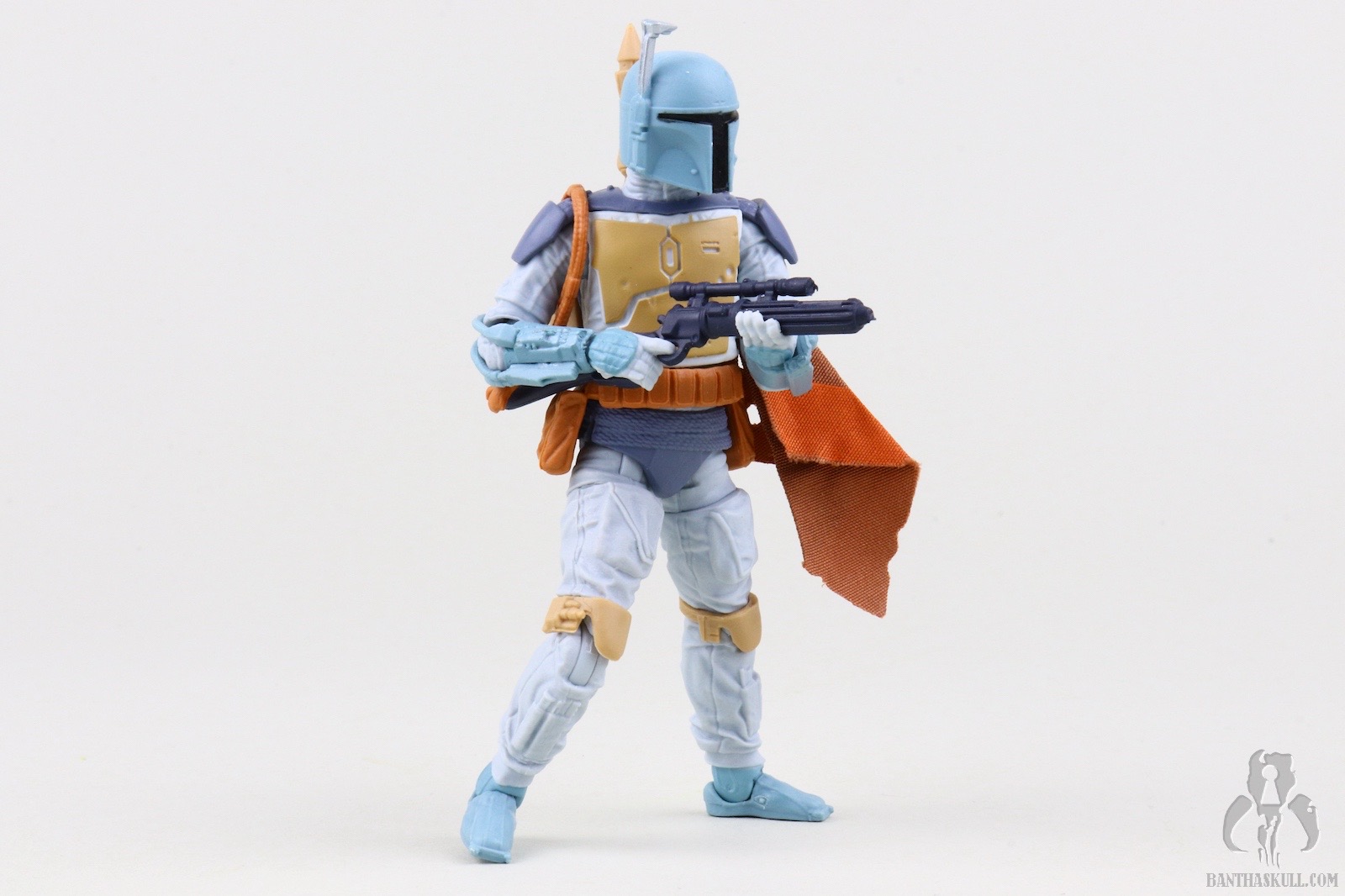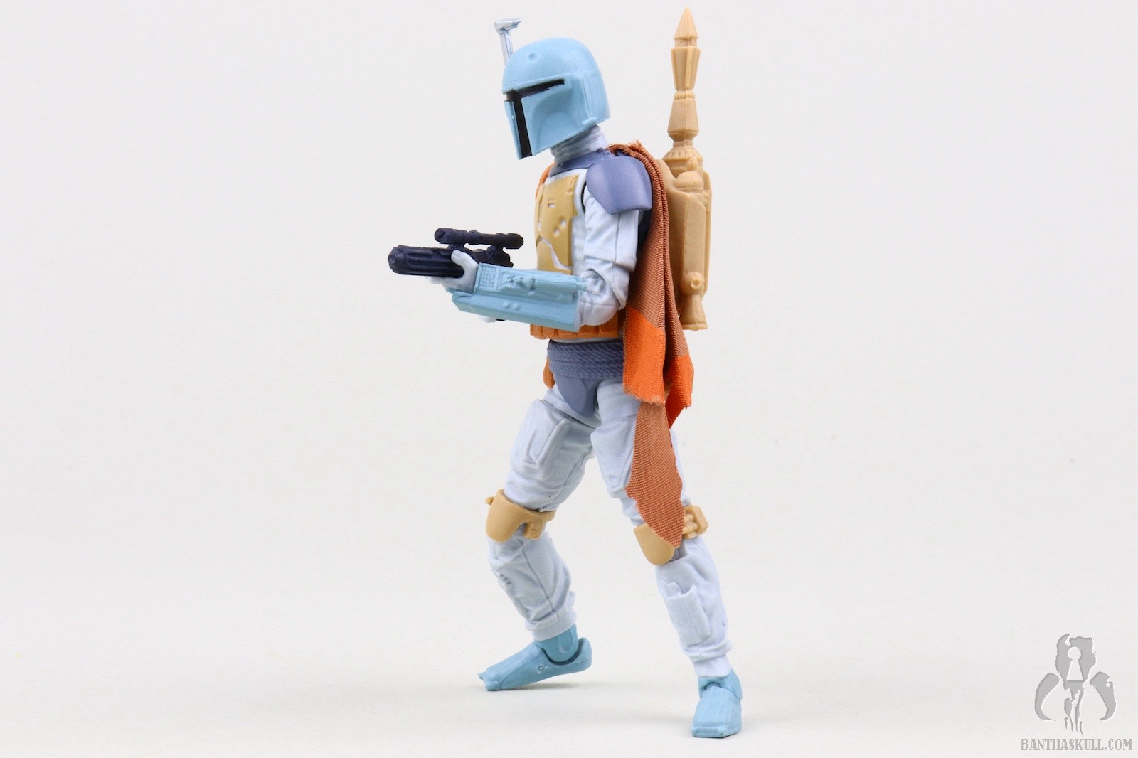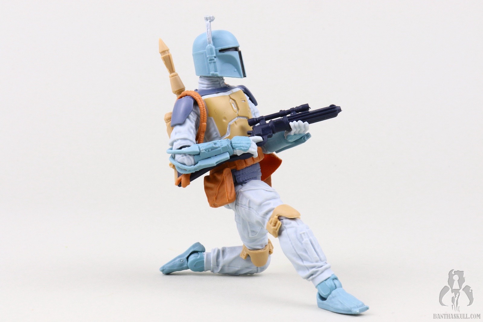 I guess I should spend a few sentences talking about the figure itself. This is a repaint of the landmark VC186 - Boba Fett. That means it’s not entirely accurate. In the cartoon, Fett wears more of an Episode V-style belt with a holster slung low on his hip. The figure has the pouch-laden Episode VI belt sans holster. The paint scheme, on the other hand, looks like it jumped right out of the screen. Previous Fetts based on the Nelvana animation took liberties to try to bridge the gap to a realistic Fett paint scheme. I love the purple-blue plastic used for the BlasTech EE-3 carbine. It’s another positive step toward the animated aesthetic. That VC186 release is graded a 10 out of 10, but I’m taking back one kadam Bantha Skull for the inaccurate belt. 9 out of 10.