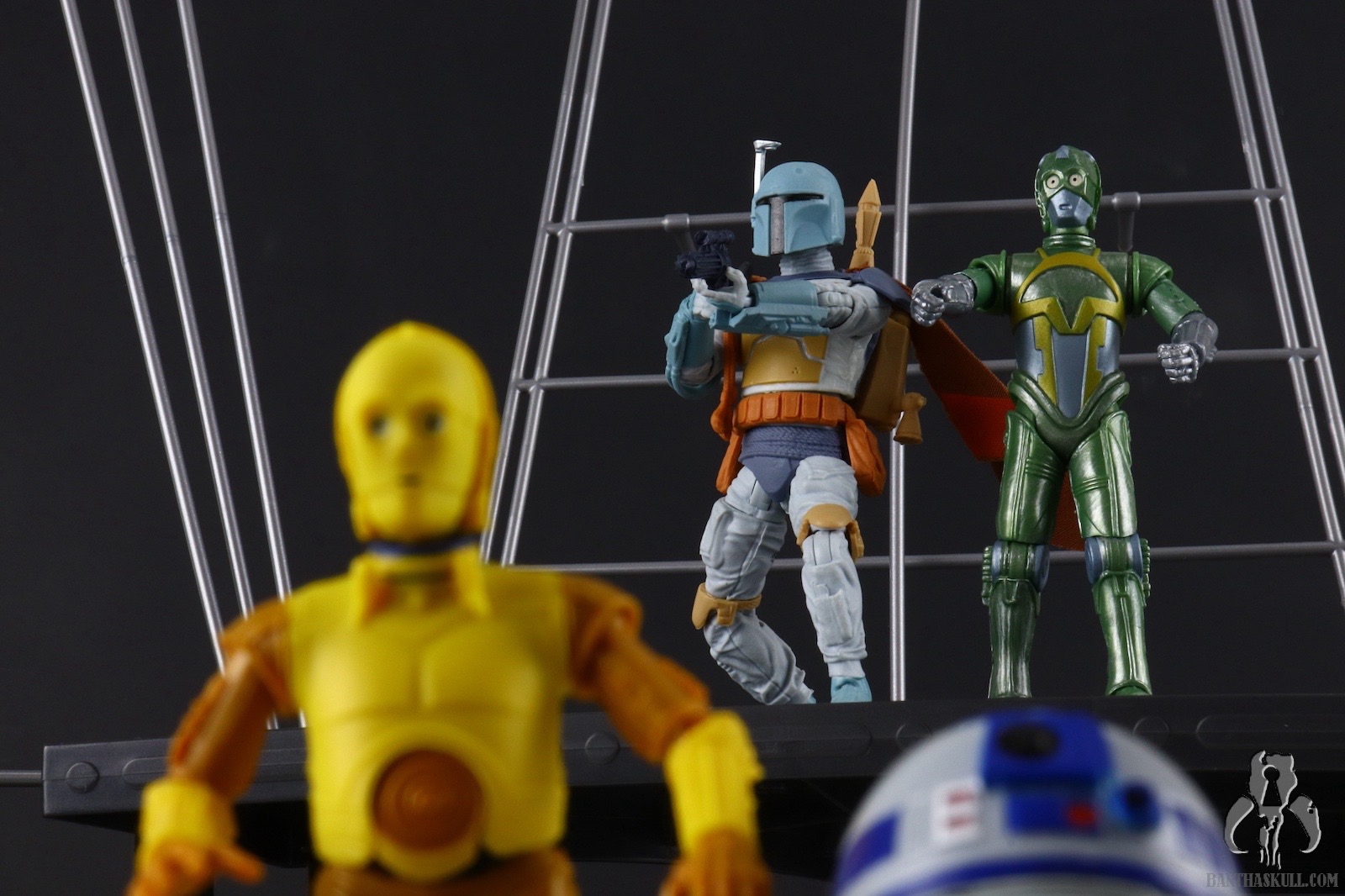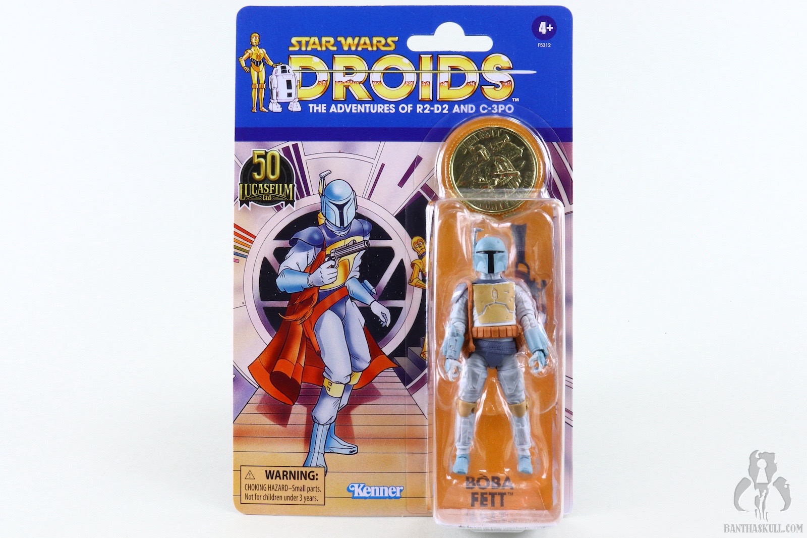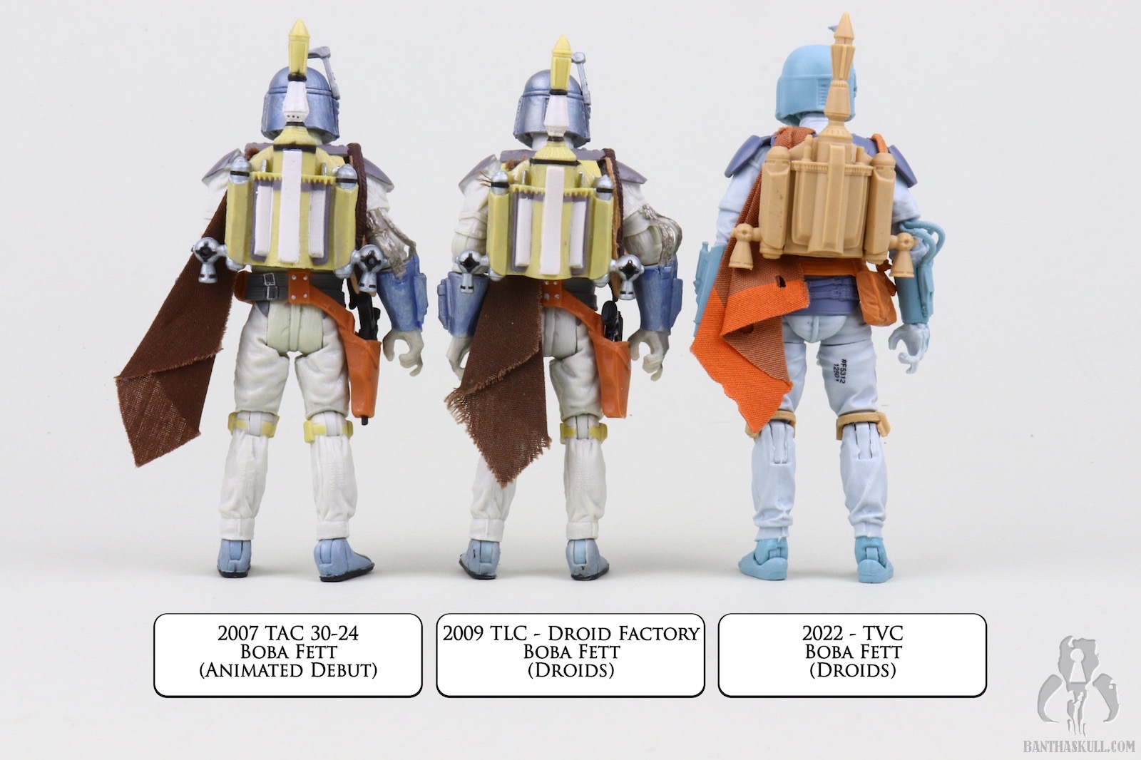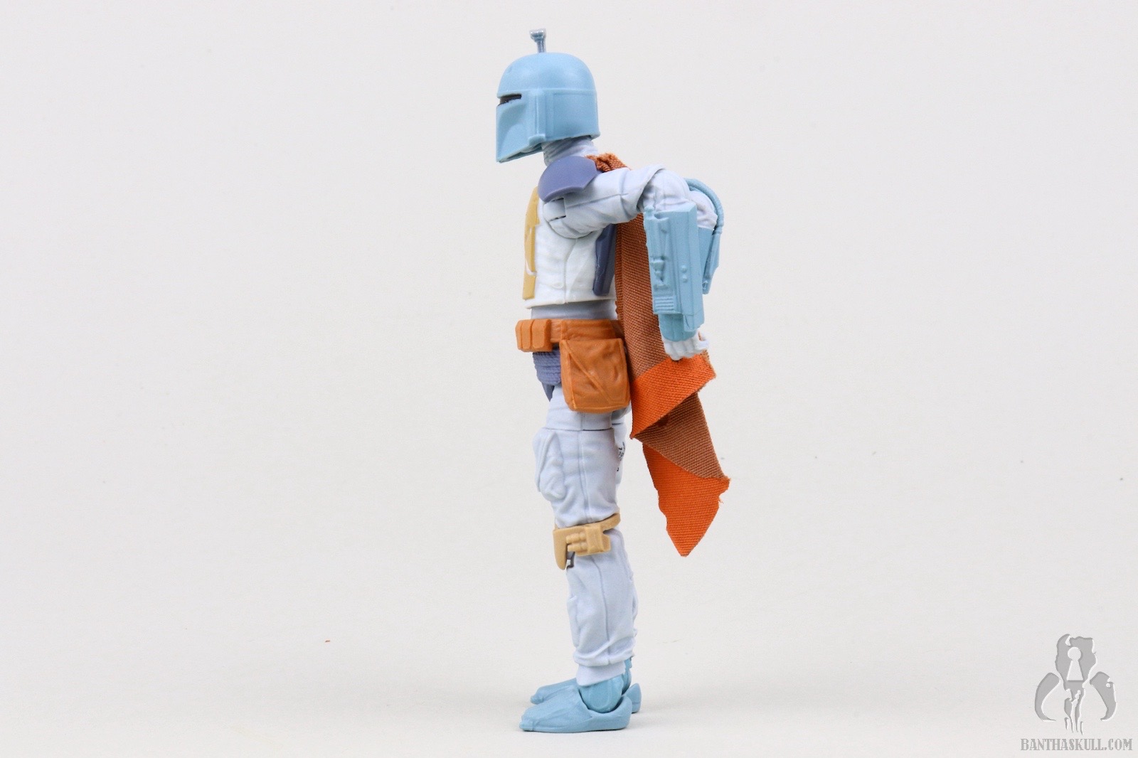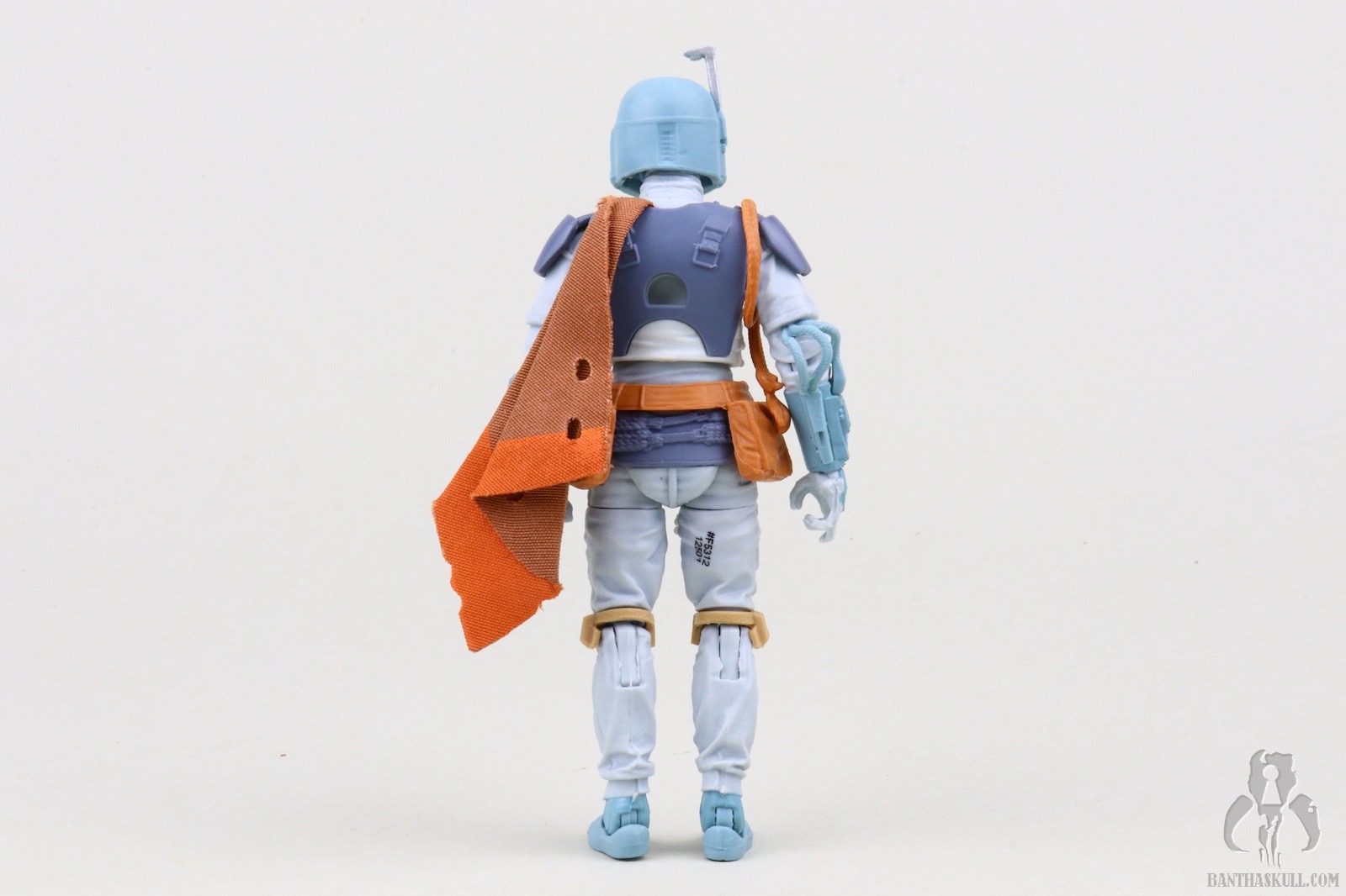 I guess I should spend a few sentences talking about the figure itself. This is a repaint of the landmark VC186 - Boba Fett. That means it’s not entirely accurate. In the cartoon, Fett wears more of an Episode V-style belt with a holster slung low on his hip. The figure has the pouch-laden Episode VI belt sans holster. The paint scheme, on the other hand, looks like it jumped right out of the screen. Previous Fetts based on the Nelvana animation took liberties to try to bridge the gap to a realistic Fett paint scheme. I love the purple-blue plastic used for the BlasTech EE-3 carbine. It’s another positive step toward the animated aesthetic. That VC186 release is graded a 10 out of 10, but I’m taking back one kadam Bantha Skull for the inaccurate belt. 9 out of 10.