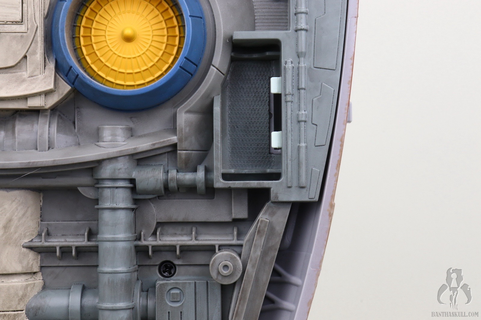 Here are the basic problems: The canopy does not stay open, which makes it annoying to try to put figures in the cockpit. The cockpit seats are terribly proportioned, and it’s not easy to get a figure to display properly (but it can be done). When the canopy is closed, it’s tricky to get it to snap shut correctly, so if you’re not paying attention, it can look “ajar.” Same can be said for the hinged side panel. It opens (but does stay open), however it doesn’t snap shut cleanly, so it looks a bit off. The included container/escape pod thing isn’t executed particularly well, as it barely holds a figure. The rear ramp, which is used in ESB to load the frozen Han Solo, is terribly designed so that figures can’t use it. The wings don’t stay fully engaged in the “flight” mode. It’s close, but they’re a bit off. And finally, it seems counterintuitive to have the carbonite block slide into the front of the ship. Not a terrible problem, but it’s just off from how we see it loaded in the film.