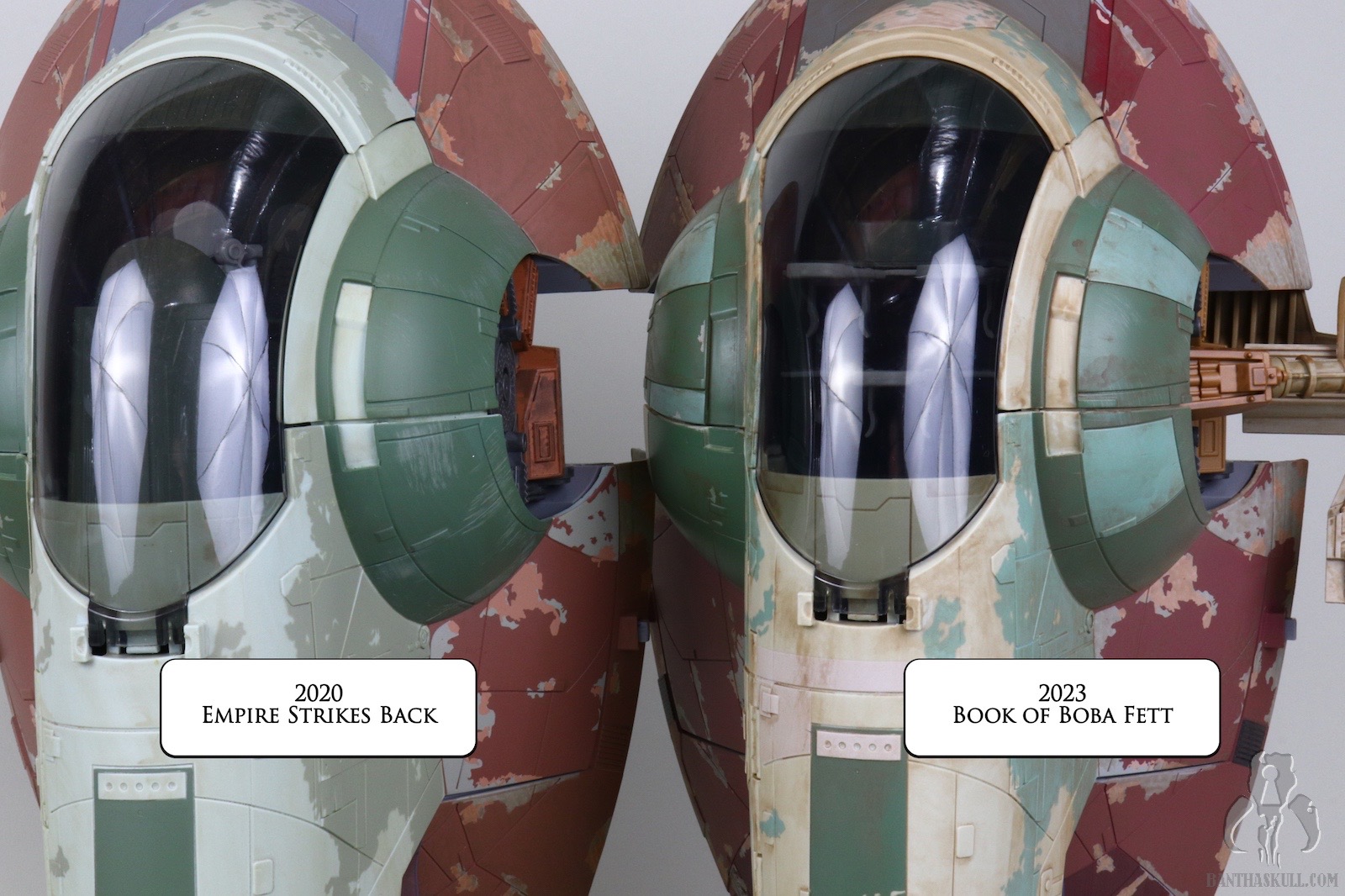 I won’t bury the lead, and get right to what you all want to know. While the mold is identical, this 2023 release is noticeably different from the 2020 release of Slave I. The most obvious change is that the entire ship has been given a light brown wash to approximate the accumulation of sandy grime as it sat in Jabba’s palace. It takes on a tan hue as a result, with the wash accumulating in the recesses and groves giving it a much dirtier appearance. I like it. It’s more used-universe-y. But the styling changes are not reduced to just adding a wash. There are other changes to the actual paint applications. If you notice from the comparison shots above, there are two changes on the wings. First the yellow has been replaced with brown. Second, the two outermost paint applications are no longer there and have been replaced with two new ones on the interior of the wing. Finally, the reddish brown paint around the engines has been swapped for blue. To me, these are significant enough changes to warrant picking up this release. I’m glad I got it, and I’m going to pair it with the upcoming Boba Fett’s Throne Room in my display. But it’s understandable if most don’t think the different paint scheme “juice” is worth the $200 “squeeze.”