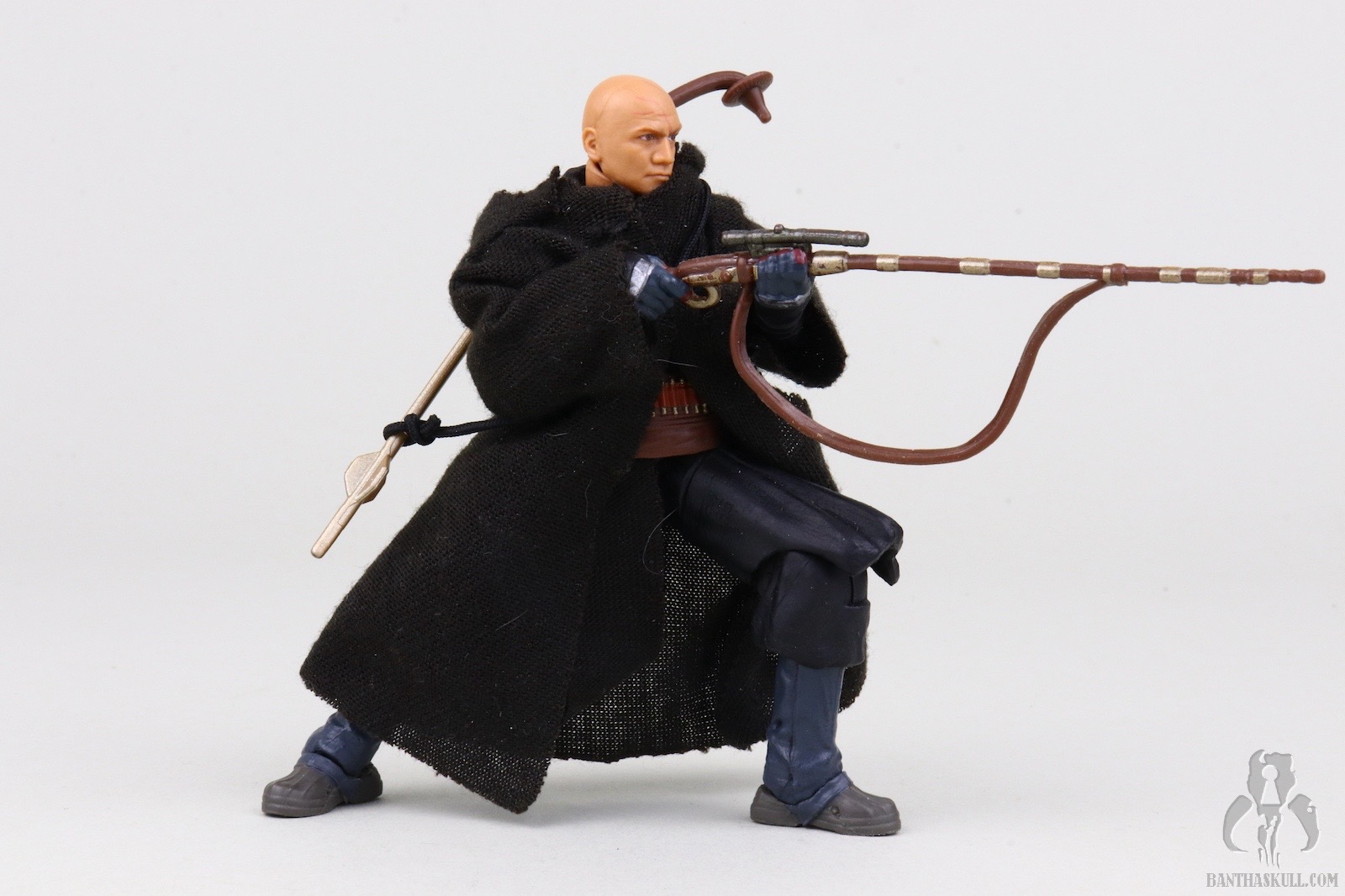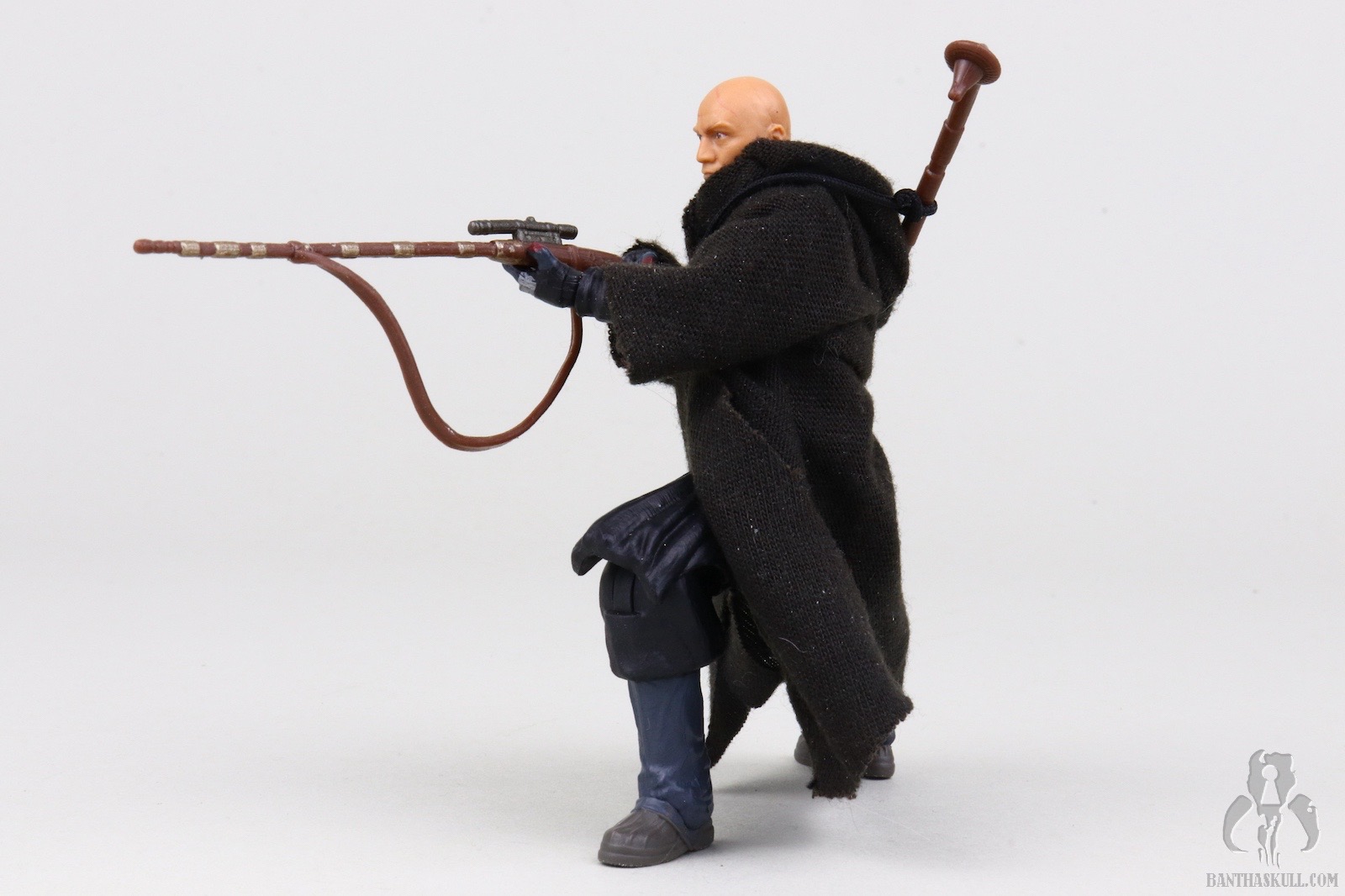 The articulation of the lower body is a dream, facilitated by the modern barbell hips and rocker ankles. Fighting crouches are easily achieved. I thought the bulkiness of the knee due to the sculpt would inhibit the range of motion, but it doesn’t. The arms are similarly well articulated, but I found the range of motion was less than perfect. Posing the figure with the cycler rifles is about as fun as a prostate exam. Part of the reason is that you almost need a purpose sculpted hand to properly hold the grip, but that would detract from all other functionality, so I’m glad Hasbro didn’t do this. Another reason for my difficulty in posing with the rifle is that the arms get impeded by the soft goods robes, but there’s nothing that can be done about that. The only way to execute this figure properly is with soft goods outer robes. Another familiar issue with cloth robe-ery at this scale is that the hood has a tendency to “bulk up” when trying to display it in the down position. Fortunately, when the cycler rifle or gaffi stick are slung across Fett’s back, they can be used to keep the hood in position.