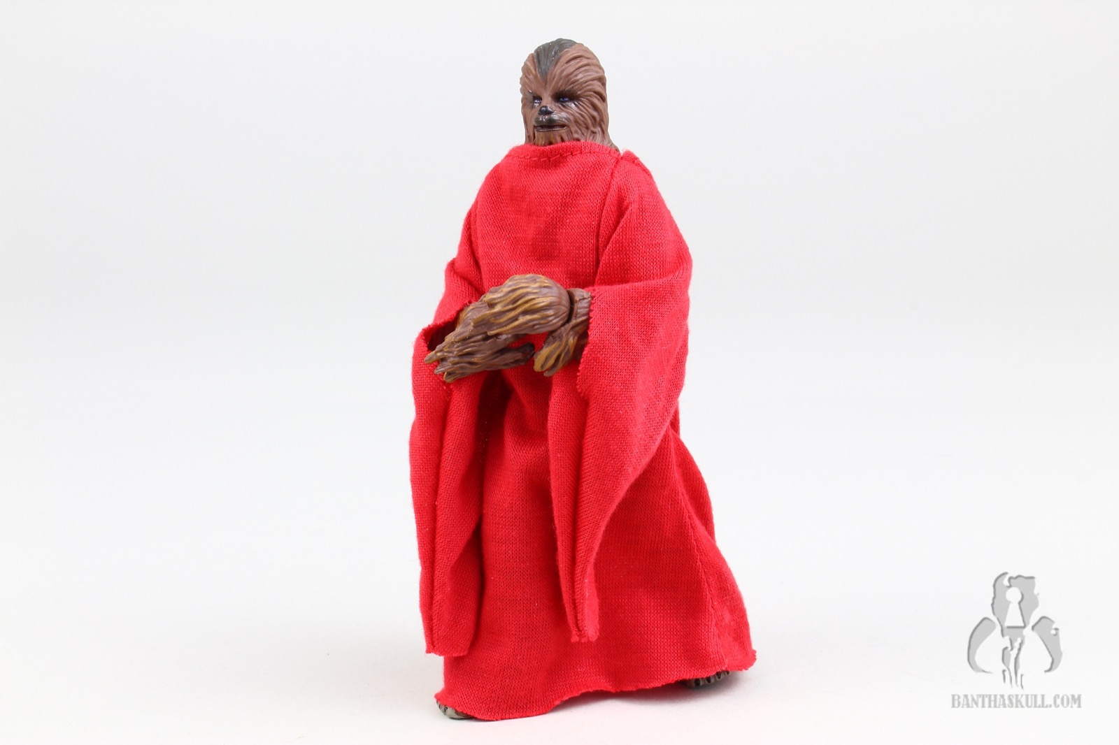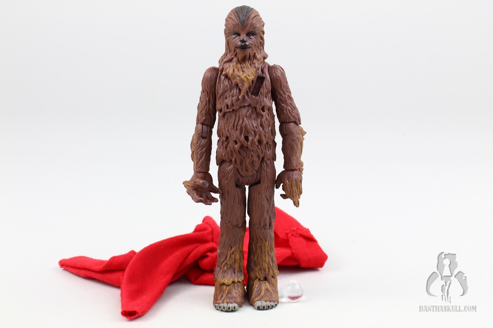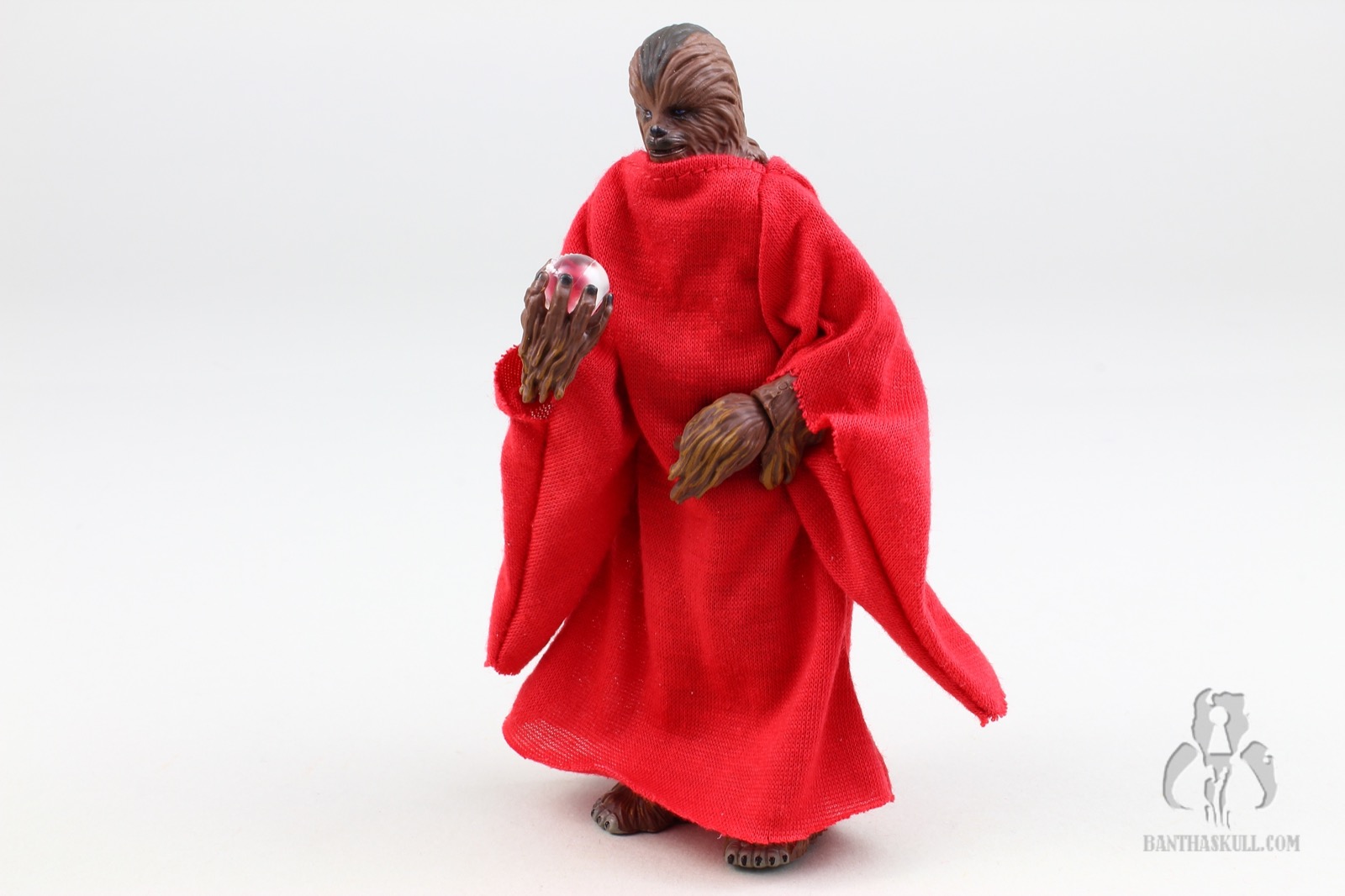 Another piece of newness is the included red robe. It is made out of a thin, but nicely draped soft goods material. The forearms hang very low, and are a bit reminiscent of Palpatine’s robes. They fit Chewy perfectly, and don’t really hinder the range of motion of the arms or legs. Perhaps if the figure had ball jointed hips, that might make a difference, but otherwise it’s very well done. Also included is the aforementioned Life Day Orb, which fits perfectly in Chewy’s open right hand. The bottom of the orb is flat, so that you can put it on a surface without it rolling away. Finally, there’s an all new paint job, which is distinctive from most of the other variants in the figure’s 20 year history.